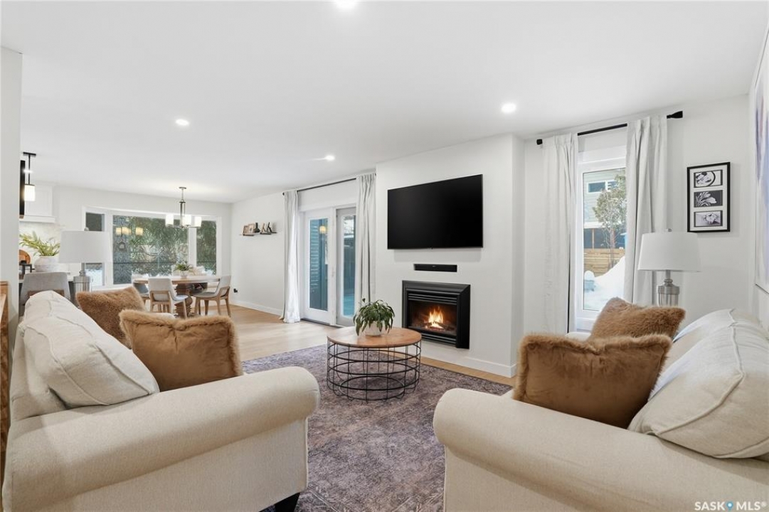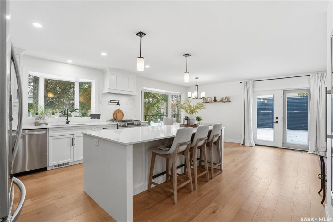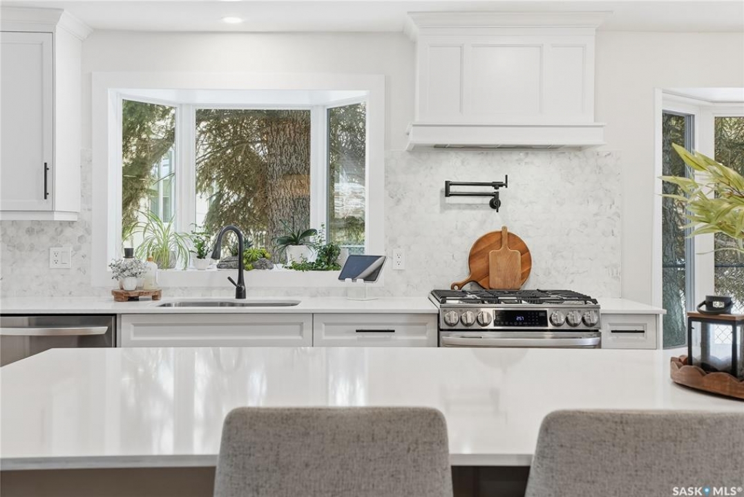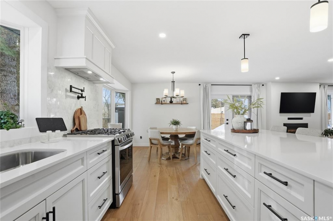 CHECK ON THE VIDEO ABOVE! Timeless style and exceptional craftsmanship define this stunning 2,691 sq. ft. bungalow in prestigious Lawson Heights, offering river views and overlooking Meewasin Trail. Welcome to 115 Whiteswan Drive, where a grand foyer with soaring ceilings creates an inviting first impression. Sun-filled living and dining areas showcase breathtaking views and feature a striking custom warm-toned wood feature wall with a sleek linear gas fireplace, ideal for both everyday living and entertaining. Beautiful new warm-coloured hardwood flooring flows throughout the main floor, enhancing the home's elegant, cohesive design. A private main-floor office with glass doors is perfect for working from home. The executive kitchen impresses with white cabinetry, an expansive island, quartz countertops, and a fully equipped butler's pantry with all new stainless steel appliances, including double refrigerators, double ovens, gas stove, beverage fridges, tall wine cooler, and warming oven—designed for hosting and convenience. The breakfast nook features a south-facing window seat, while the adjoining family room opens to outdoor living. The spacious primary bedroom (19' x 13') offers a large walk-in closet and a spa-like 5-piece ensuite. Two additional well-proportioned bedrooms share a 5-piece bath, along with rare main-floor storage and extra cabinetry. The newly fully developed lower level provides a wet bar, extra bedroom, bright 3-piece bathroom, gym/exercise space, and generous storage. Mechanical upgrades include a high-efficiency furnace and on-demand water heater. Enjoy breathtaking sunrise views from the front of the home, then unwind in a sun-filled, private backyard retreat featuring a privacy wall, stamped concrete patio, stunning brick fireplace, tranquil water fountain, lush landscaping, brand new fencing, and a shed—a truly secluded oasis.