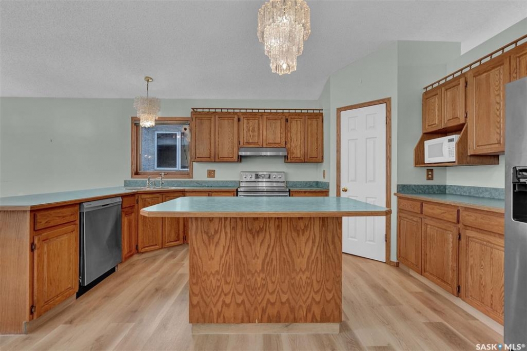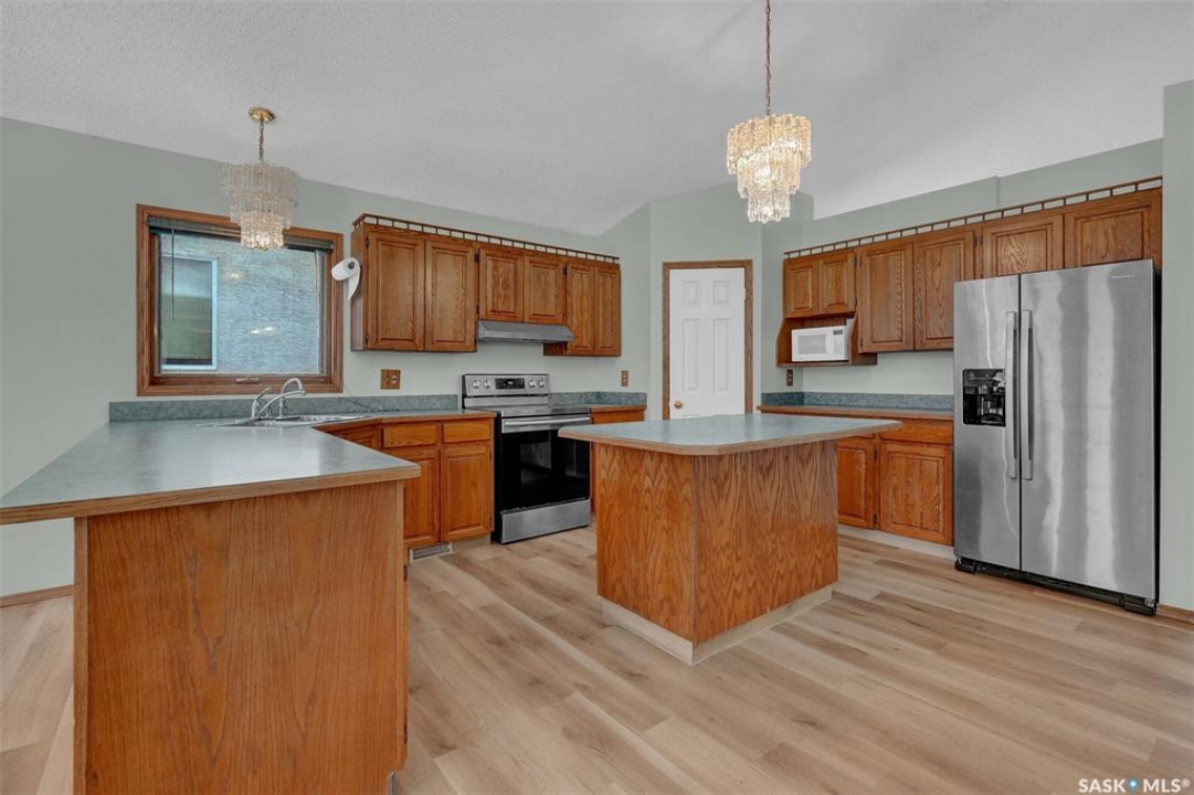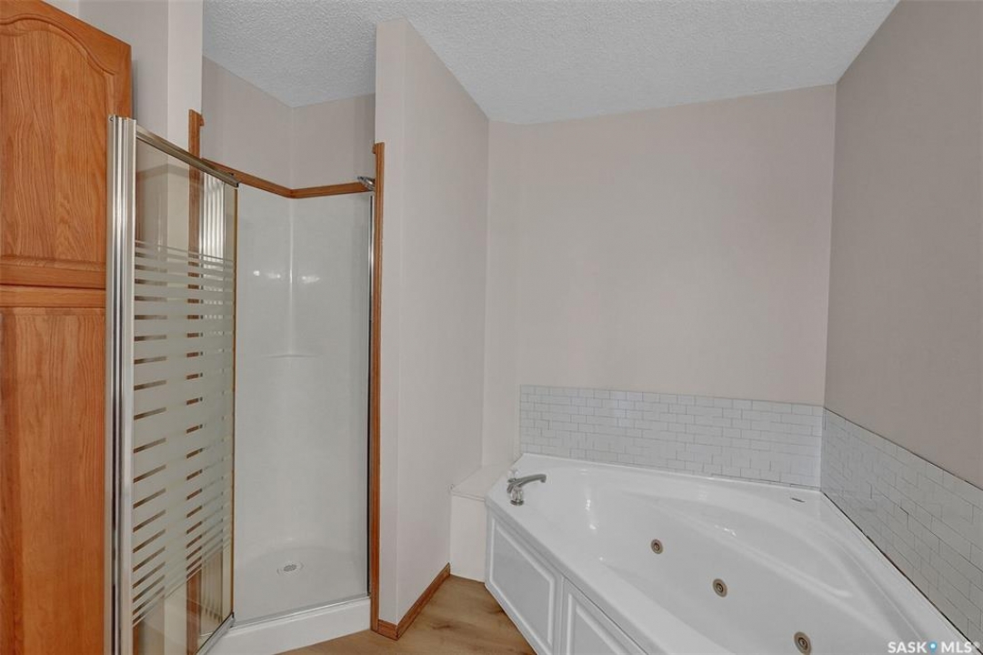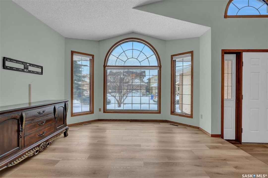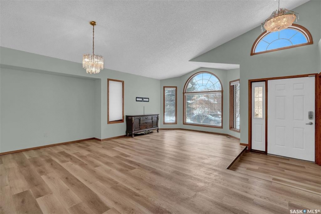 Welcome to this spacious 1,750+ sq ft bungalow located in the highly desirable Wascana neighborhood. This 5-bedroom, 3-bathroom home features a unique design and numerous upgrades, including newer vinyl plank flooring throughout the main floor and vaulted ceilings in the living room, former dining room, and kitchen. The generous front living room, combined with a formal dining area, is highlighted by a large arched window that fills the space with natural light. The kitchen offers an abundance of oak cabinetry, a walk-in pantry, and a center island, making it both functional and inviting. A garden door off the dining area leads to a composite deck with glass and aluminum railings, overlooking a private backyard. The main floor includes two good-sized bedrooms, plus a spacious primary bedroom complete with a large ensuite featuring a separate shower and jetted tub. An additional updated 4-piece bathroom is conveniently located near the main living area. A mudroom with laundry completes the main level. An elegant open staircase leads to the fully developed basement, where large east-facing arched windows provide excellent natural light. The lower level features a huge recreation room, game room, three additional bedrooms, a 4-piece bathroom, ample storage space, and a cold room. The double attached garage is insulated and heated. Situated on a quiet cul-de-sac with friendly neighbors, this home is not to be missed. Recent upgrades include: main floor flooring and one of the main floor bathroom, newer fridge, and dishwasher.