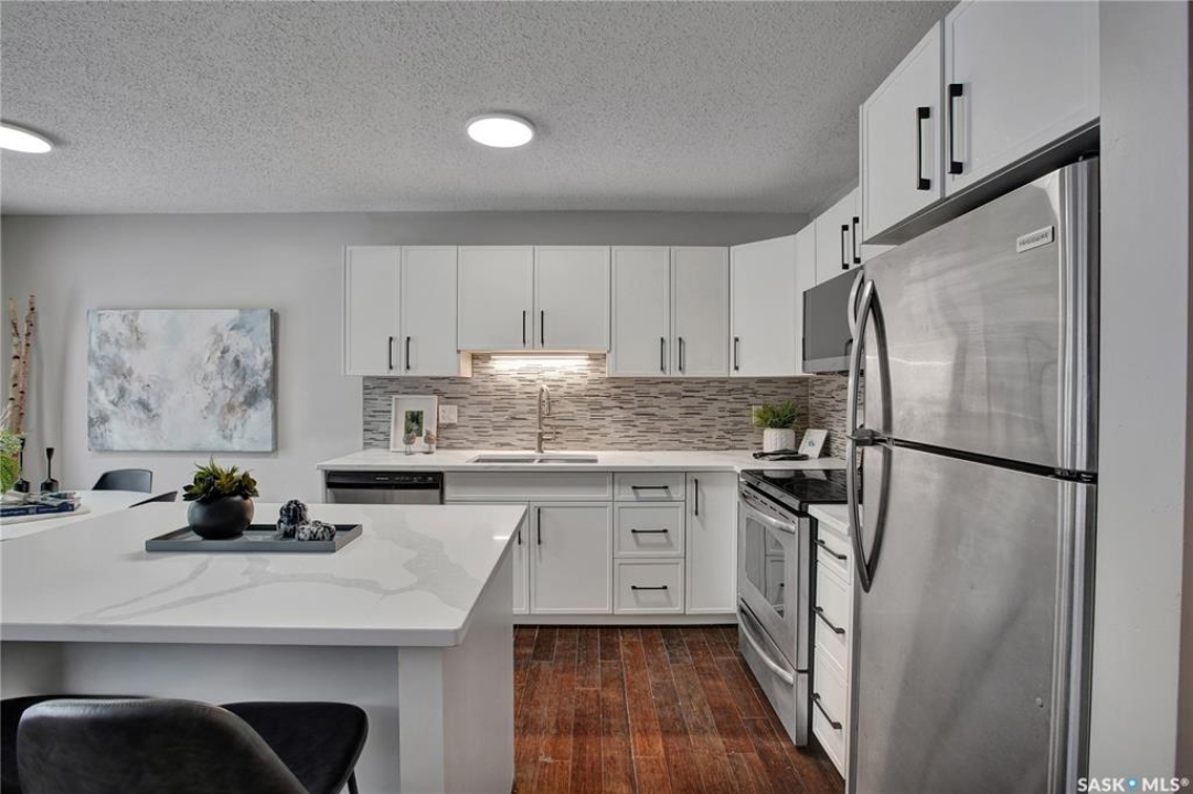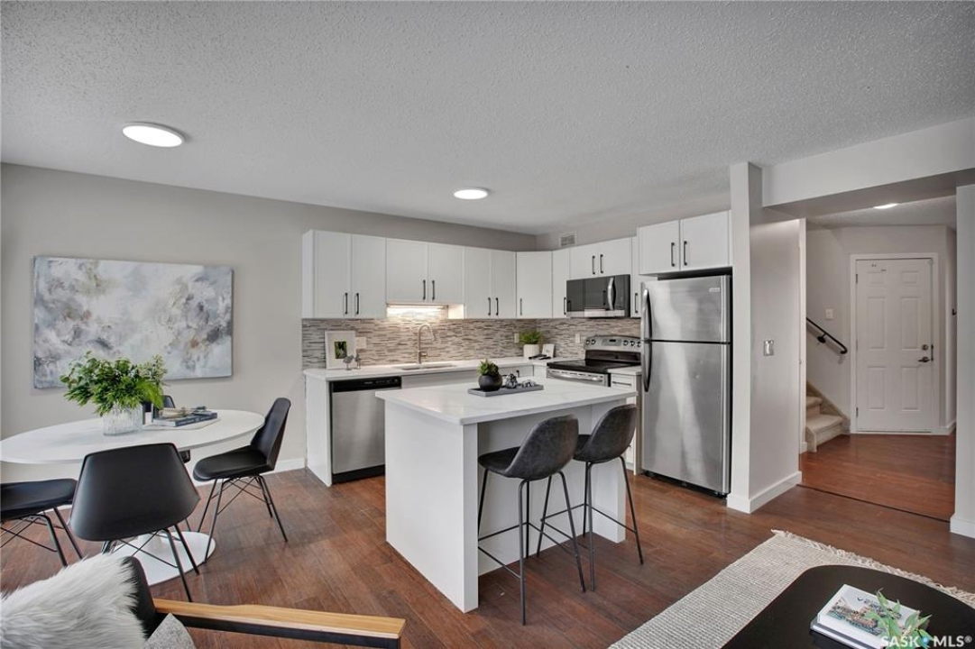 Move-in ready townhouse in sought-after Rosewood offering - 1,245 sq. ft., 3 bedrooms, 3 bathrooms, finished basement and a single attached garage. Recent upgrades include a bright white kitchen with brand new cabinets and granite countertops, plus a brand new furnace for added peace of mind. The main floor features a 2-piece bathroom, open living room, and a dining area with direct access to the back patio—perfect for BBQs and outdoor entertaining. Upstairs you'll find the primary bedroom with a bright walk-in closet, plus two additional bedrooms, and a spacious 4-piece bathroom conveniently accessible from both the primary bedroom and hallway. The fully finished basement offers a comfortable family room, 2-piece bathroom with laundry, and a separate mechanical room. Condo living keeps things simple with snow removal and lawn care included, making this a stylish, low-maintenance home in an excellent neighbourhood.