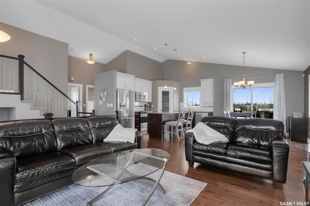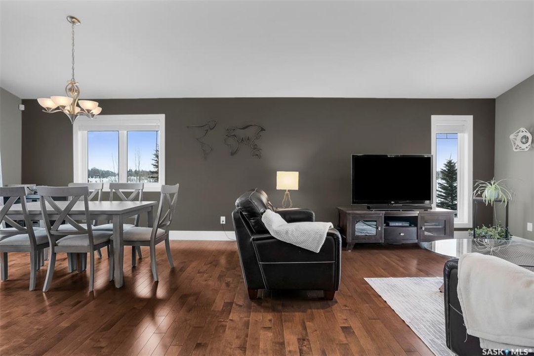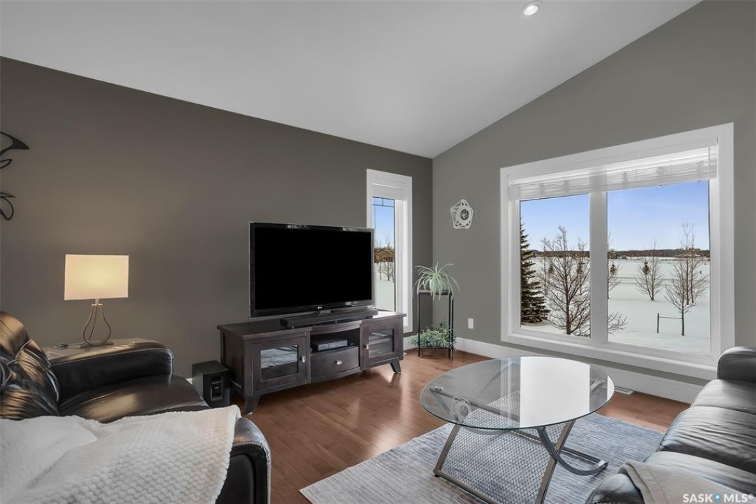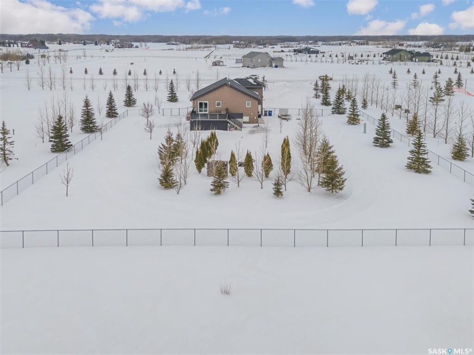 Escape the city without sacrificing convenience in this beautifully finished acreage just minutes south of Saskatoon. This home is set on a spacious 3.51-acre parcel with a fenced yard, shed, large under-deck storage area, outdoor fire pit and room to build your dream shop. Step inside to a bright, open-concept main living area where soaring vaulted ceilings and expansive windows flood the home with natural light. Rich hardwood floors create warmth and continuity throughout, while the thoughtfully designed layout makes both everyday living and entertaining effortless. The heart of the home is a stunning kitchen designed to impress, featuring granite countertops, sleek stainless steel appliances, a corner pantry and a large island with seating. The adjoining dining area opens onto a large maintenance-free deck, seamlessly extending your living space outdoors — perfect for summer barbecues Two additional bedrooms and a 4pc bathroom round out the main floor. The primary bedroom serves as a private retreat with plenty of room to relax, while the beautifully finished bathroom showcases granite countertops. The fully developed lower level significantly expands your living space with a large family room featuring a natural gas fireplace. A cozy and bright bedroom and 3pc bathroom with tiled rain shower complete the basement. Laundry is nestled in the mechanical room.This acreage offers great convenience with a public water line, fibre internet and school bus pick up at the driveway.