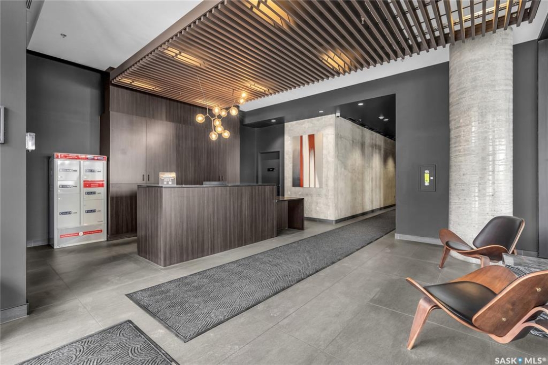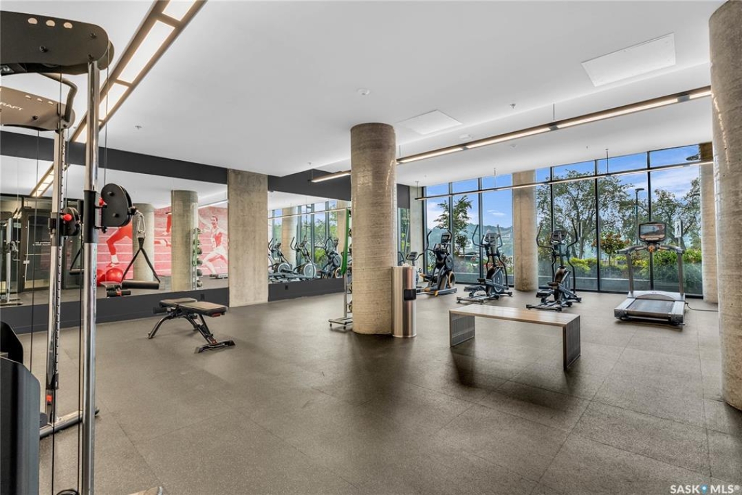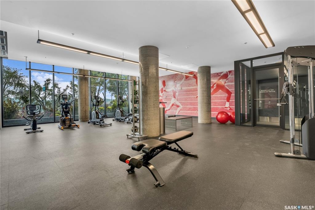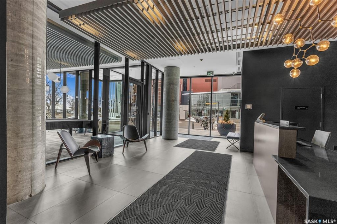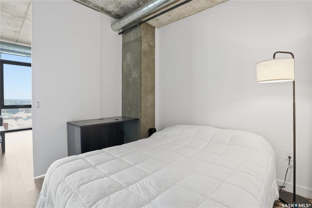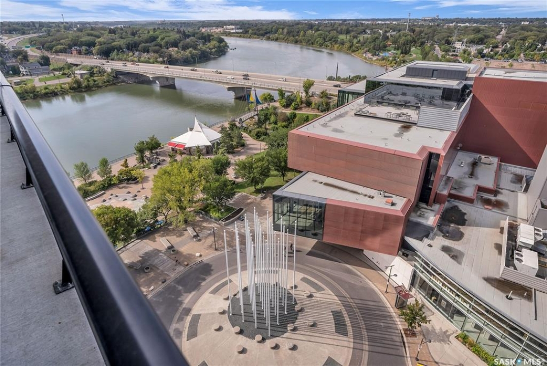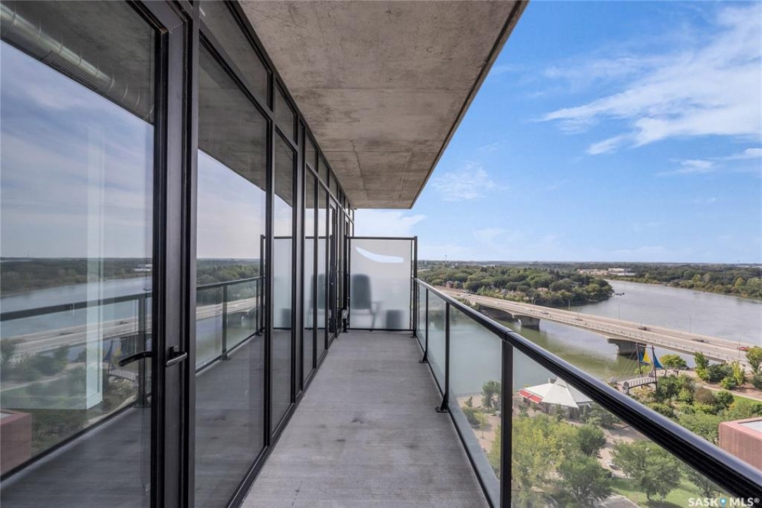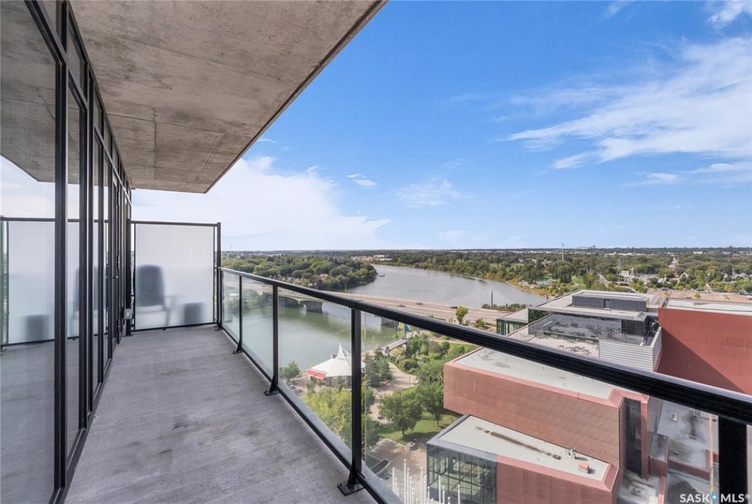 Stunning 13th floor unit at No. 1 River Landing, featuring an expansive view of Saskatoon's downtown, River Landing Park and the South Saskatchewan River. Great layout with 9 ft concrete ceilings, kitchen with quartz counters and stainless steel appliances, 2 bedrooms + den and two bathrooms. Primary bedroom has direct access to the balcony and features a walk-thru closet open to your ensuite with a tiled shower. Second bedroom has a large closet and sliding door entry. Laundry (new washer & dryer!) and additional bathroom are tucked away from the main living space. The floor to ceiling windows run along the whole west side of the unit in the primary Bedroom and spacious living room. This home has central air conditioning, underground parking, storage space, gym and amenities room with pool table and kitchenette. Located just steps away from the river, Remai Modern, many local restaurants, the movie theatre and Midtown Mall. Easily access all downtown amenities and Circle Drive ensuring you're well-connected.