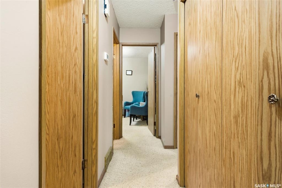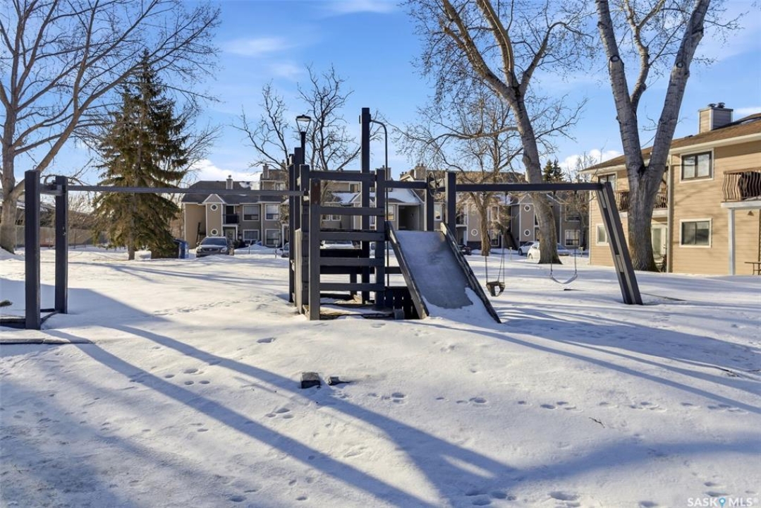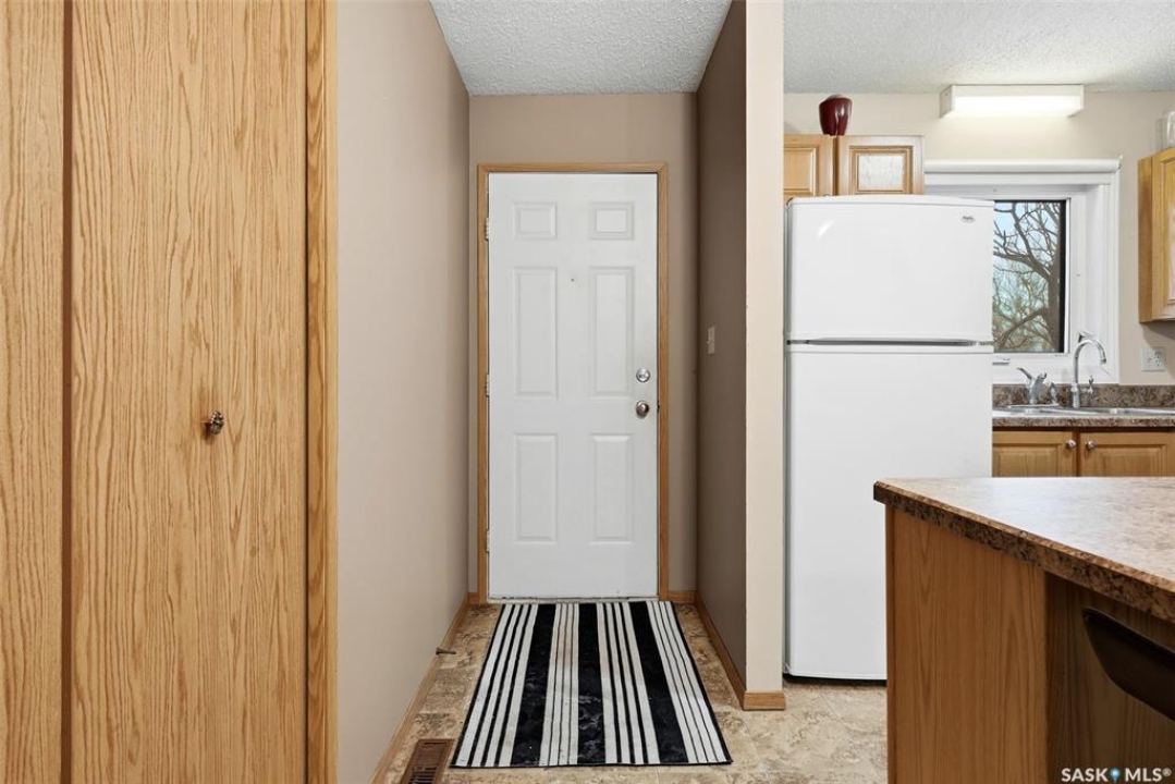 Welcome to 114 Cedar Meadow Drive! This bright and inviting second-floor condo has both a front entry and a private rear balcony. This well-designed unit benefits from extra natural light and offers a comfortable, functional layout throughout. Upon entry, you are welcomed into a spacious living area featuring a cozy fireplace (currently not in use), providing an ideal setting for relaxing or entertaining. The adjoining kitchen showcases a functional island, a double sink overlooking the front of the complex, and an abundance of cabinetry, including a pantry-style cupboard with convenient rollouts. Appliances are included with over-the-range microwave, stove, and fridge. The kitchen is finished with durable linoleum flooring. Storage is plentiful with a coat closet at the front entrance, a hallway linen closet, and an additional closet also housing the water heater and softener. The primary bedroom is generously sized and can comfortably accommodate a king-size bed, featuring his-and-hers closets for ample storage. Both bedrooms and the living room are finished with carpet for added comfort. This condo also includes its own dedicated laundry room with washer and dryer, plus extra storage space. A four-piece bathroom serves the unit, and the second bedroom offers adequate space for guests, a home office, or additional living needs. Condo fees include furnace and air conditioning maintenance, adding extra value and peace of mind. The unit measures approximately 870 square feet, and quick possession is available! Families will appreciate the conveniently located play area situated just behind the building. The parking stall is ideally positioned right out front for easy access. Additionally, there is a separate furnace room on the front deck that also provides a bit of extra storage. A practical, well-located condo offering comfort, convenience, and move-in readiness!