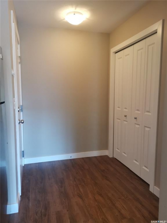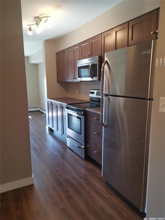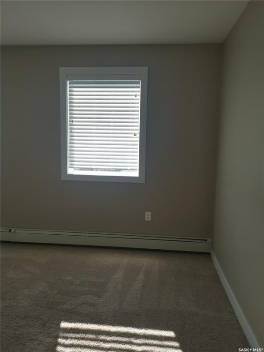907 sq.ft. corner unit faces South/West in one of the newest Condominium buildings in Estevan. This unit is open concept featuring brown laminate flooring throughout the entrance, kitchen, dining and living room. Spacious master bedroom with large windows to let in natural light, walk in closet and 3 pc bathroom with a walk in shower. There is a large spare bedroom and full bathroom and laundry. Off the living room is a nice sized balcony to enjoy this coming summer. One underground parking is included. Call to view!!