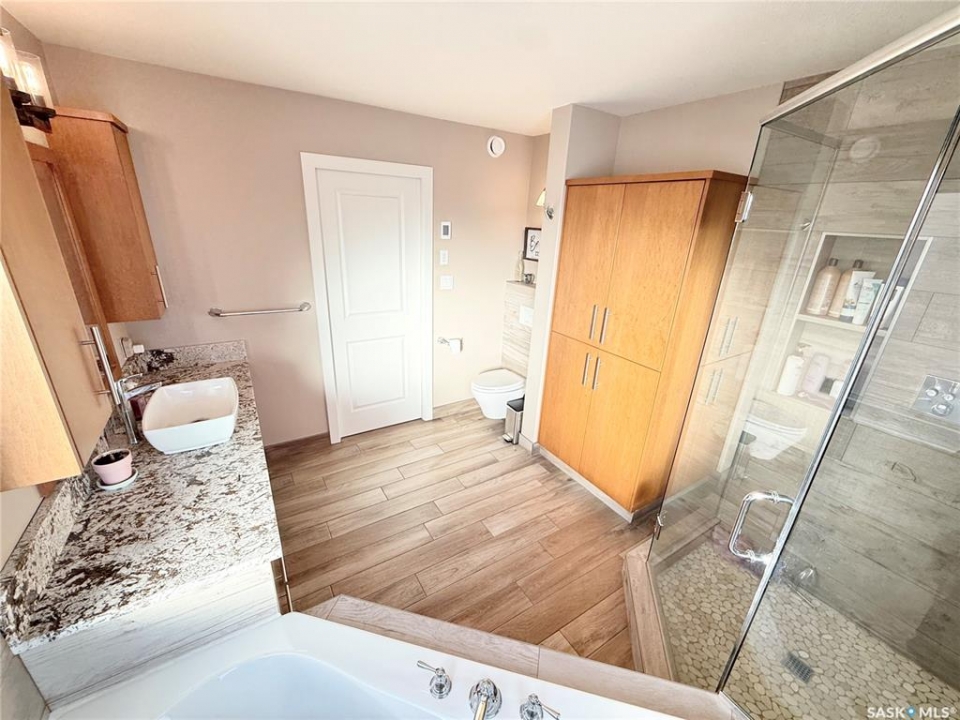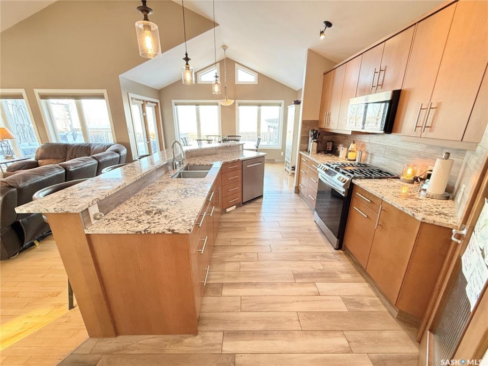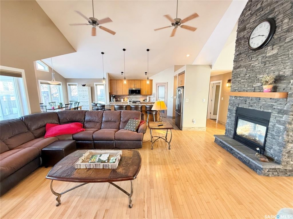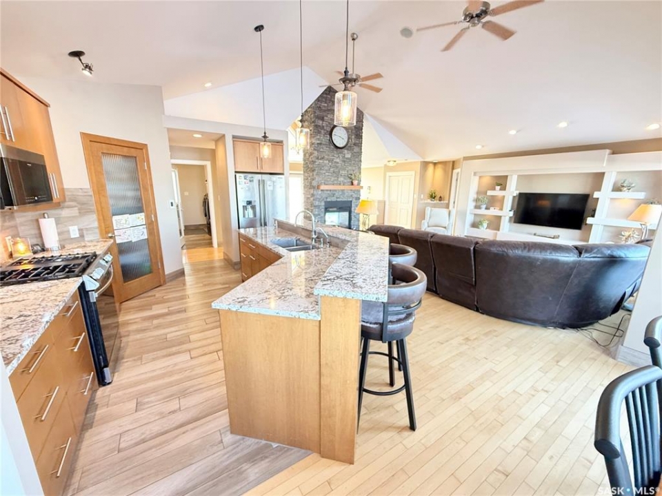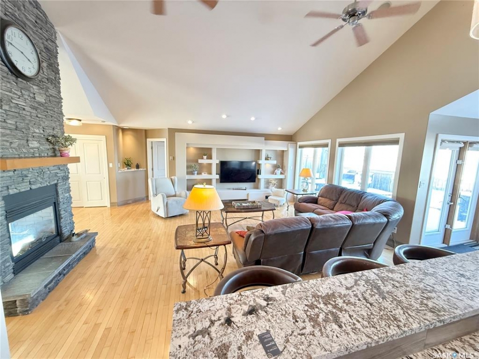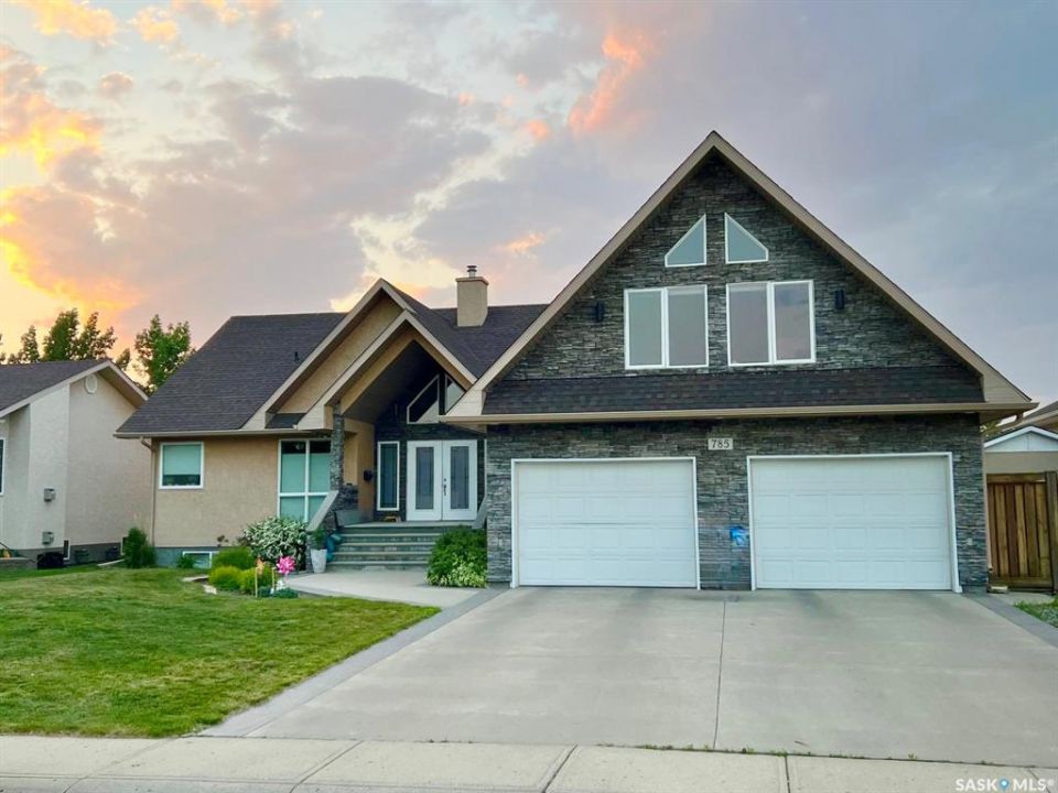 Welcome to 785 Washington Drive — a stunning custom-built bungalow on the edge of Weyburn with wide-open prairie views. This A-frame style home offers tonnes of living space with a bright, open main floor centered around a show-stopping floor-to-ceiling stone fireplace. The great room flows beautifully into the kitchen and dining area, complete with custom cabinetry and massive windows that bring the outdoors in. The primary suite is its own retreat with deck access, walk-through closets, and a spa-like ensuite. Two additional bedrooms, a full bath, and a large bonus loft space round out the main level. Downstairs, the huge in-floor heated basement offers endless options for entertaining, workouts, media space, plus two more bedrooms and a flex room. Outside, enjoy the two-tier deck, custom pergola with swing, underground sprinklers, and gas hookups — perfect for relaxing or hosting. This home has seen extensive updates, including granite countertops, updated flooring, custom shower, new shingles, fresh paint throughout, new lighting, high-efficiency furnace, on-demand water heater, and more. Big home, beautiful views, and tons of upgrades — this one truly has it all. Reach out to your favourite Agent to book your private showing.