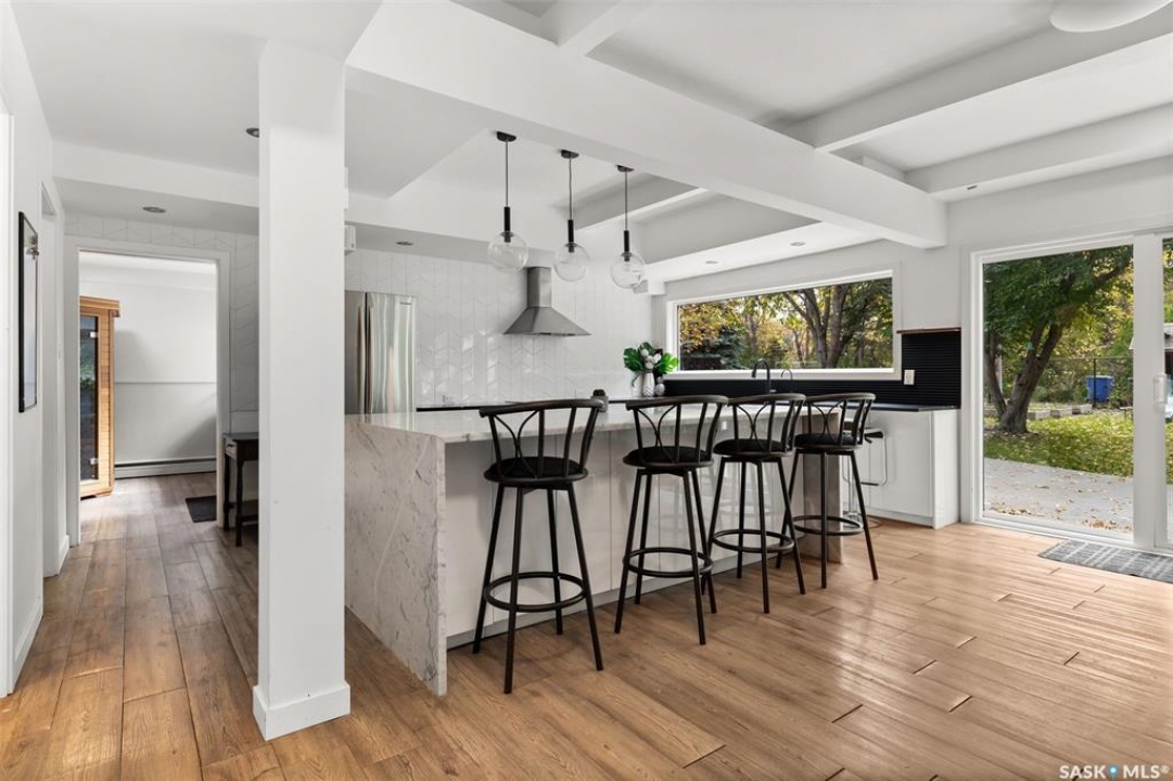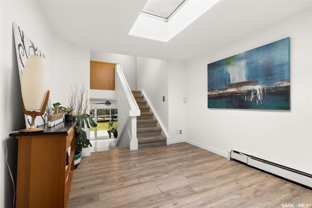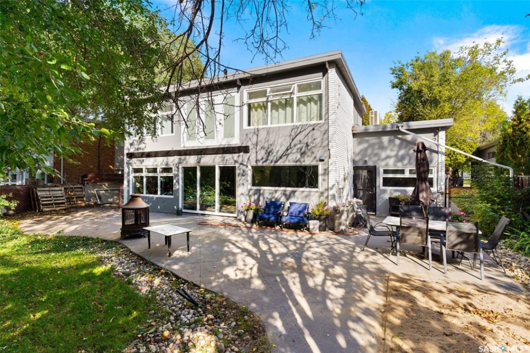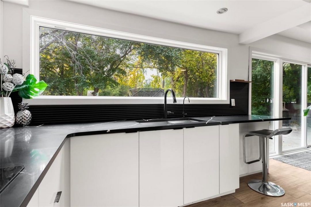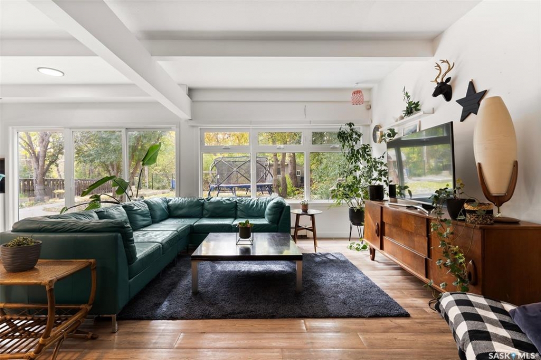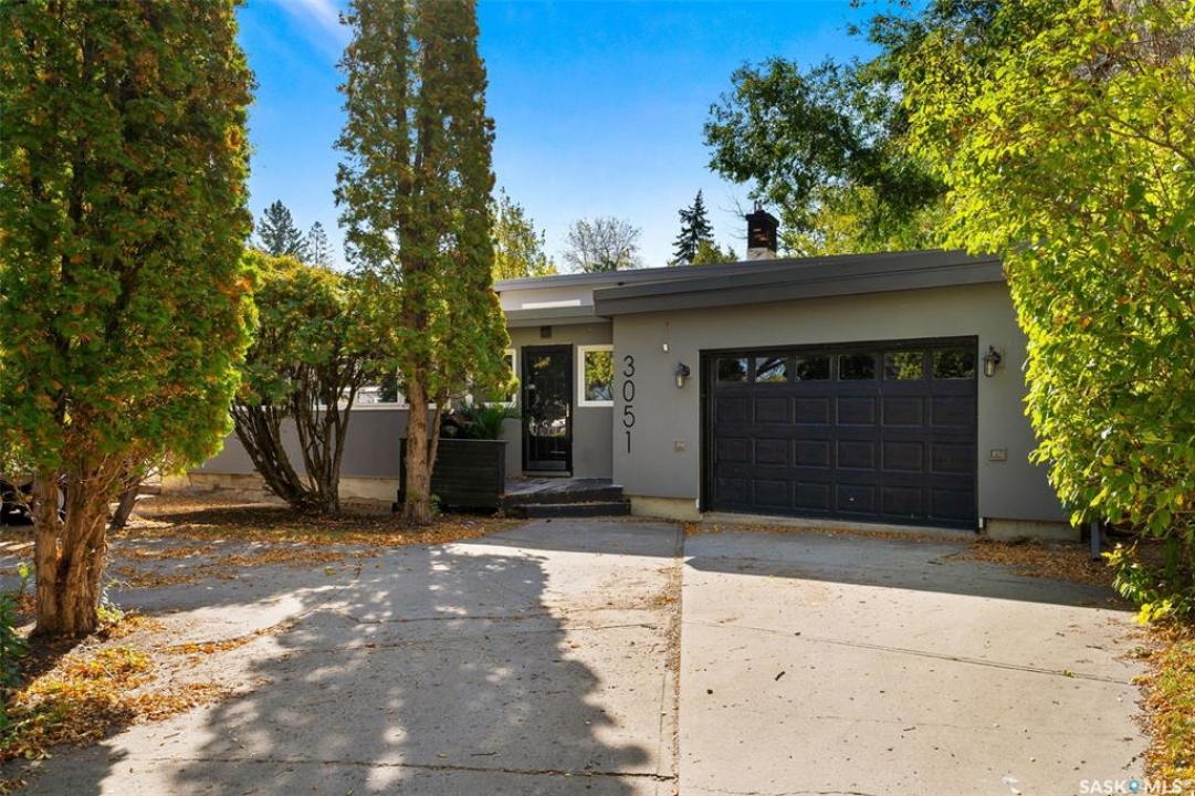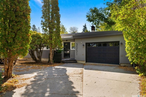 Welcome to 3051 Quinn Drive, a beautifully updated mid-century modern home in Regina's desirable Arnhem Place neighbourhood. This rare property is steps away from the lush green spaces of Wascana Park, offering unmatched access to walking trails, playgrounds, and the lake just steps from your door. This split-level home boasts over 2,500 sq. ft. of living space with an open-concept design, exposed beams, and oversized windows that fill the home with natural light. The stylish kitchen features quartz countertops, modern cabinetry, stainless steel appliances, a gas range, and a large island with seating. Multiple living areas, including a sun-filled living room and lower-level family/media room, provide flexibility for both relaxation and entertaining. The home offers 3 bedrooms and 3 bathrooms, including a spacious primary suite and updated spa-like bathrooms. A sauna, versatile recreation spaces, and contemporary finishes enhance everyday comfort. Outdoors, the private backyard is a true retreat with mature trees, a large patio, raised garden beds, and room for kids to play. The property also includes a double attached garage and additional driveway parking. Located in one of Regina's most sought-after areas, you'll enjoy the perfect balance of nature and convenience, with schools, downtown, and amenities all nearby. Don't miss this opportunity to own a one-of-a-kind home in an incredible park-side location!