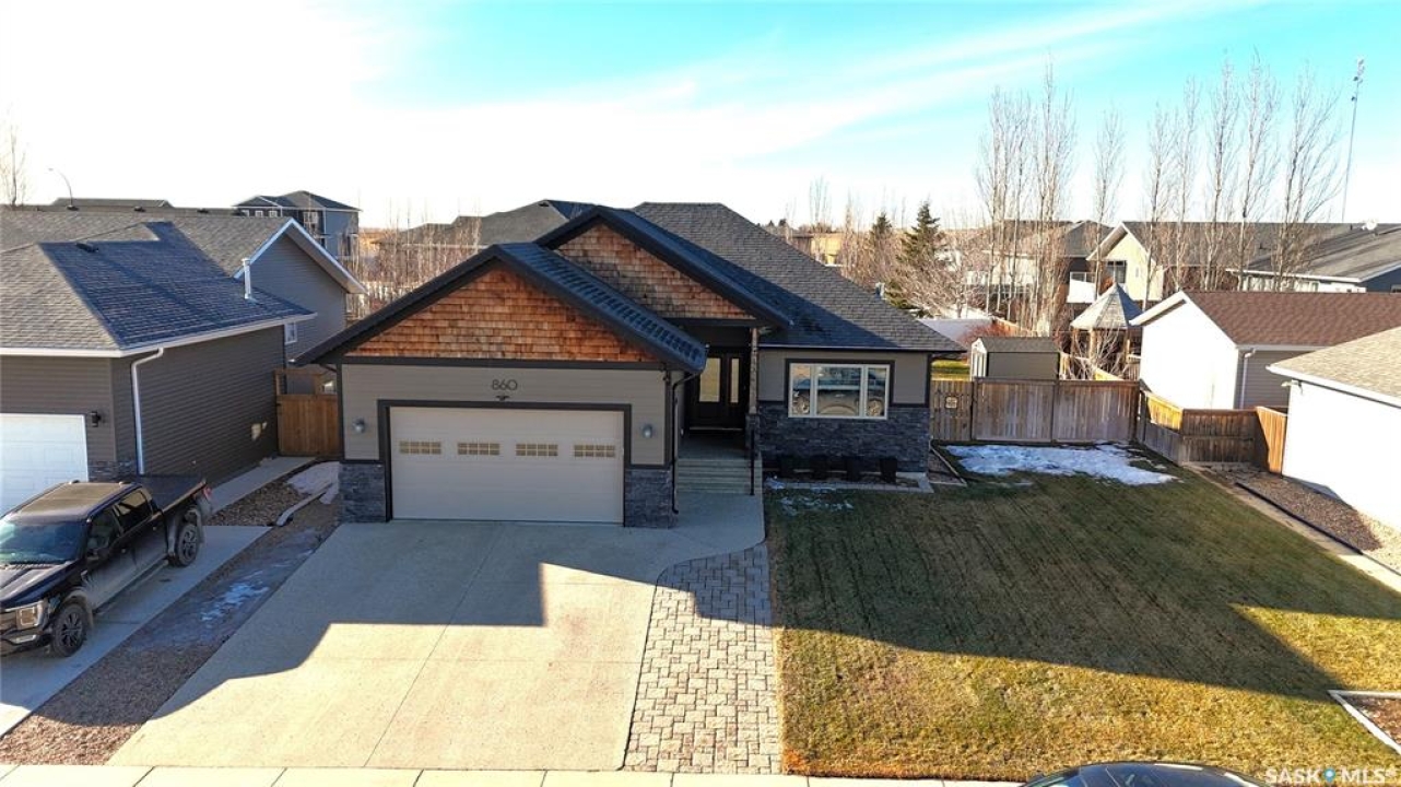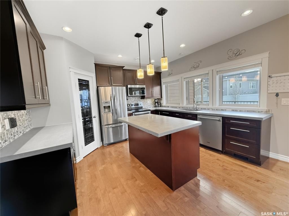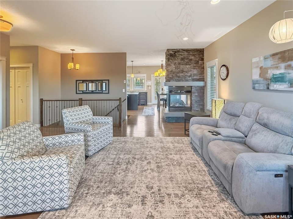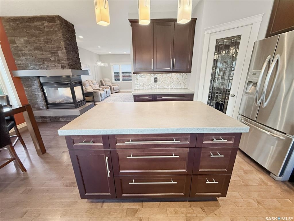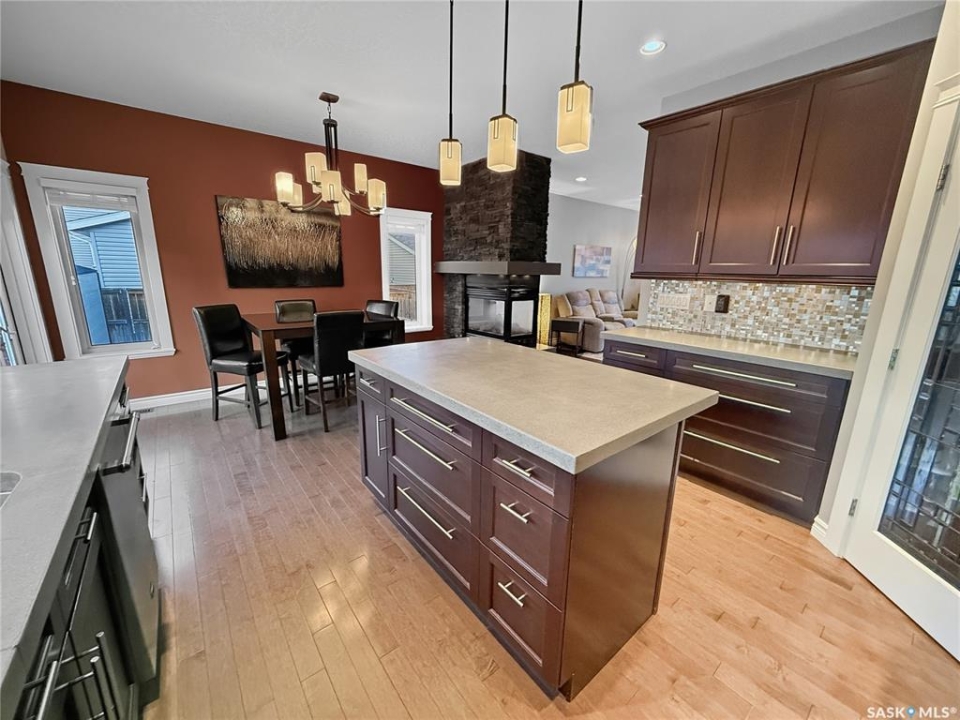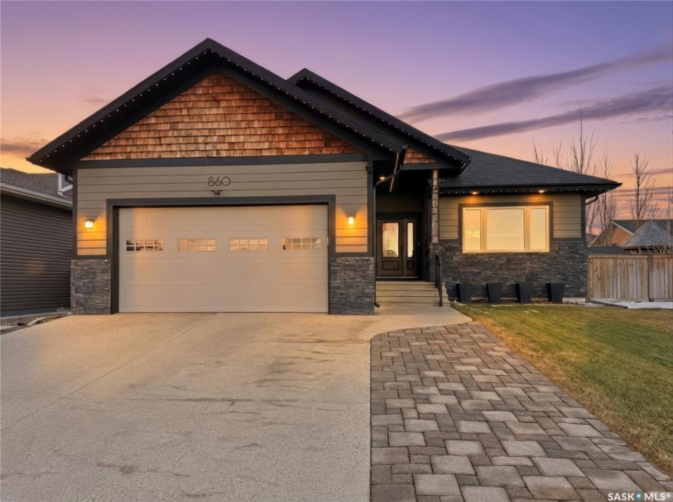 Located in the highly sought-after Highland subdivision, where demand continues to outpace supply, this 2013-built bungalow is one buyers will move quickly on. Offering 1,414 sq ft, outstanding curb appeal welcomes you with Hardie board siding, stone accents, an exposed aggregate driveway, and a Wi-Fi enabled Celebrite exterior lighting package that adds stunning evening ambiance. Inside, an open-concept layout showcases engineered hardwood flooring and a front living room that flows seamlessly into the kitchen and dining area, anchored by a double-sided gas fireplace with a concrete mantle, creating warmth and visual interest throughout the main living space. The kitchen is filled with natural light from three west-facing windows plus a garden door and features concrete countertops and island, abundant cabinetry, corner pantry, under-cabinet lighting, and a full stainless steel appliance package. The dining area enjoys the second view of the fireplace and provides direct access to a covered deck, with steps down to a patio and fully fenced yard complete with a shed and two natural gas hookups—ideal for a BBQ and fire table. The main floor offers three bedrooms, including an oversized primary with walk-in closet and a spa-inspired ensuite featuring a jet tub and in-floor electric heat, plus a second four-piece bath. A main-floor laundry/mudroom leads directly to the heated double attached garage. The lower level is fully developed with a bright, oversized family room featuring large west-facing windows, a dry bar, two additional bedrooms, a refreshed three-piece bath, and a spacious utility/storage room with modern, energy-efficient mechanicals including a new hot water heater (September 2025). A true Highland gem in a low-inventory market—this home checks every box.