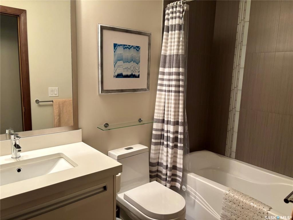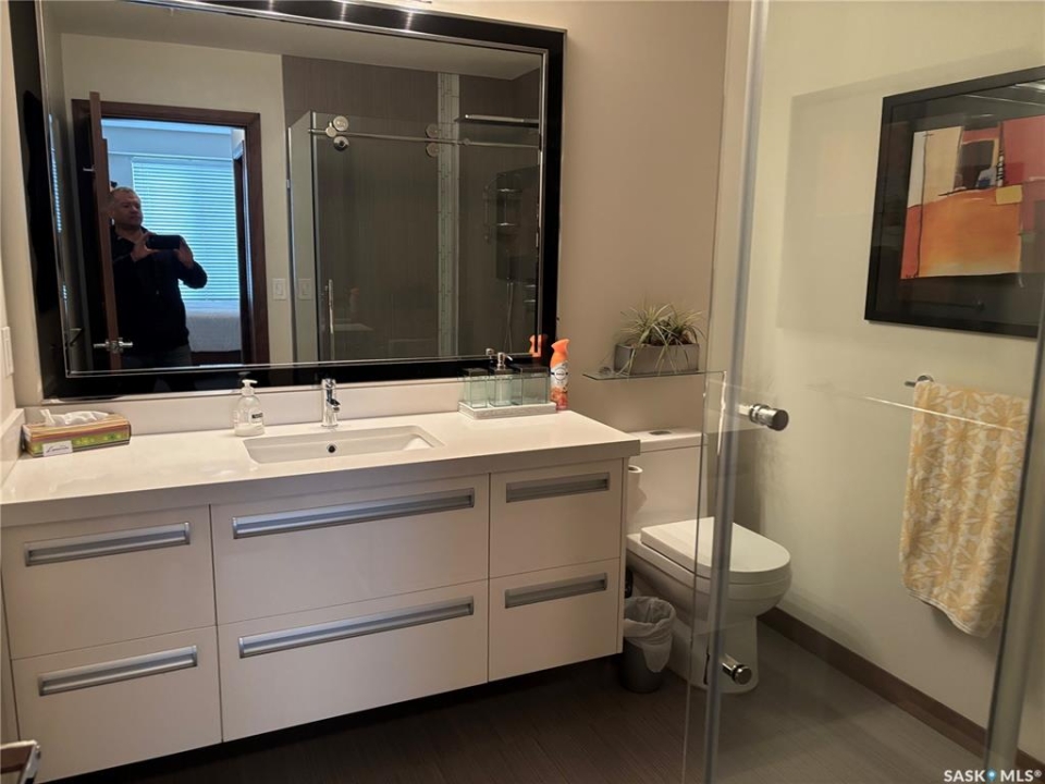 Wow! Here's your chance to own a Mint condition unit in Regina's Exclusive Riverbend district, in the fabulous Aura. Surrounded by water features, you'll love the long list of extras that this Condo offers. 9' Ceilings, Engineered Hardwoods, New York Style cabinets and Quartz Counters accent the Kitchen, with 2 Bedrooms with separate bathrooms off the spacious Living Room. The spacious Master offers plenty of Walk through Closet space and an Elegant Ensuite Bath! Look at the Amenities and compare! Luxurious Indoor pool and Hot Tub, Gym/Exercise Area, Amenities room and Lounge area. This unit includes 1 Surface parking stall. Don't miss out! Call Today!