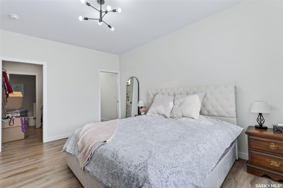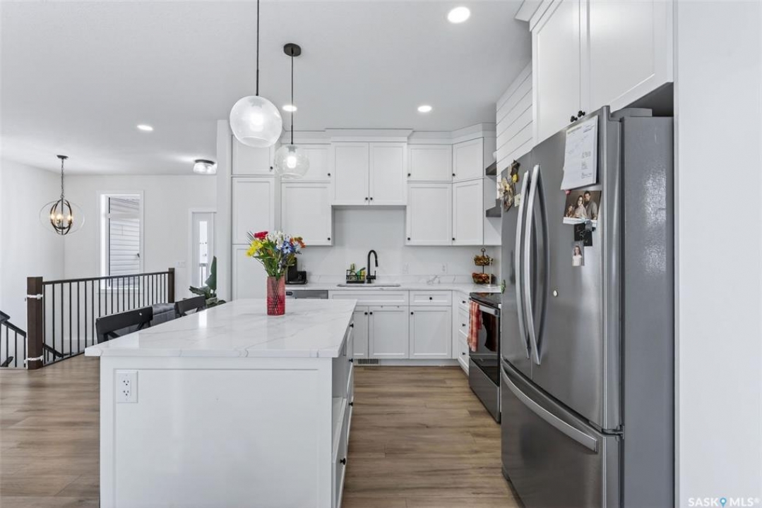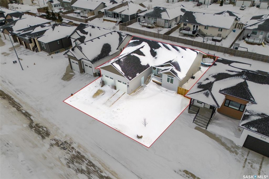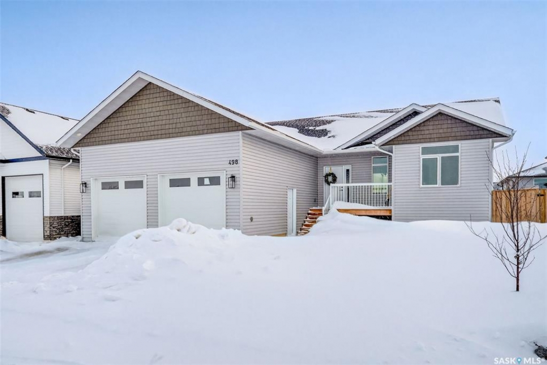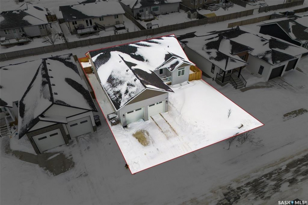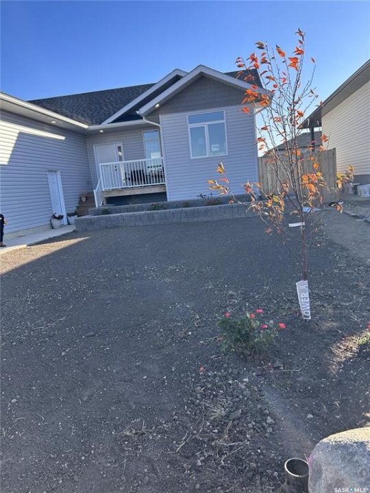 Welcome to this stunning dream home located in one of Humboldt's most sought after neighborhood! This 2023 built raised bungalow is sure to impress! Entering this home you are greeted by 9ft ceilings, an open concept floor plan, large entry with closets and shiplap feature wall with built in bench. This spacious living room fitted with large south facing windows opens to a gorgeous kitchen with crisp white cabinetry, floating shelves, Quartz counters, island and more. This space is ideal for entertaining! The dining area opens to the raised deck overlooking the backyard. The Primary Bedroom is a true retreat! This room offers backyard views, a designer bathroom with walk in shower, and walk through closet that leads to the laundry room. The main floor of this home offers two more bedrooms plus a full bath. The lower level offers 9ft ceilings and opens to a grand family room/ recreational area, plus designated storage space, two spacious bedrooms, full bath, plus utility room. Plenty of room for any family! The attached garage measures 24x26ft and is heated. This home is absolutely stunning and move in ready! Many extras including a fenced backyard complete with deck, two paving stone patios, raised flower beds (almost complete) and more. The front yard has been partially landscaped with stone planters, levelled and ready for sod.