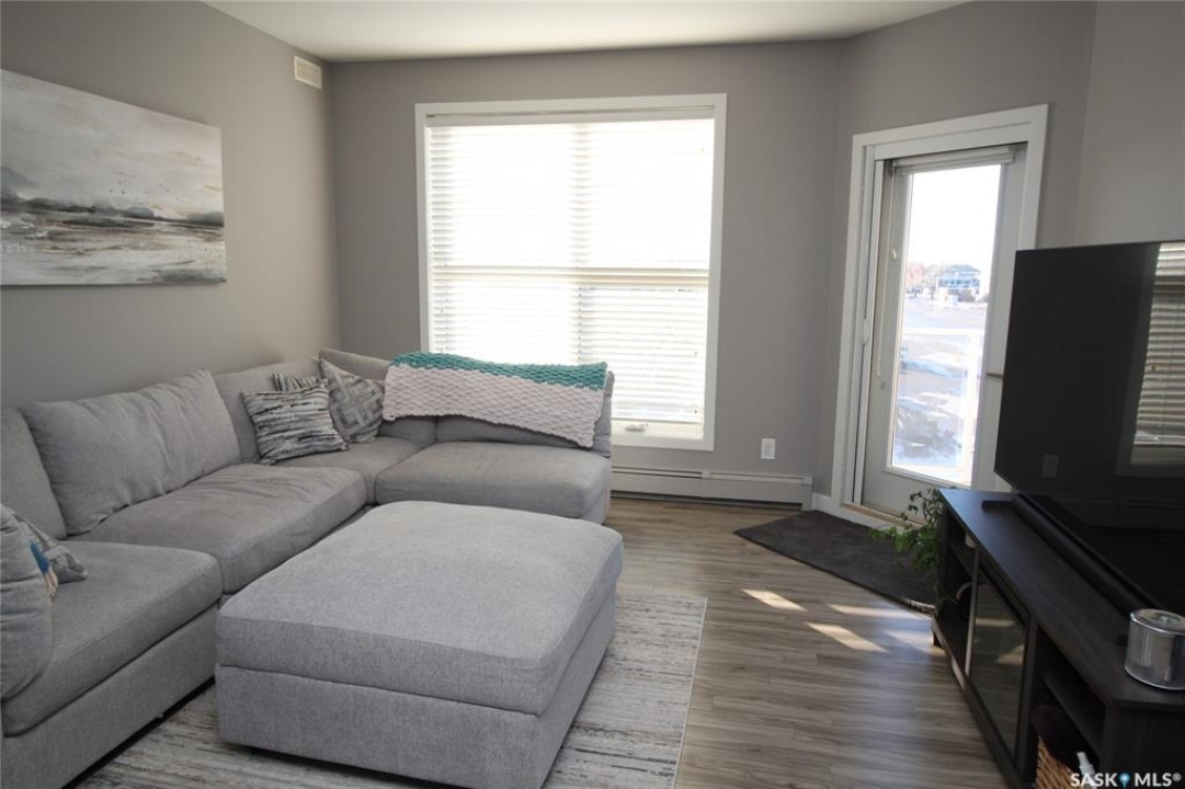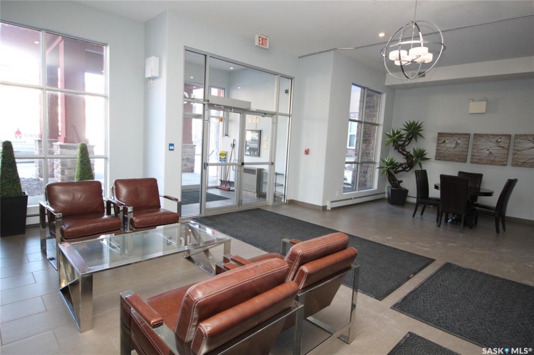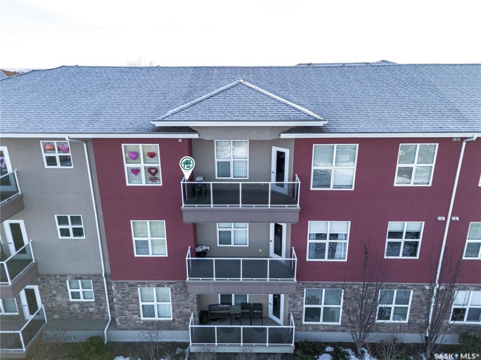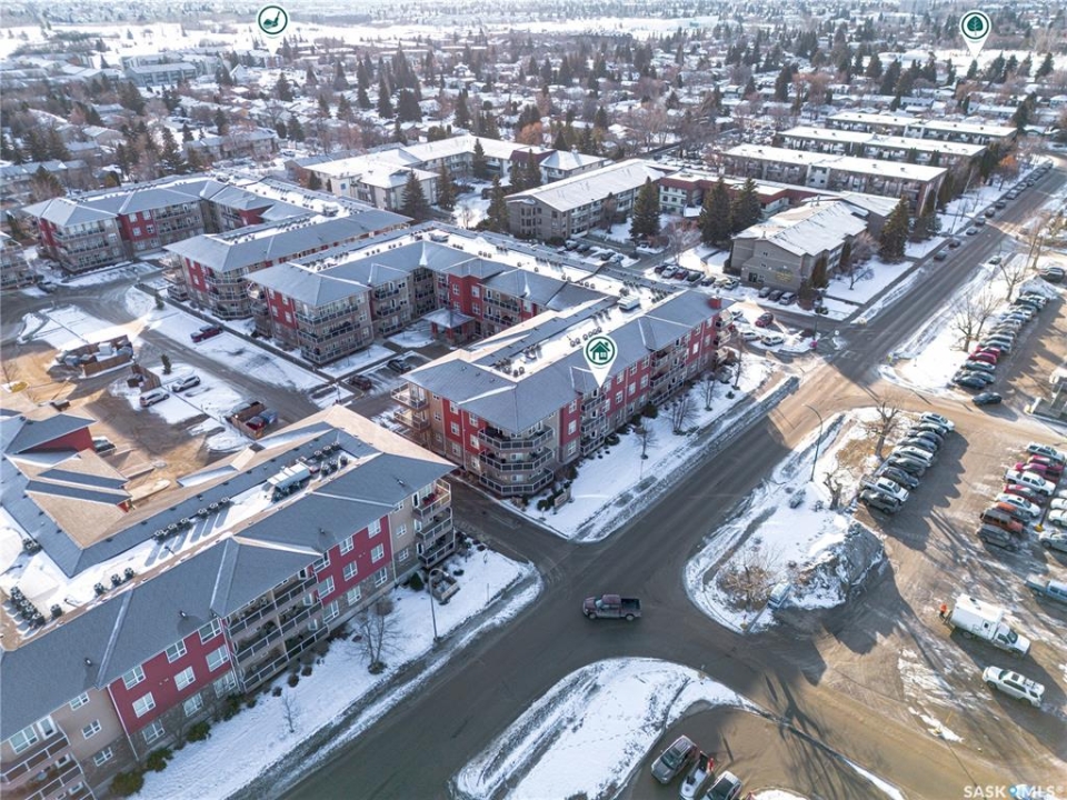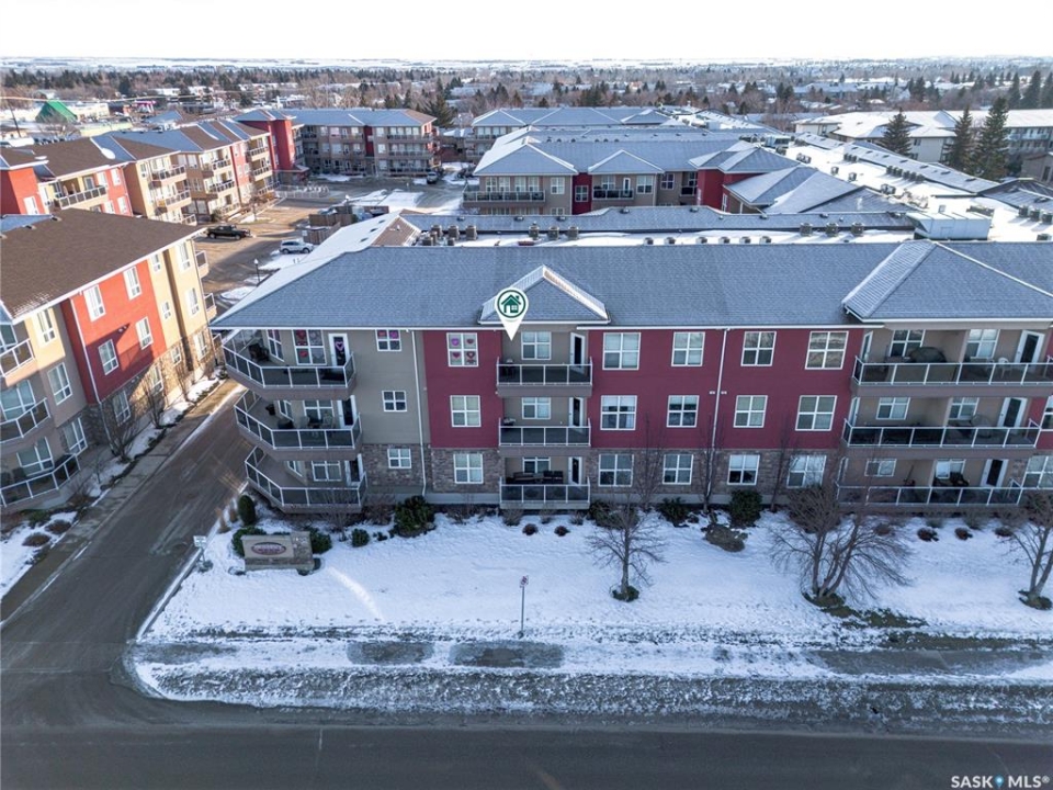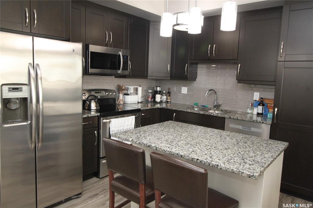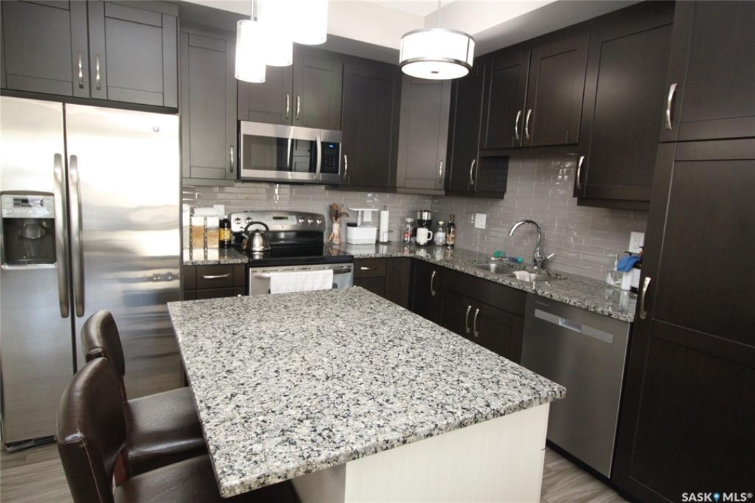 Located in one of Saskatoon's most desirable communities. Top floor 2-bedroom 1055 sq ft condo with an unobstructed view to the west. Kitchen has granite countertops, rich espresso cabinets with soft-close drawers, dual undermount sink and stainless steel appliances. Large living room with a garden door that leads from the living room to the west-facing deck. The door has a convenient phantom screen and the deck has a gas barbeque hookup. Spacious primary bedroom with a 3-piece en-suite and a walk-through closet. Laminate flooring throughout most of the condo. The in-suite laundry room is large enough to accommodate additional storage. One underground parking stall and one electrified ground-level parking stall. This complex has a guest suite that may be rented, an amenities room and an exercise room. Additional storage is located in front of the underground parking stall. Several visitor parking stalls are located throughout the complex. Great location. Close to 8th Street shopping and restaurants and easy access to Circle Drive.