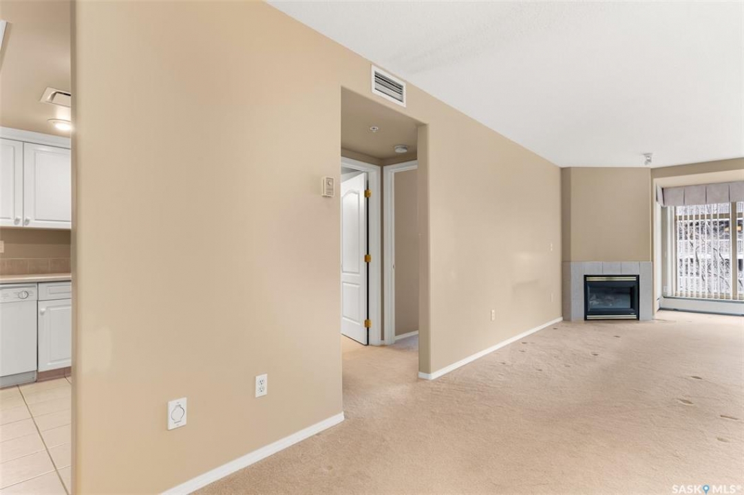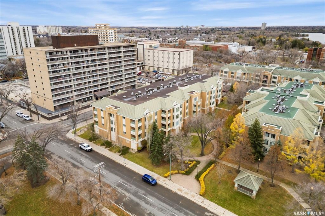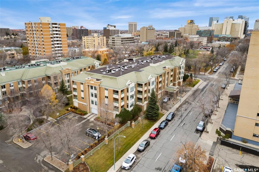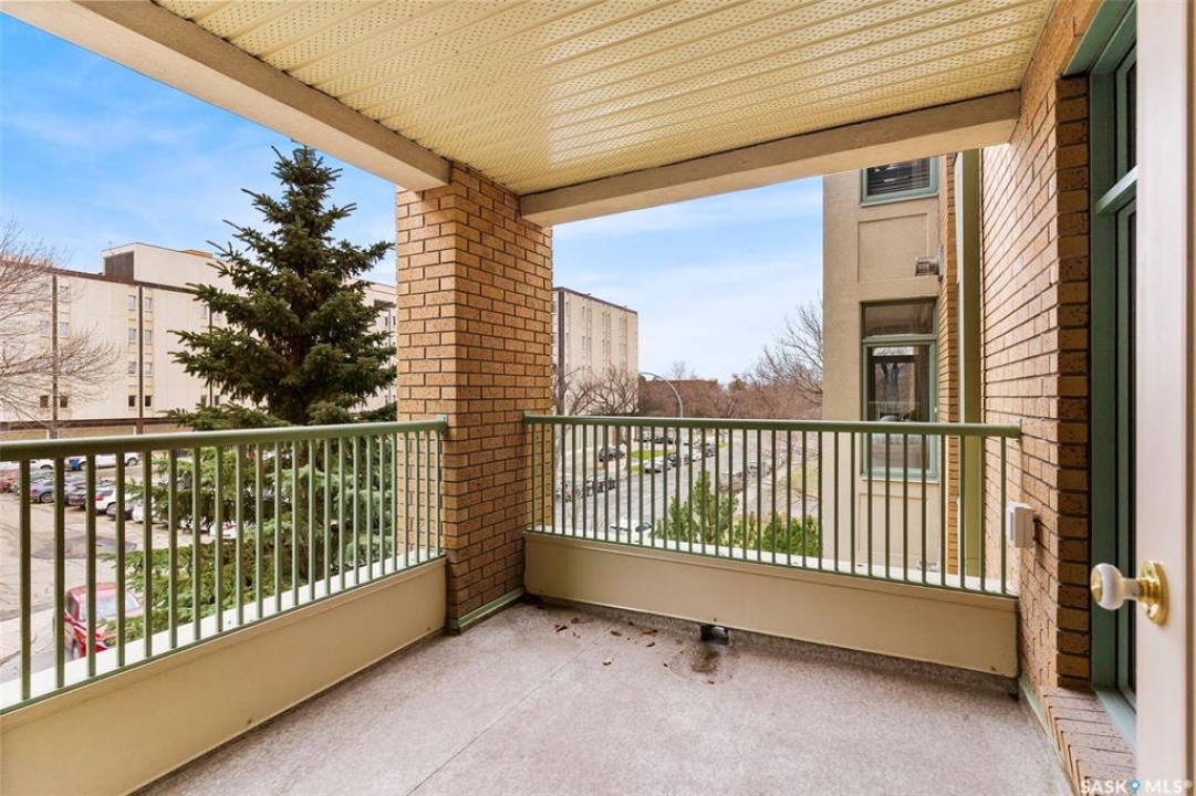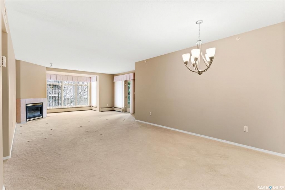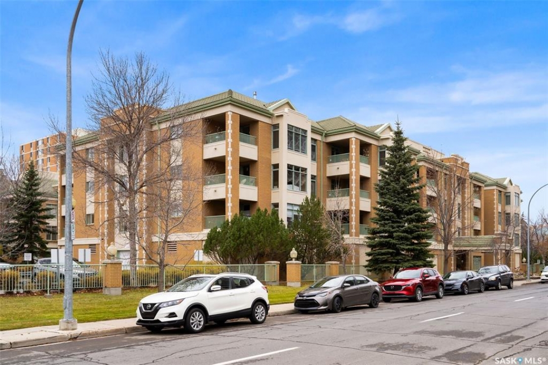 Experience the height of elegant, easy living in this impressive executive condo in the highly sought-after College Park community. Offering 1,338 square feet of thoughtfully designed space, this third-floor unit is filled with natural light and features an open-concept layout ideal for relaxing or entertaining. Step into a grand tiled foyer that leads to the spacious main living area. The inviting living room is anchored by a cozy gas fireplace and a sunlit alcove surrounded by windows—perfect for reading, working, or unwinding. The dining area easily accommodates a large table, while the well-appointed kitchen offers ample cabinetry, white appliances including a built-in oven and cooktop, and generous counter space. A covered east-facing balcony provides a peaceful retreat for morning coffee, complete with a gas BBQ hookup for outdoor dining. The spacious primary suite includes a large walk-in closet and a sleek three-piece ensuite with an oversized shower. A second bedroom offers flexible space for guests or a home office, with a four-piece main bath nearby. Additional conveniences include in-suite laundry with shelving, custom blinds, central air, and elevator access. This condo also includes a secure storage room and a heated underground parking stall (#31). Residents enjoy an amenities room with games and fitness equipment, a parkade car wash, off-street visitor parking, and a same-floor garbage chute. Steps from Wascana Park, shopping, dining, and essential services, it's also within walking distance to downtown, Darke Hall, and the refurbished Globe Theatre. Enjoy refined urban living at its best—condo fees cover heat, water, sewer, garbage/recycling, exterior maintenance, lawn care, snow removal, building insurance, and reserve fund contributions. Contact your realtor for more information or a private tour.