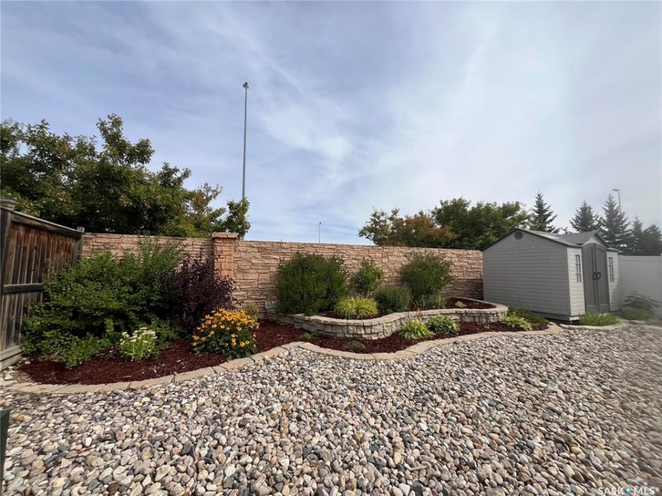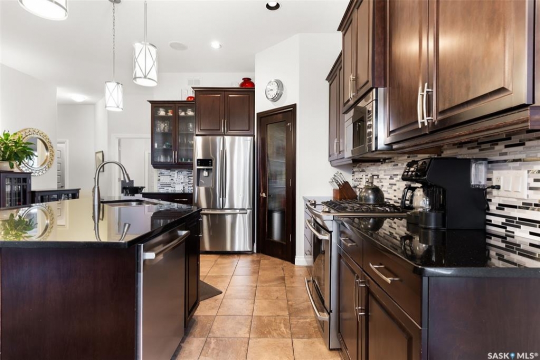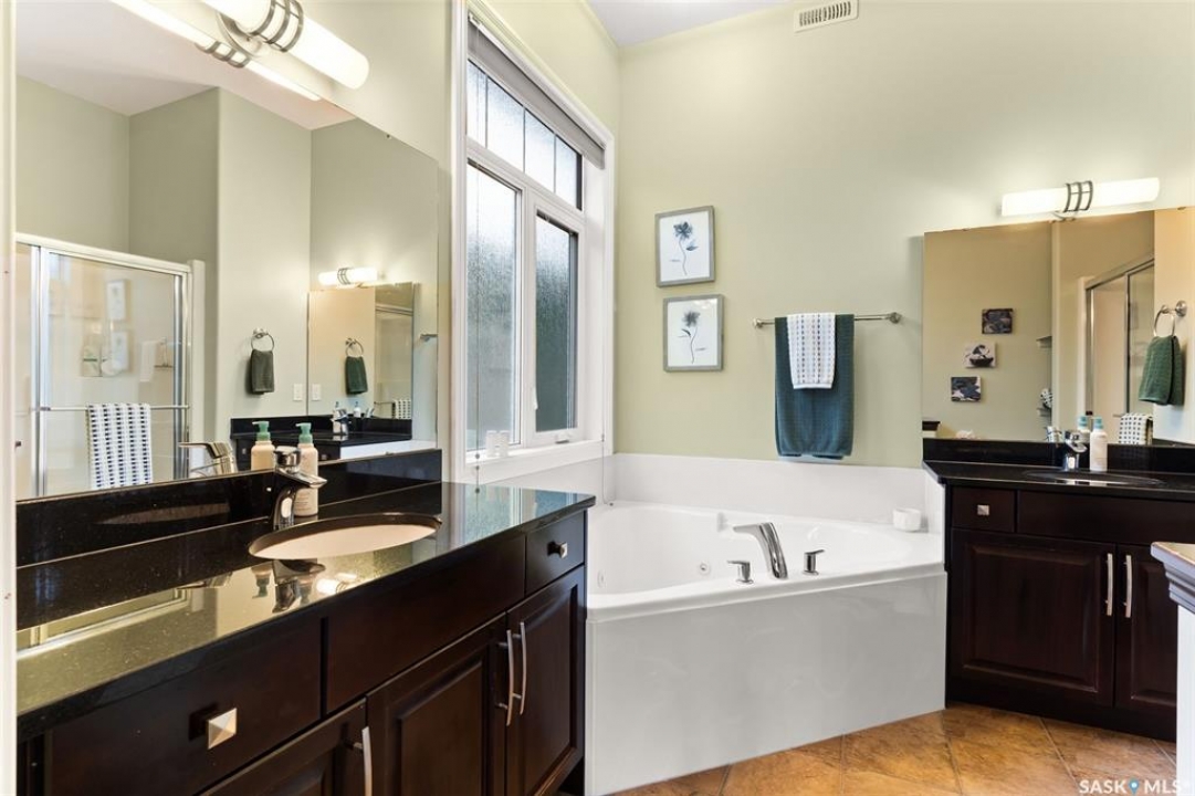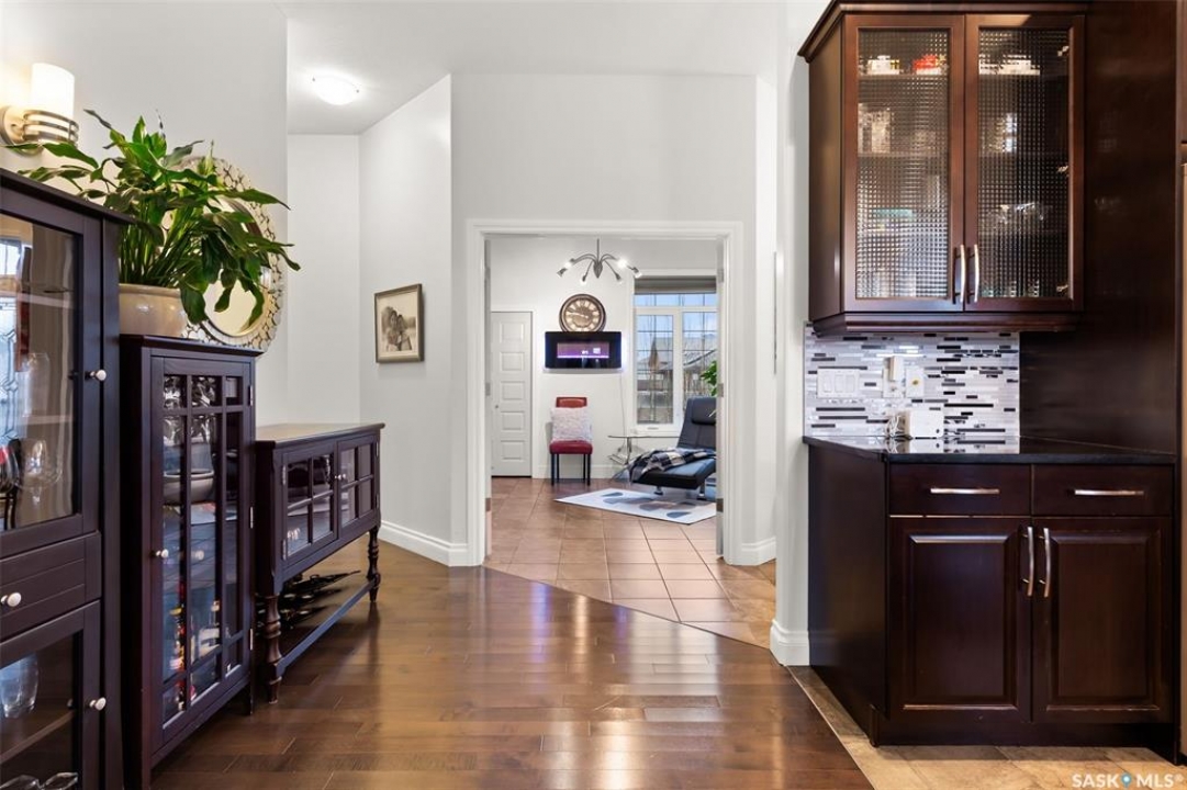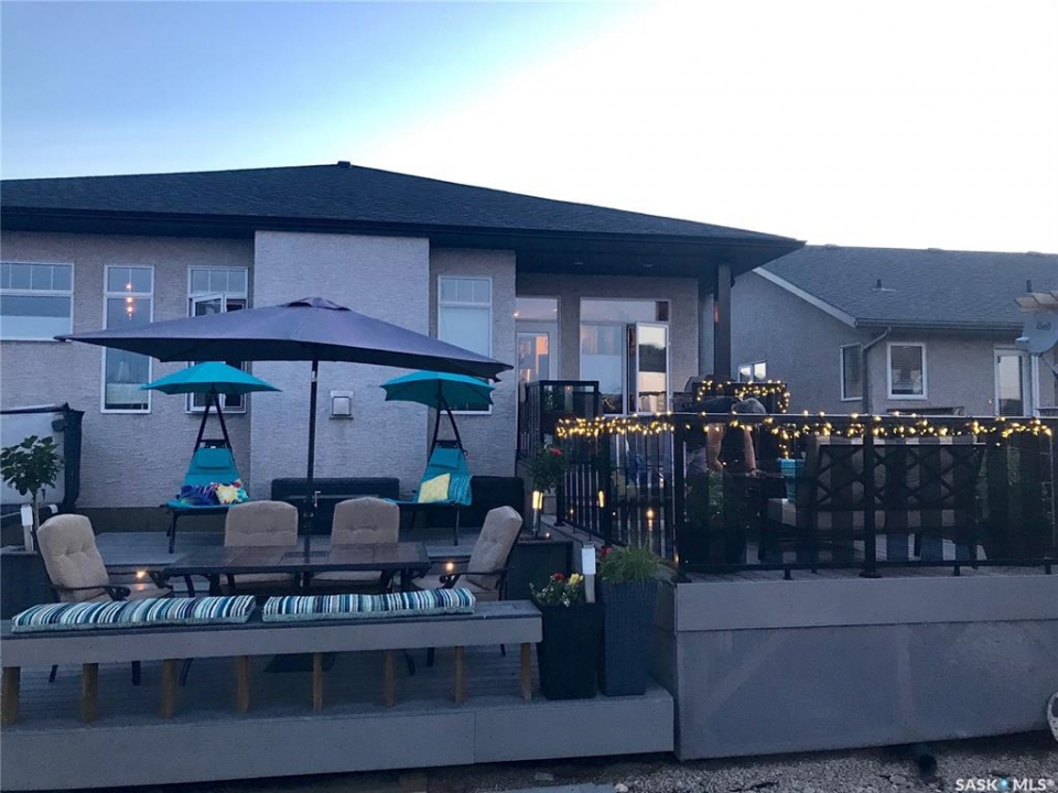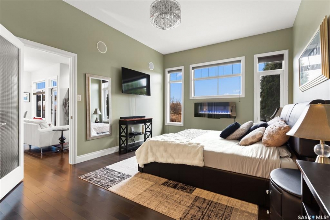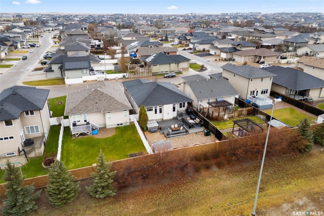 Built in 2011 on one of Harbour Landing's original crescents, this executive bungalow offers 1,700 sq. ft. on the main floor & over 3,400 sq. ft. of finished living space, including 6 bedrooms & 3 bathrooms. Designed for elegance and practicality, it suits families, multi-generational living, or those needing work-from-home flexibility. A spacious tiled foyer with 10' ceilings and built-in surround sound leads to a bright front office/bedroom with fireplace, large windows, a sink, ideal for a studio or salon. A 2nd bedroom and full bath sit privately down the hall. The main-floor laundry room offers ample storage & access to the double attached garage. Hardwood and ceramic tile span the main living areas. The open-concept kitchen, dining, and living room form the heart of the home, featuring quartz countertops, a large island, extensive cabinetry, a corner pantry & stainless steel appliances with a gas stove. The dining area opens to the backyard, while the living room includes a stone-surround gas fireplace. The primary suite provides a peaceful retreat with an electric fireplace, Smart TV, walk-in closet & a luxurious ensuite with double sinks, jetted tub & walk-in shower. The private, low-maintenance backyard has no rear neighbours and includes four composite decks, hot tub, raised perennial beds with drip irrigation & a garden shed. The lower level offers 8-ft ceilings, large windows, laminate flooring & an open layout with a library/games area, family room with projection screen, and a well-equipped wet bar with full fridge/freezer. Three generous bedrooms—two with walk-in closets—& a full bath with double sinks complete the space. Built on thirty-one 12" diameter piles, the home provides exceptional stability, along with an owned on-demand water heater, new Hi Efficient furnace, water filtration & softening systems, underground sprinklers, & drip irrigation. This home delivers space, privacy, & versatility in one of Harbour Landing's most desirable locations.