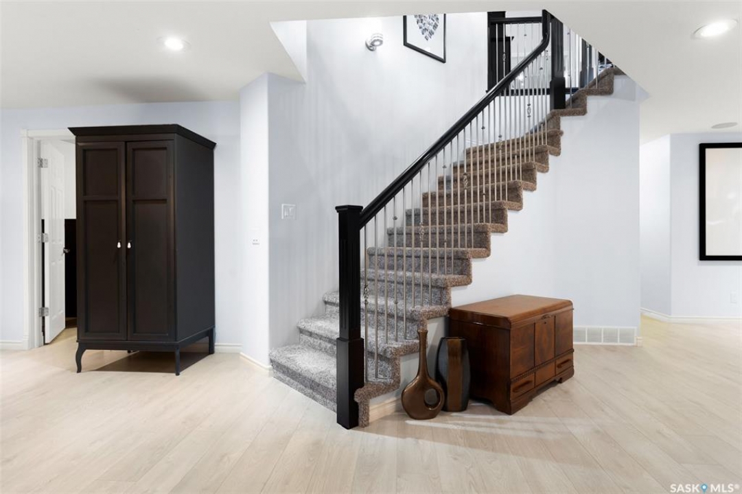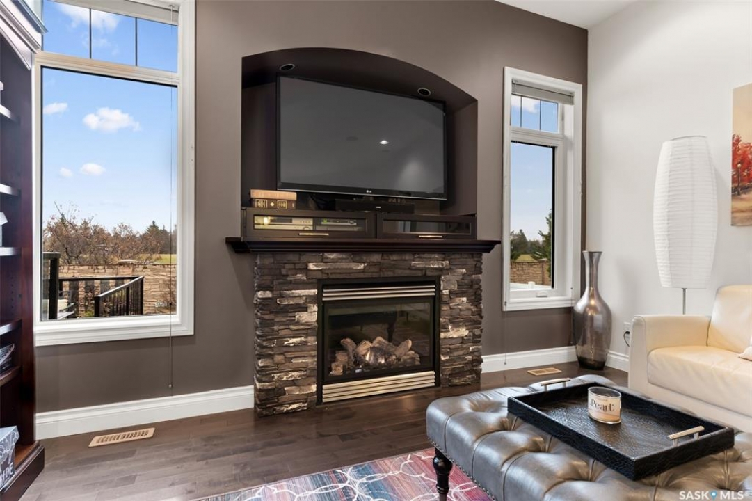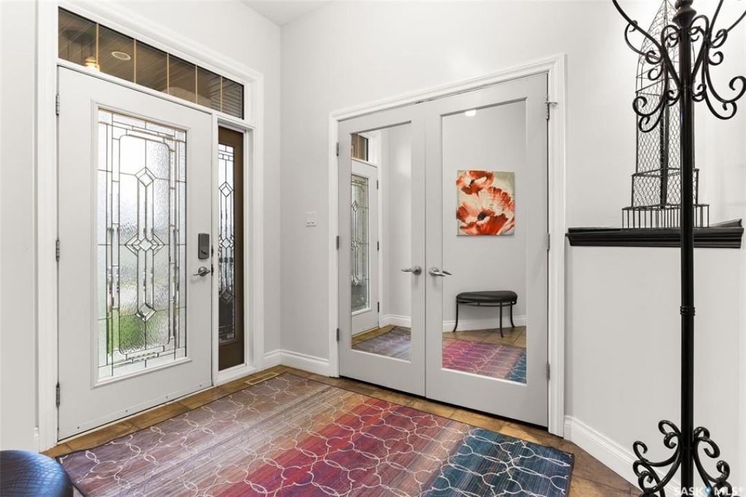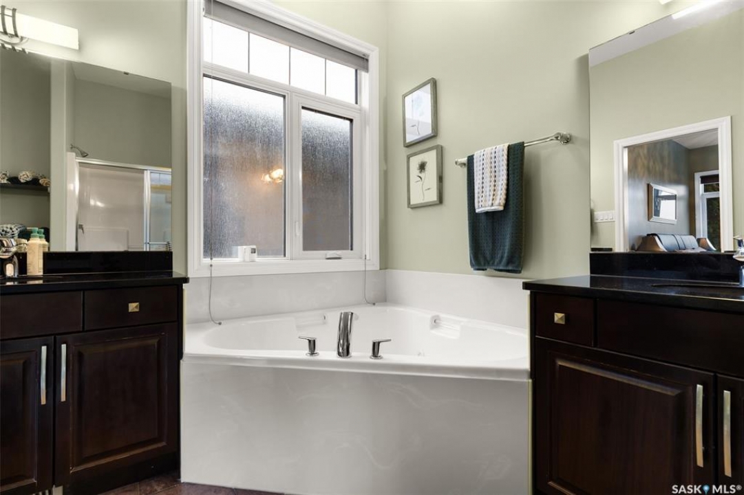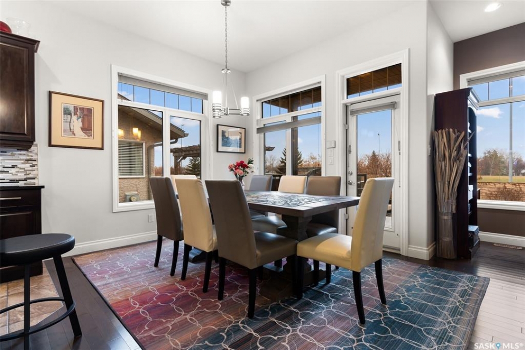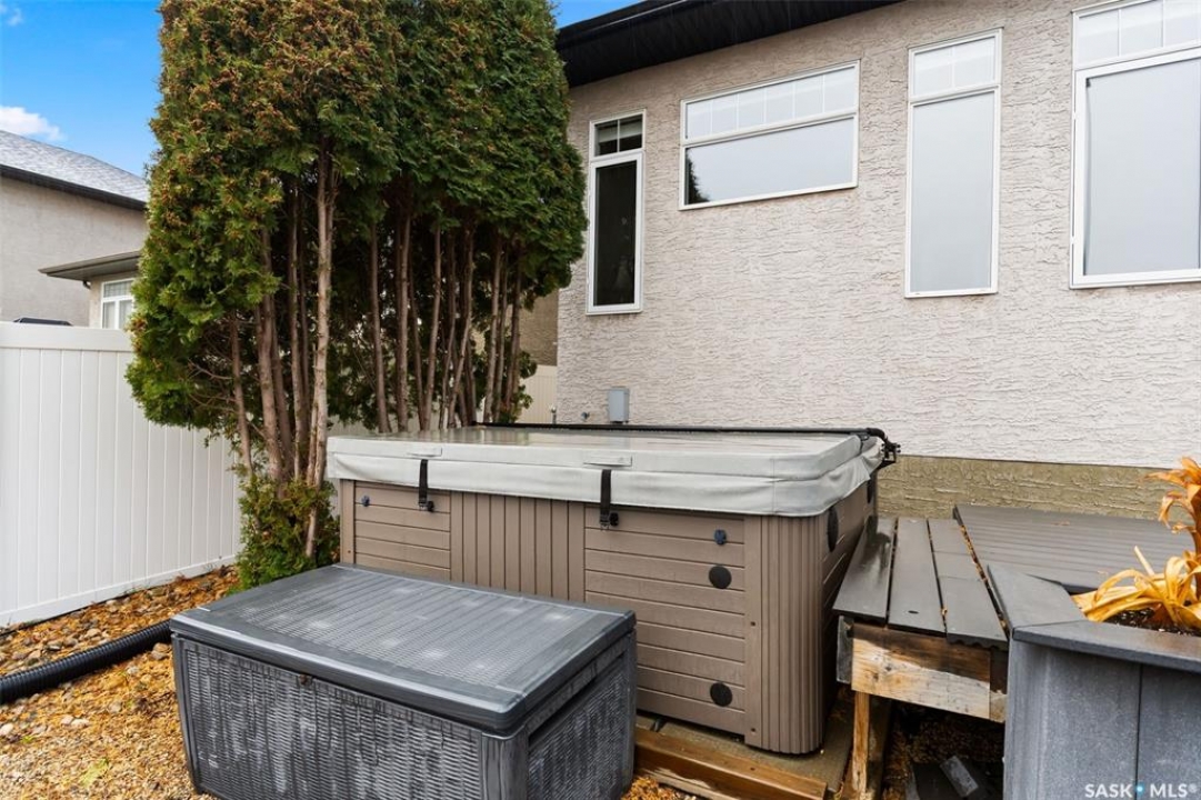 Built in 2011 on one of Harbour Landing's original crescents, this executive bungalow offers 1,700 sq. ft. on the main floor & over 3,400 sq. ft. of finished living space, including 6 bedrooms & 3 bathrooms. Designed for elegance and practicality, it suits families, multi-generational living, or those needing work-from-home flexibility. A spacious tiled foyer with 10' ceilings and built-in surround sound leads to a bright front office/bedroom with fireplace, large windows, a sink, ideal for a studio or salon. A 2nd bedroom and full bath sit privately down the hall. The main-floor laundry room offers ample storage & access to the double attached garage. Hardwood and ceramic tile span the main living areas. The open-concept kitchen, dining, and living room form the heart of the home, featuring quartz countertops, a large island, extensive cabinetry, a corner pantry & stainless steel appliances with a gas stove. The dining area opens to the backyard, while the living room includes a stone-surround gas fireplace. The primary suite provides a peaceful retreat with an electric fireplace, Smart TV, walk-in closet & a luxurious ensuite with double sinks, jetted tub & walk-in shower. The private, low-maintenance backyard has no rear neighbours and includes four composite decks, hot tub, raised perennial beds with drip irrigation & a garden shed. The lower level offers 8-ft ceilings, large windows, laminate flooring & an open layout with a library/games area, family room with projection screen, and a well-equipped wet bar with full fridge/freezer. Three generous bedrooms—two with walk-in closets—& a full bath with double sinks complete the space. Built on thirty-one 12" diameter piles, the home provides exceptional stability, along with an owned on-demand water heater, new Hi Efficient furnace, water filtration & softening systems, underground sprinklers, & drip irrigation. This home delivers space, privacy, & versatility in one of Harbour Landing's most desirable locations.