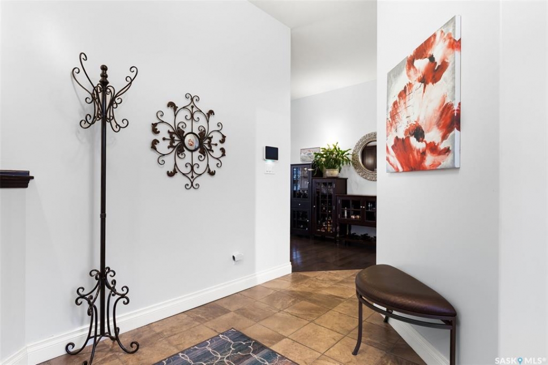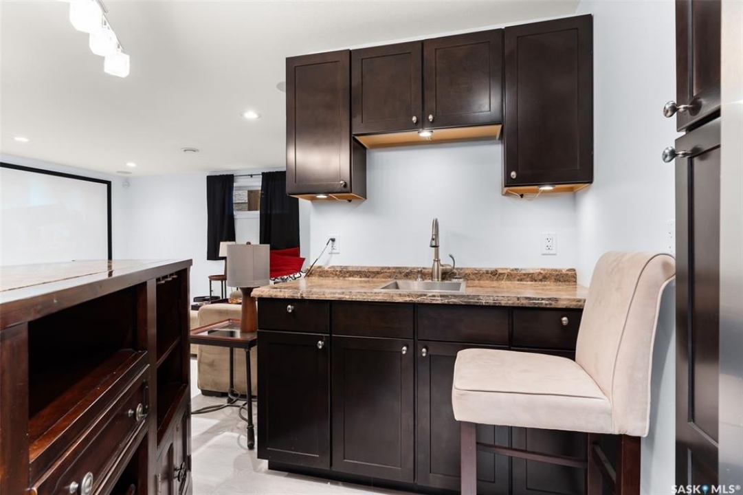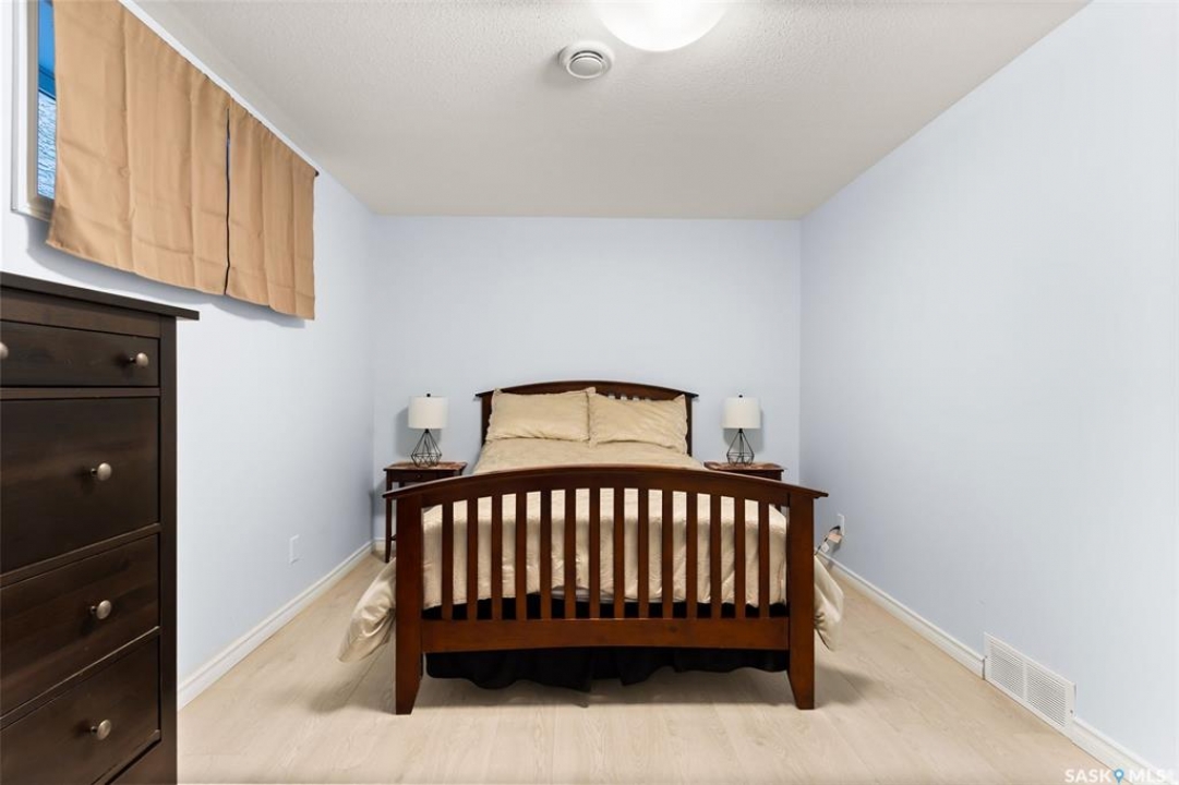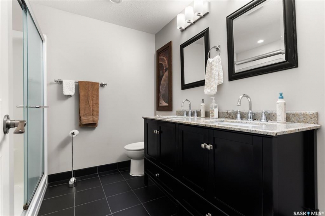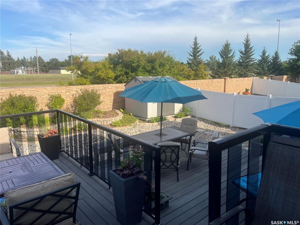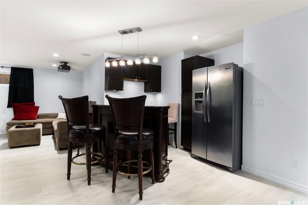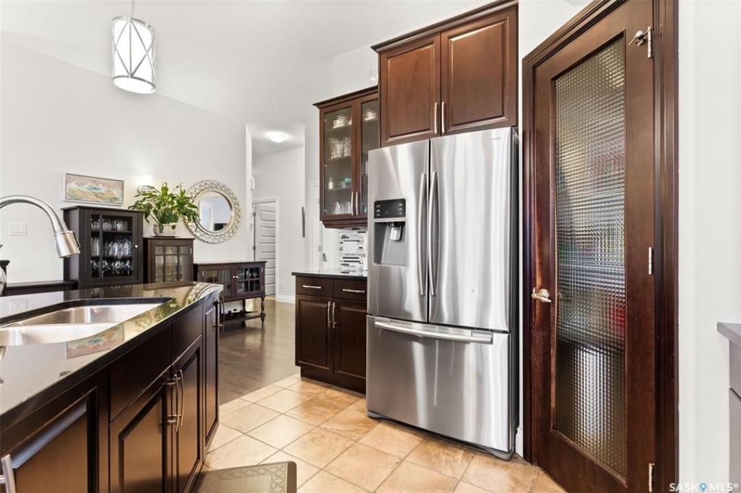Built in 2011 on one of Harbour Landing's original crescents, this executive bungalow offers 1,700 sq. ft. on the main floor & over 3,400 sq. ft. of finished living space, including 6 bedrooms & 3 bathrooms. Designed for elegance and practicality, it suits families, multi-generational living, or those needing work-from-home flexibility. A spacious tiled foyer with 10' ceilings and built-in surround sound leads to a bright front office/bedroom with fireplace, large windows, a sink, ideal for a studio or salon. A 2nd bedroom and full bath sit privately down the hall. The main-floor laundry room offers ample storage & access to the double attached garage. Hardwood and ceramic tile span the main living areas. The open-concept kitchen, dining, and living room form the heart of the home, featuring quartz countertops, a large island, extensive cabinetry, a corner pantry & stainless steel appliances with a gas stove. The dining area opens to the backyard, while the living room includes a stone-surround gas fireplace. The primary suite provides a peaceful retreat with an electric fireplace, Smart TV, walk-in closet & a luxurious ensuite with double sinks, jetted tub & walk-in shower. The private, low-maintenance backyard has no rear neighbours and includes four composite decks, hot tub, raised perennial beds with drip irrigation & a garden shed. The lower level offers 8-ft ceilings, large windows, laminate flooring & an open layout with a library/games area, family room with projection screen, and a well-equipped wet bar with full fridge/freezer. Three generous bedrooms—two with walk-in closets—& a full bath with double sinks complete the space. Built on thirty-one 12" diameter piles, the home provides exceptional stability, along with an owned on-demand water heater, new Hi Efficient furnace, water filtration & softening systems, underground sprinklers, & drip irrigation. This home delivers space, privacy, & versatility in one of Harbour Landing's most desirable locations.