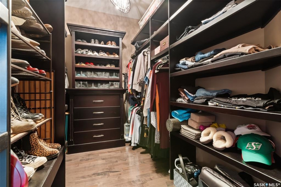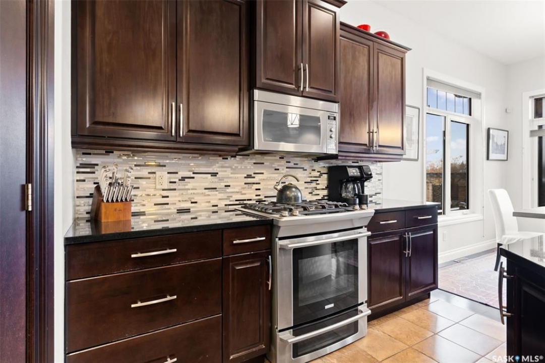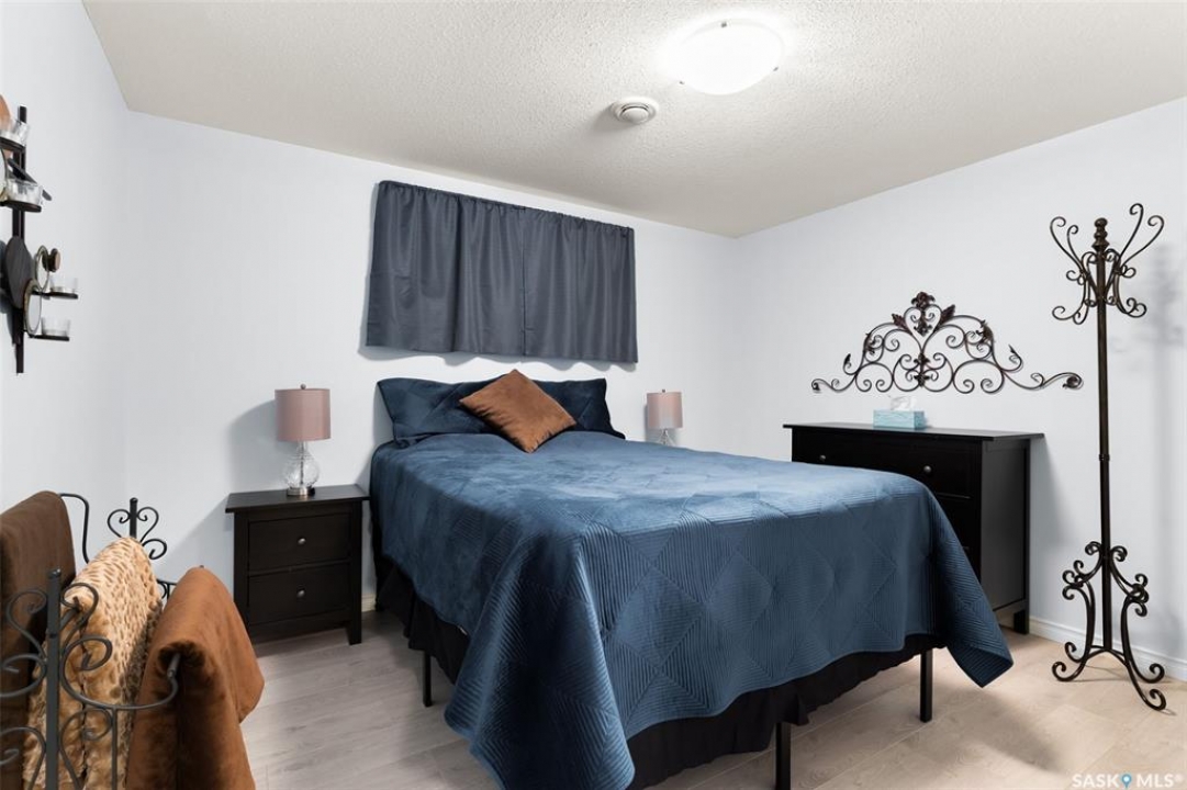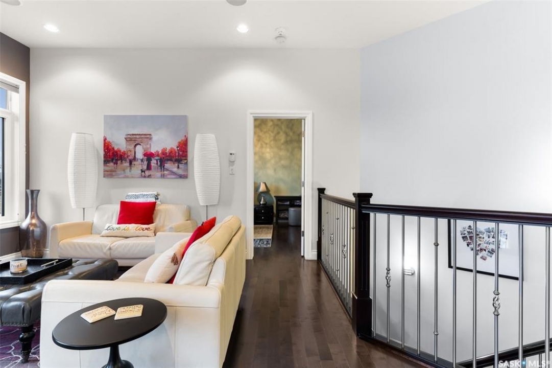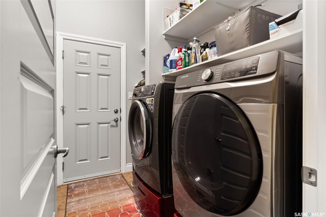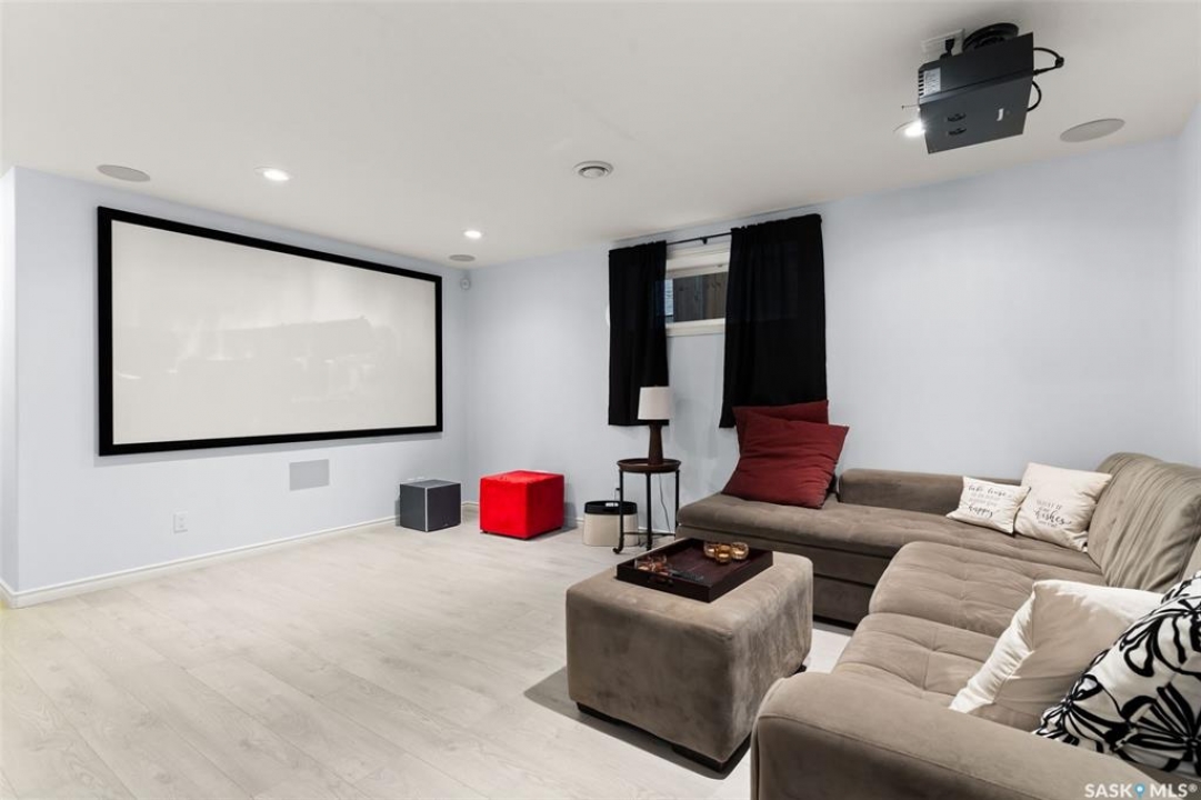 Built in 2011 on one of Harbour Landing's original crescents, this executive bungalow offers 1,700 sq. ft. on the main floor & over 3,400 sq. ft. of finished living space, including 6 bedrooms & 3 bathrooms. Designed for elegance and practicality, it suits families, multi-generational living, or those needing work-from-home flexibility. A spacious tiled foyer with 10' ceilings and built-in surround sound leads to a bright front office/bedroom with fireplace, large windows, a sink, ideal for a studio or salon. A 2nd bedroom and full bath sit privately down the hall. The main-floor laundry room offers ample storage & access to the double attached garage. Hardwood and ceramic tile span the main living areas. The open-concept kitchen, dining, and living room form the heart of the home, featuring quartz countertops, a large island, extensive cabinetry, a corner pantry & stainless steel appliances with a gas stove. The dining area opens to the backyard, while the living room includes a stone-surround gas fireplace. The primary suite provides a peaceful retreat with an electric fireplace, Smart TV, walk-in closet & a luxurious ensuite with double sinks, jetted tub & walk-in shower. The private, low-maintenance backyard has no rear neighbours and includes four composite decks, hot tub, raised perennial beds with drip irrigation & a garden shed. The lower level offers 8-ft ceilings, large windows, laminate flooring & an open layout with a library/games area, family room with projection screen, and a well-equipped wet bar with full fridge/freezer. Three generous bedrooms—two with walk-in closets—& a full bath with double sinks complete the space. Built on thirty-one 12" diameter piles, the home provides exceptional stability, along with an owned on-demand water heater, new Hi Efficient furnace, water filtration & softening systems, underground sprinklers, & drip irrigation. This home delivers space, privacy, & versatility in one of Harbour Landing's most desirable locations.