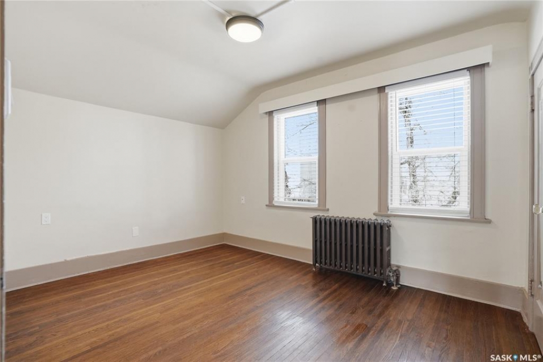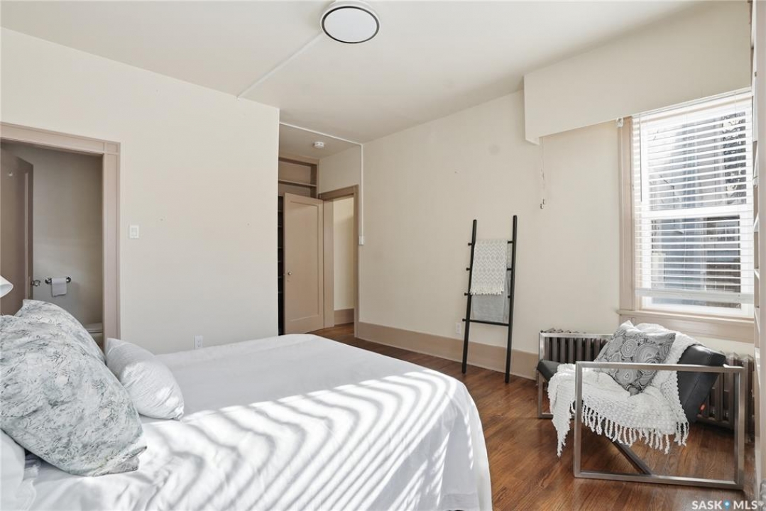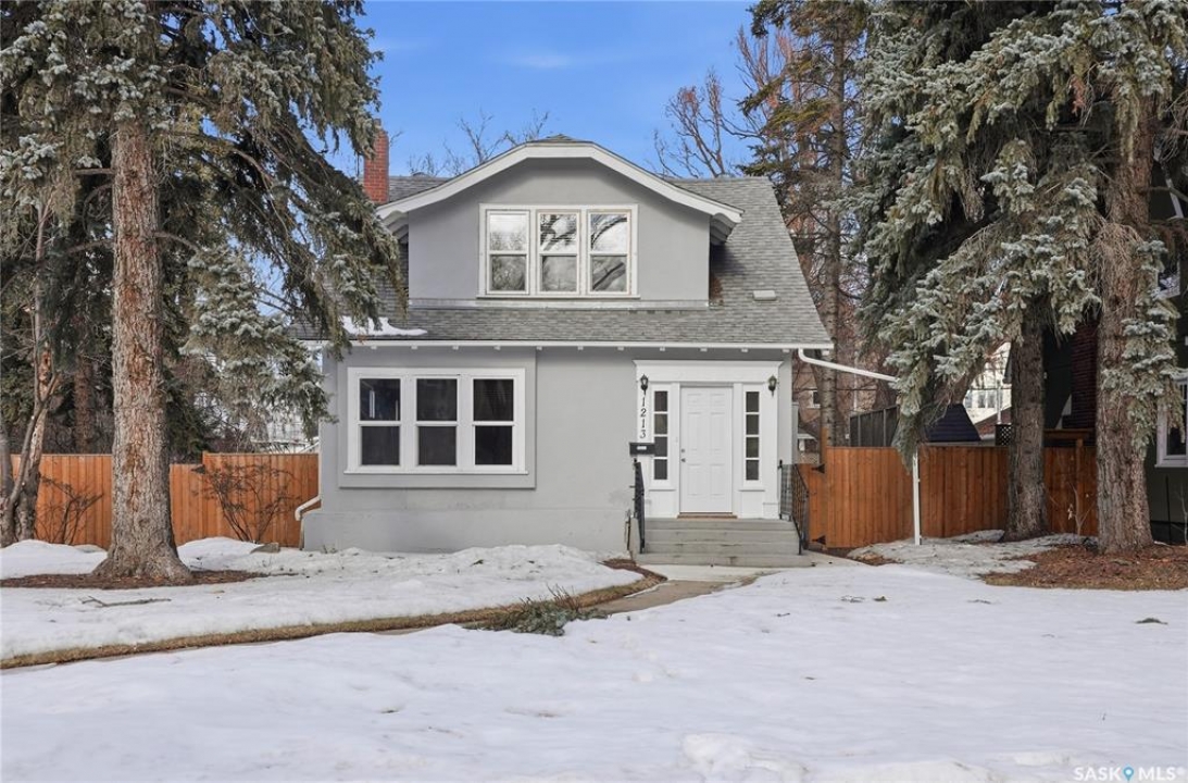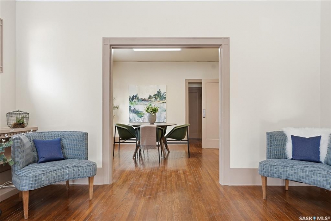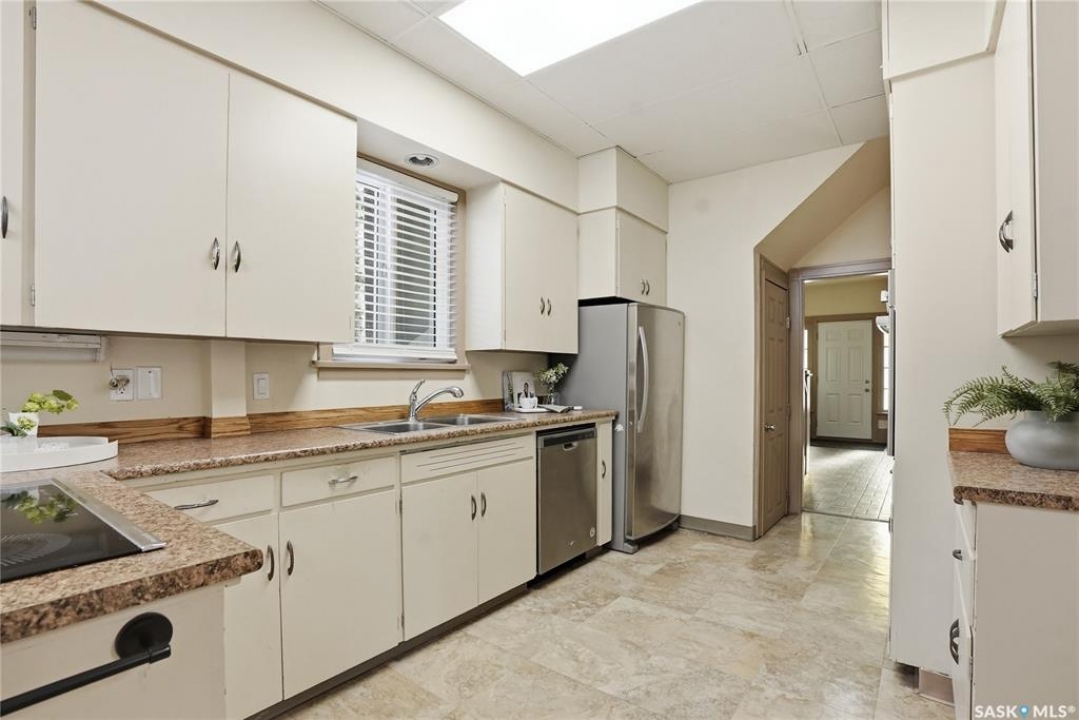 Opportunities exist here in so many ways — investment property, holding property, viable rental with several income streams incl 6 parking stalls, future Residential Corridor redevelopment, multi-family site, or luxury home building site: subdivision to 2 x 30' lots. This well-cared-for and updated home sits on a 60x140 ft lot on beautiful Elliott St E, 1 block to the University of Saskatchewan- the property offers incredible flexibility! Featuring a side entry, two kitchens, 4 beds on the second level, 3 beds in the lower level, and three bathrooms, this property presents strong rental potential or comfortable liveable holding value. Updates include shingles, windows (2025), updated boiler and 300 amp electrical, much more. The rear of the property provides an attached single garage plus six parking stalls, offering excellent additional revenue potential. The storybook front façade welcomes you with a winding sidewalk leading to a front entry. Inside, a foyer opens to the spacious and open great room showcasing the original fireplace with built-in shelving and beautiful corner windows. A large formal dining room is attached off the living area. The main floor also includes a large bedroom (or study) with additional built-ins, a 2-piece bath, and a roomy closet. The adjacent kitchen features wood cabinetry, a peninsula with eating bar, stainless appliances including a Bosch wall oven. Oak treads lead to the second floor where you will find three very large bedrooms, all with refinished hardwood floors, and a spacious 3-piece family bathroom. The fully dev basement offers a separate entry and includes a kitchen, living room, 3 bedrooms, laundry, and a 4-pc bath. The 8400 sq' lot presents long-term potential, including the option for subdivision into 2 x 30' lots or future redevelopment under the Corridor Residential Community Plan, allowing for potential Multiple Unit Dwelling development (see members' remarks), subject to development standards.