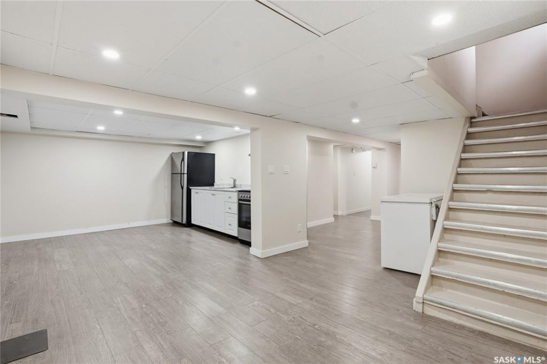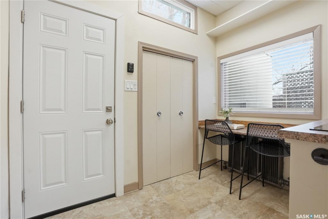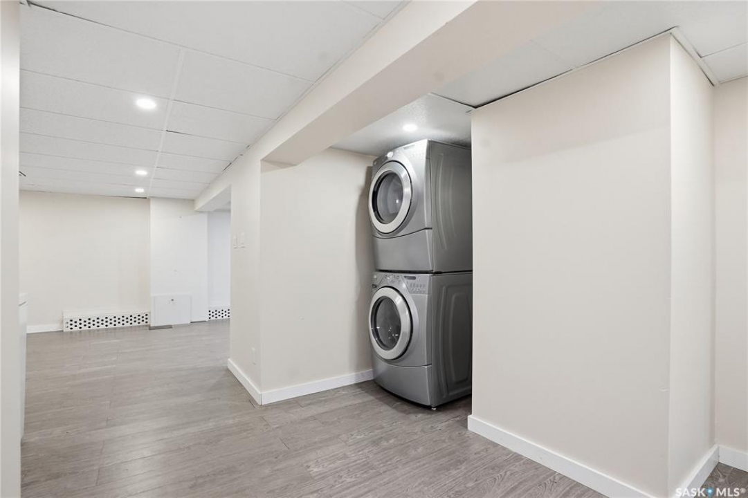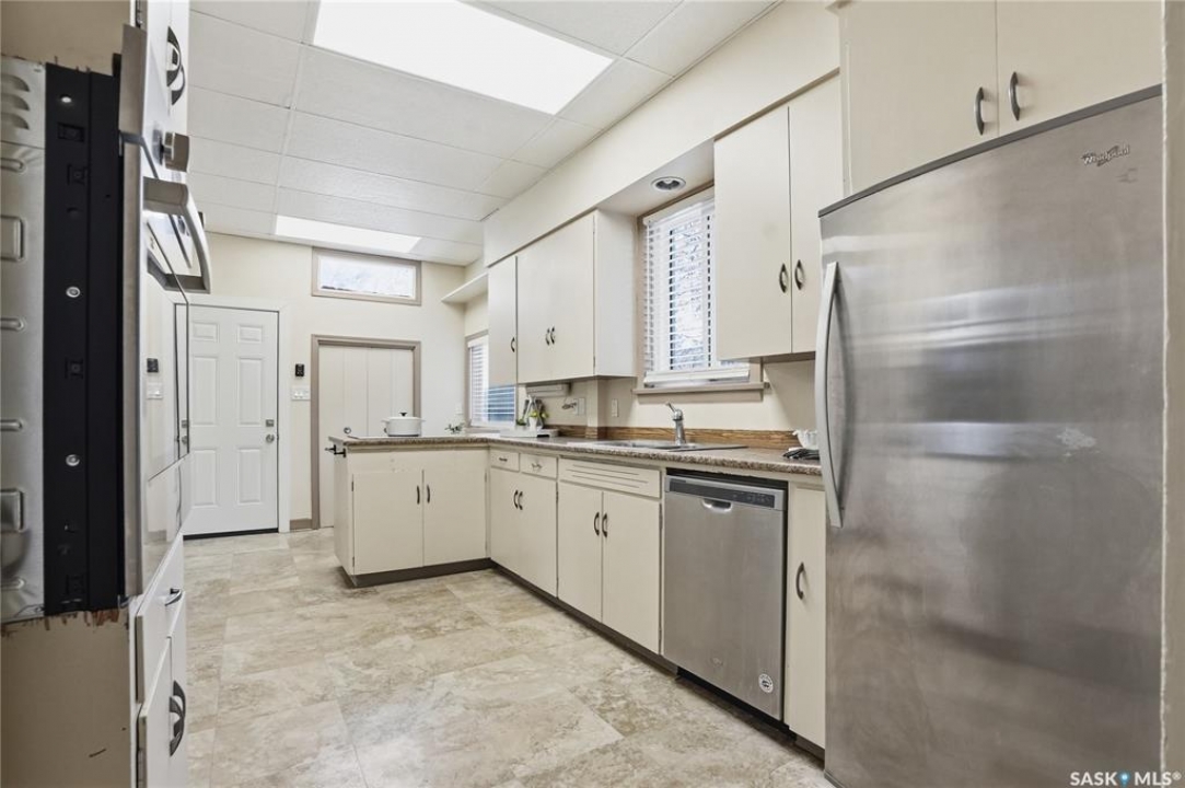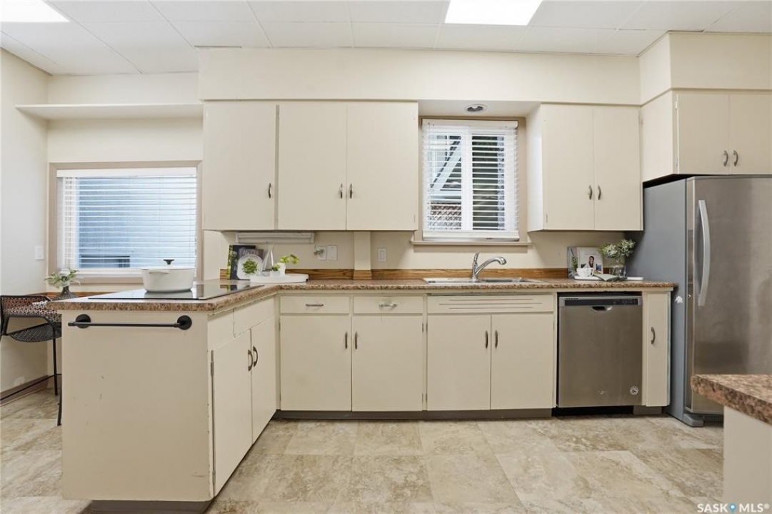 Opportunities exist here in so many ways — investment property, holding property, viable rental with several income streams incl 6 parking stalls, future Residential Corridor redevelopment, multi-family site, or luxury home building site: subdivision to 2 x 30' lots. This well-cared-for and updated home sits on a 60x140 ft lot on beautiful Elliott St E, 1 block to the University of Saskatchewan- the property offers incredible flexibility! Featuring a side entry, two kitchens, 4 beds on the second level, 3 beds in the lower level, and three bathrooms, this property presents strong rental potential or comfortable liveable holding value. Updates include shingles, windows (2025), updated boiler and 300 amp electrical, much more. The rear of the property provides an attached single garage plus six parking stalls, offering excellent additional revenue potential. The storybook front façade welcomes you with a winding sidewalk leading to a front entry. Inside, a foyer opens to the spacious and open great room showcasing the original fireplace with built-in shelving and beautiful corner windows. A large formal dining room is attached off the living area. The main floor also includes a large bedroom (or study) with additional built-ins, a 2-piece bath, and a roomy closet. The adjacent kitchen features wood cabinetry, a peninsula with eating bar, stainless appliances including a Bosch wall oven. Oak treads lead to the second floor where you will find three very large bedrooms, all with refinished hardwood floors, and a spacious 3-piece family bathroom. The fully dev basement offers a separate entry and includes a kitchen, living room, 3 bedrooms, laundry, and a 4-pc bath. The 8400 sq' lot presents long-term potential, including the option for subdivision into 2 x 30' lots or future redevelopment under the Corridor Residential Community Plan, allowing for potential Multiple Unit Dwelling development (see members' remarks), subject to development standards.