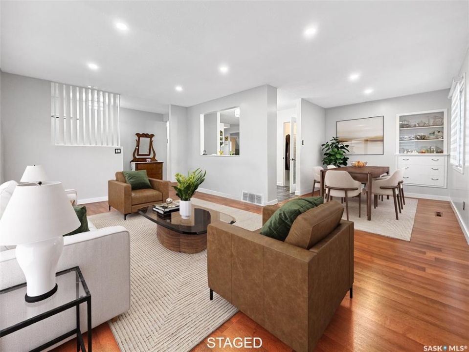 1102 Golden Place is a rare North Hill opportunity—homes on this quiet, highly sought-after cul-de-sac seldom come available. Set on a corner lot directly across from Swift Current Comprehensive High School and K– 8 Irwin School, this location puts Billy Buffalo Park just steps away, with Elmwood Golf Course, restaurants, and everyday amenities only a short walk or drive from home. This well-built bungalow offers 1,633 sq. ft. of functional main-floor living. The bright L-shaped living and dining area features large north- and west-facing windows. The crisp white kitchen is finished with a stainless-steel appliance package and glass backsplash. Off the kitchen, you'll find a comfortable family room with newer garden doors leading to the deck—ideal for indoor-outdoor entertaining. A separate office/den also includes garden doors and can easily serve as a fourth main-floor bedroom if desired. Three bedrooms are located on the main level, including a primary bedroom with a convenient 2-piece ensuite. Downstairs, and 4 piece refreshed washroom. The fully developed lower level provides a spacious family room with a corner wet bar, an additional bedroom, a 3-pc bathroom, workshop space, laundry/utility room, and ample storage.Outside, the yard is designed for low maintenance while still offering mature trees, privacy, and plenty of room to host. Find a concrete patio and large no maintenance backyard. A maintenance-free fence (2018) surrounds the space, and the double detached garage is complemented by additional gated RV parking. Key updates include metal roof on house and garage (2016), BathFitter tub (2014) and bathroom refresh, updated decks (2018), kitchen appliances (2019), exterior lighting (2022), basement paint and trim (2022), hot water heater (2024), and new energy-efficient zoned furnaces (2025). Imagine never packing our children a lunch again... this location can not be beat! Contact today for more information or to book your personal viewing today!