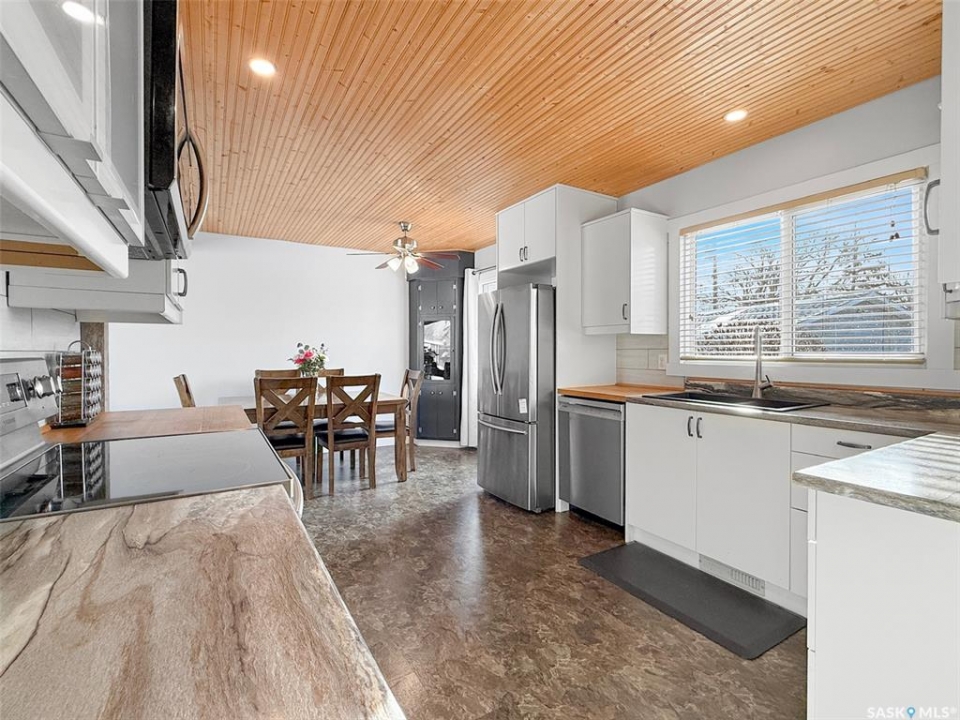 Exceptional Hillcrest bungalow positioned beside Elmwood Golf Course, offering a rare blend of curb appeal, thoughtful updates and substantial grades. Nestled between Taylor and Ashley Drives, this move-in ready home combines bright, open living spaces with practical improvements that appeal to both immediate occupants and future resale buyers. The Main level features a modern kitchen with updated appliances and a large kitchen/dining set at the rear of the home overlooking the yard and covered patio, a dedicated dining area and a spacious 12' x 18' front family room with new carpeting. Two large main-floor bedrooms and a fully renovated bathroom complete this level. The lower level has new flooring and provides excellent additional living space: recreation room with bar, a large third bedroom, updated two-piece bath, laundry/utility area and a combined storage/workshop. The basement presents a potential opportunity to add a fourth bedroom and a shower to increase value. Sited on a deep 146' lot, the private, fully fenced yard includes a covered concrete patio with built-in storage, underground sprinklers, and a 22' x 26' double detached garage. Central air conditioning enhances year-round comfort. Significant upgrades and maintenance include: a modern kitchen renovation with appliances (2017), main-floor bathroom remodel, PVC windows, updated lighting, renovated basement bedroom, mid-efficiency furnace (recently serviced), hot water heater (2021), vinyl siding and metal roof (2016). Dishwasher, microwave hoodfan and washer replaced in 2025. An attractive combination of location, condition and improvements! Call today for more information or to book your personal viewing.