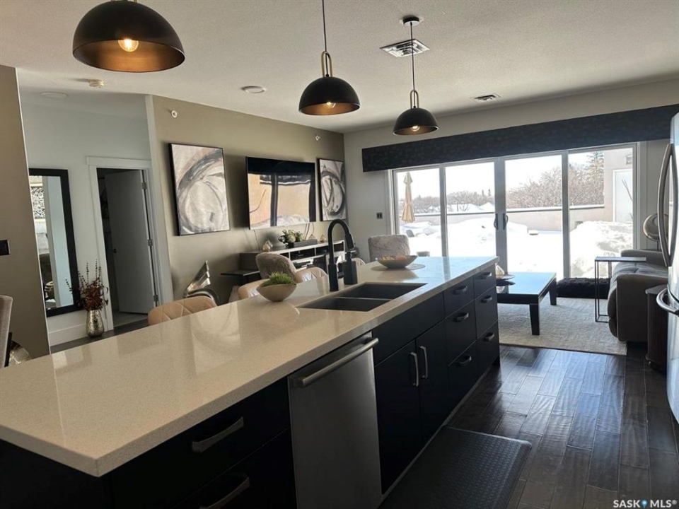 Penthouse condo with amazing outdoor space, 3 bedrooms, 2 bathrooms, and a huge 1,800 sq.ft. private patio! The unit features engineered hardwood flooring in the living, dining, and kitchen areas. Quartz countertops throughout, with the kitchen showcasing two-tone cabinets. All new light fixtures. New window coverings. The living room and master bedroom both have remote-controlled Hunter Douglas blinds. The laundry area includes double cabinets for extra storage. There are 5 patio doors. The unit comes with two parking stalls: one underground (tandem) stall #23 and one surface stall #404. The large 1,800 sq. ft. balcony is perfect for entertaining. Additional features include an individual furnace, central air, and a spacious storage/laundry room. Two small pets are allowed. The West Coast style combined with East Coast energy gives TriBeCa its unique vibe, making it one of Saskatoon's most desirable and vibrant areas. This striking building truly captures attention. It is ideally located with great proximity to the University of Saskatchewan, Broadway, and Downtown.