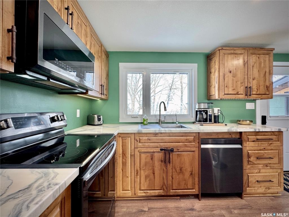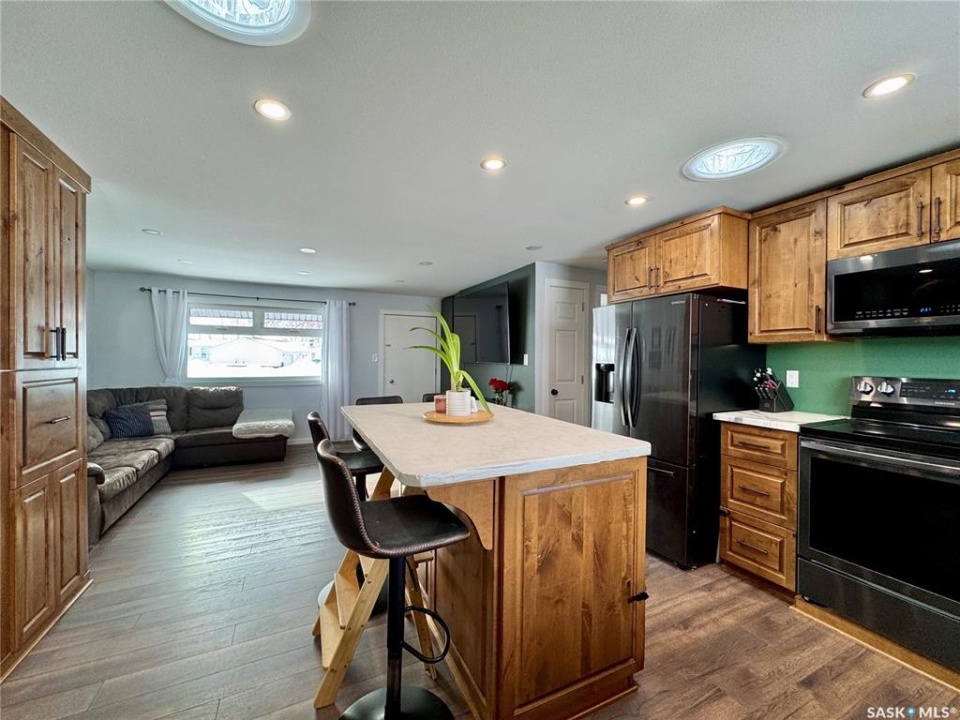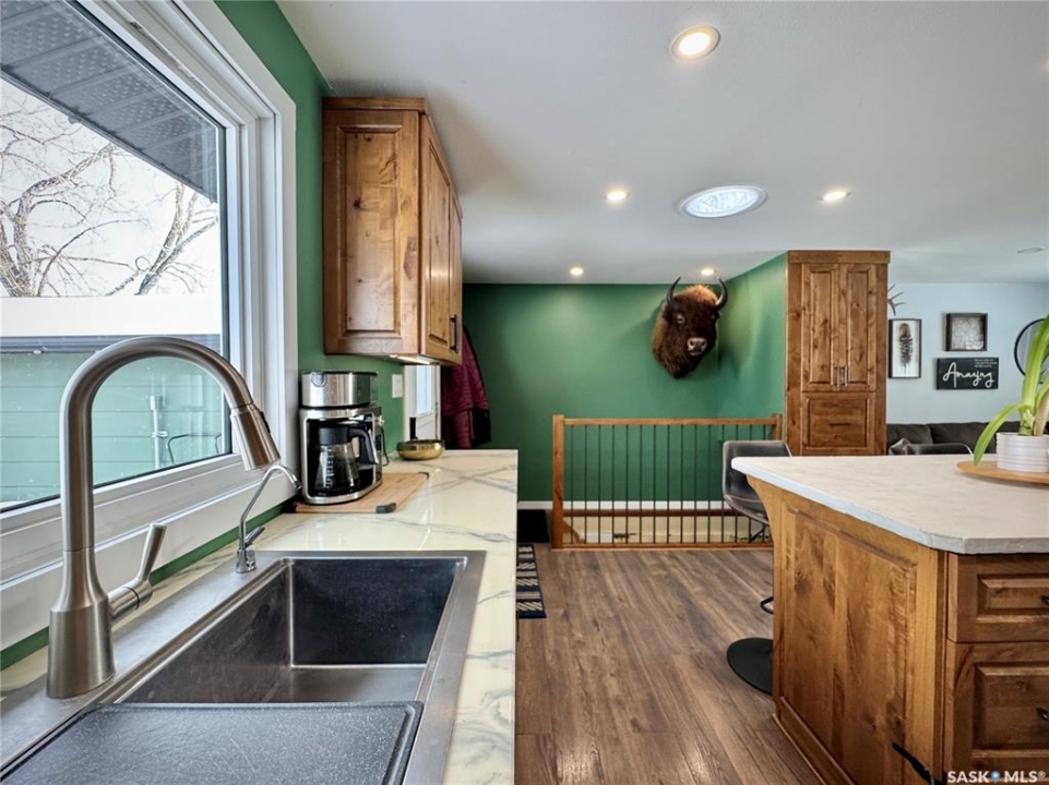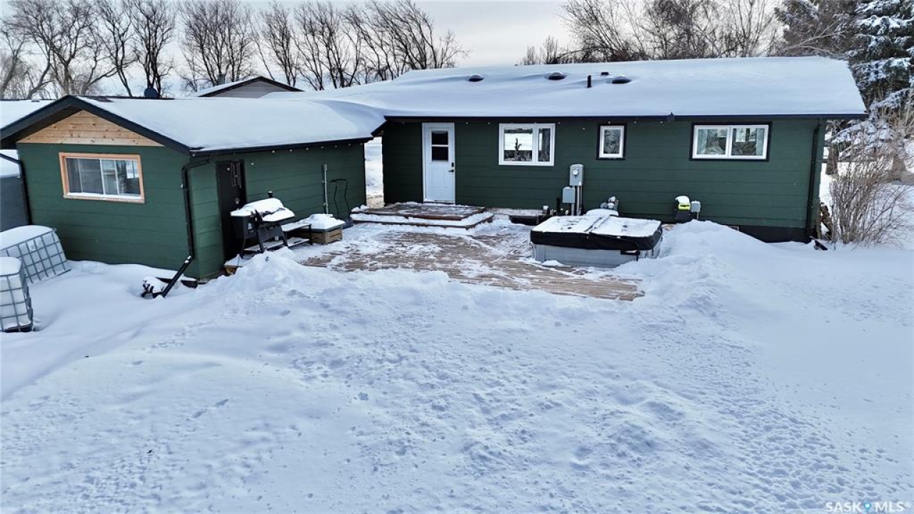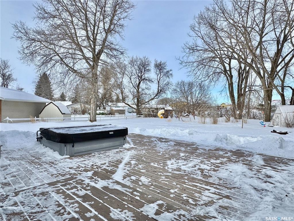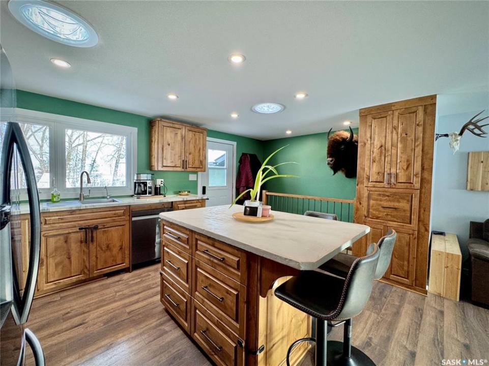 Set on the far southern edge of Esterhazy, this renovated bungalow offers the convenience of town living with open prairie stretching beyond your backyard. The main floor has been completely redone with intention. Warm naughty alder custom cabinetry, updated flooring, reverse osmosis drinking water, windows and shingles create a clean, cohesive feel throughout. New tunnel Sky lights are conveniently fitted throughout the main living space allowing an abundance of natural light. The kitchen was thoughtfully designed for those of us who are not vertically challenged. Countertops were custom fabricated at a raised height — and even the stove was lifted — reducing the strain of constant bending. It's a practical upgrade you'll appreciate daily, and of course raised door frames as well - no ducking into door frames here. The primary bedroom easily accommodates a king-sized bed and features a walk-in closet with excellent natural light. The main bathroom is brand new, complete with heated floors and a walk-in shower. Downstairs offers a third bedroom, a den, and a spa-inspired bathroom with soaker tub and separate shower. The electrical panel has been updated, and the home has remained dry through all flood years. Step outside and you'll find an oversized deck built intentionally to support the jacuzzi hot tub, added just a couple of years ago. Ambient lighting creates the perfect atmosphere for evenings with friends — or, if peace is what you're after, turn the lights off and enjoy uninterrupted prairie skies in a setting largely untouched by light pollution. The property spans over 1/3 of an acre and is framed by mature trees along the town's edge, offering space and privacy rarely found within town limits and the ability to zip out on your machines without angry neighbors. Lastly, a detached single garage and carport provide sheltered parking year-round. A thoughtfully updated home in a quiet location where comfort and setting work hand in hand.