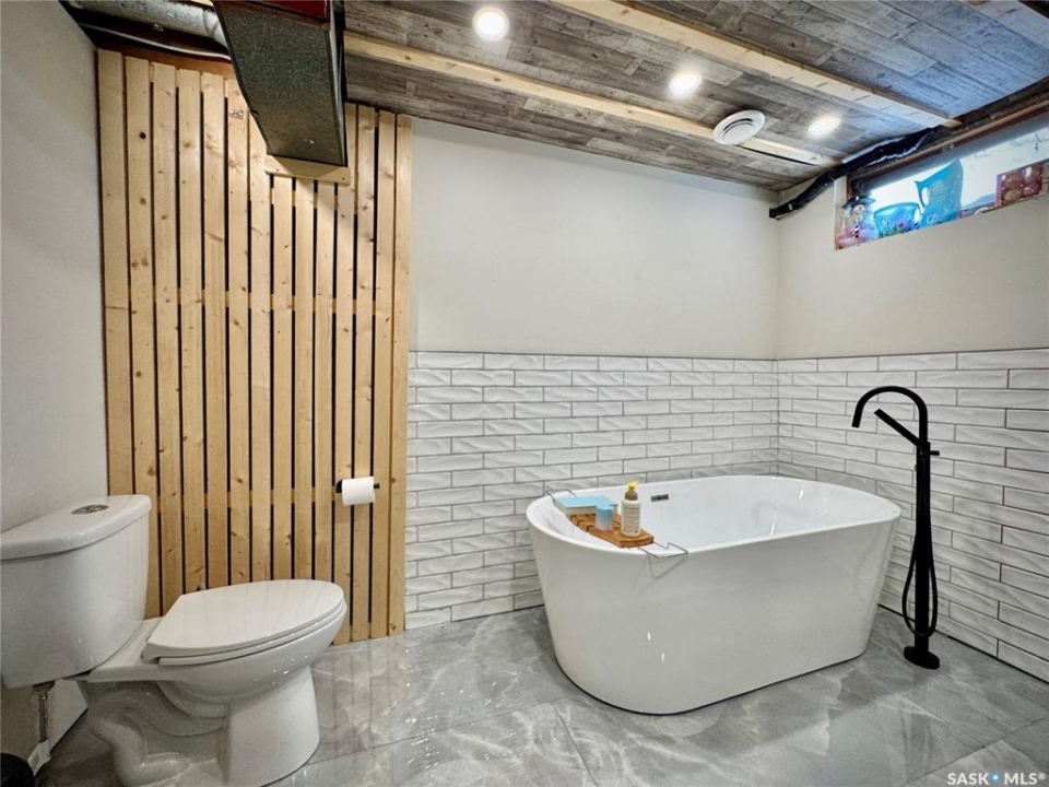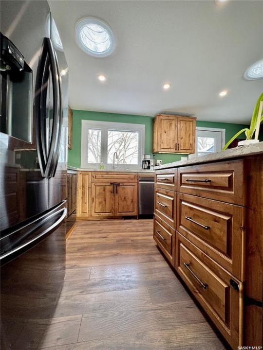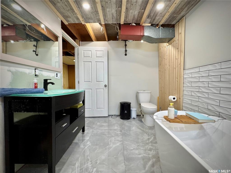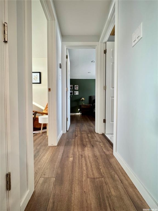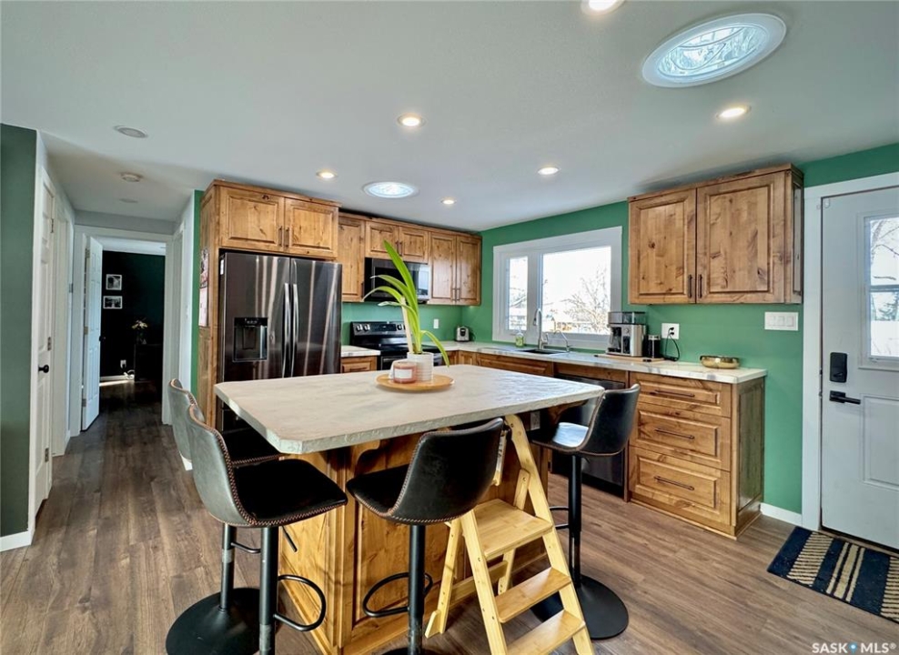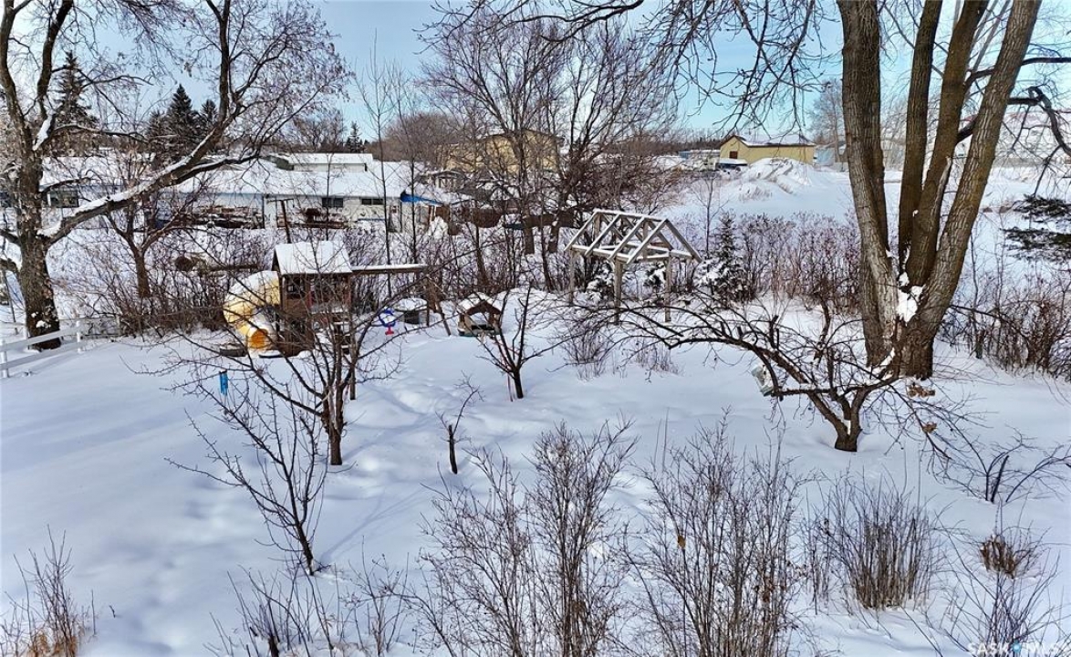 Set on the far southern edge of Esterhazy, this renovated bungalow offers the convenience of town living with open prairie stretching beyond your backyard. The main floor has been completely redone with intention. Warm naughty alder custom cabinetry, updated flooring, reverse osmosis drinking water, windows and shingles create a clean, cohesive feel throughout. New tunnel Sky lights are conveniently fitted throughout the main living space allowing an abundance of natural light. The kitchen was thoughtfully designed for those of us who are not vertically challenged. Countertops were custom fabricated at a raised height — and even the stove was lifted — reducing the strain of constant bending. It's a practical upgrade you'll appreciate daily, and of course raised door frames as well - no ducking into door frames here. The primary bedroom easily accommodates a king-sized bed and features a walk-in closet with excellent natural light. The main bathroom is brand new, complete with heated floors and a walk-in shower. Downstairs offers a third bedroom, a den, and a spa-inspired bathroom with soaker tub and separate shower. The electrical panel has been updated, and the home has remained dry through all flood years. Step outside and you'll find an oversized deck built intentionally to support the jacuzzi hot tub, added just a couple of years ago. Ambient lighting creates the perfect atmosphere for evenings with friends — or, if peace is what you're after, turn the lights off and enjoy uninterrupted prairie skies in a setting largely untouched by light pollution. The property spans over 1/3 of an acre and is framed by mature trees along the town's edge, offering space and privacy rarely found within town limits and the ability to zip out on your machines without angry neighbors. Lastly, a detached single garage and carport provide sheltered parking year-round. A thoughtfully updated home in a quiet location where comfort and setting work hand in hand.