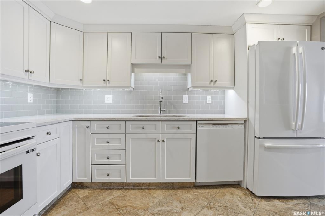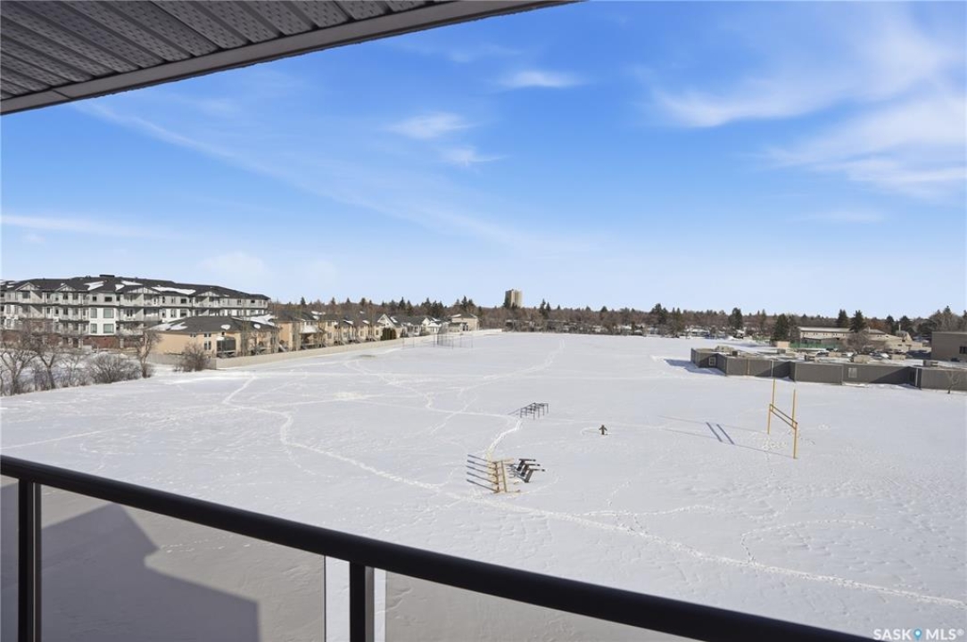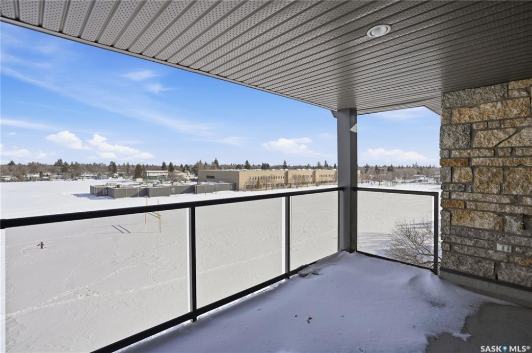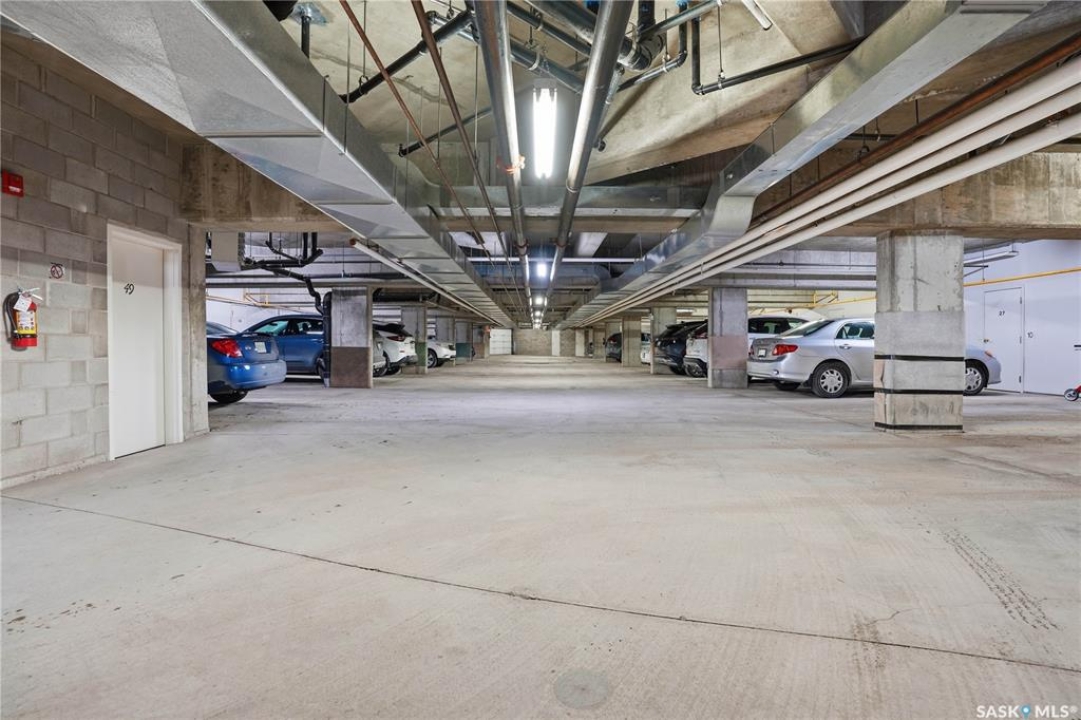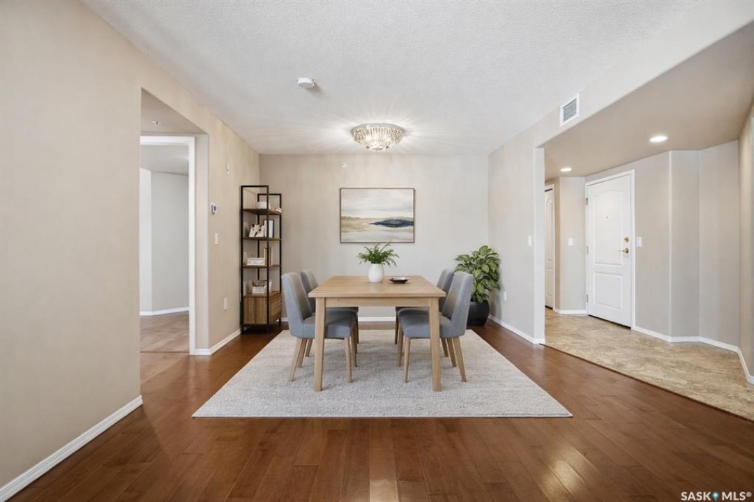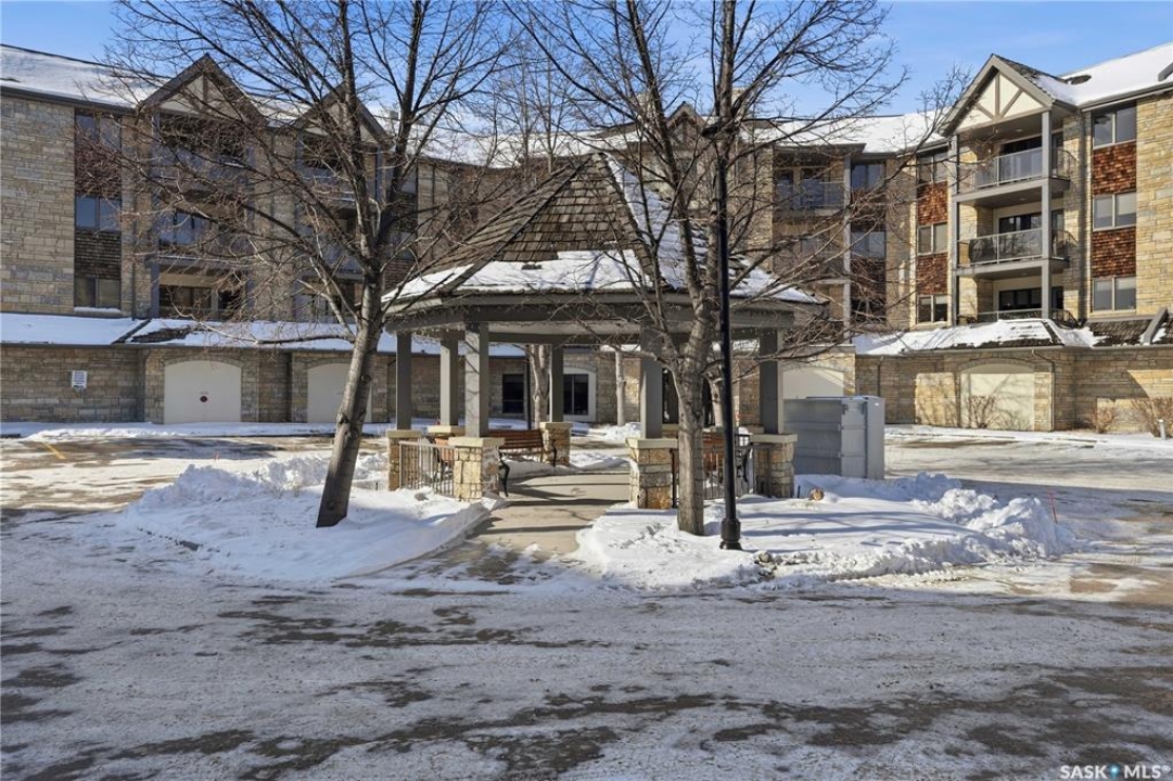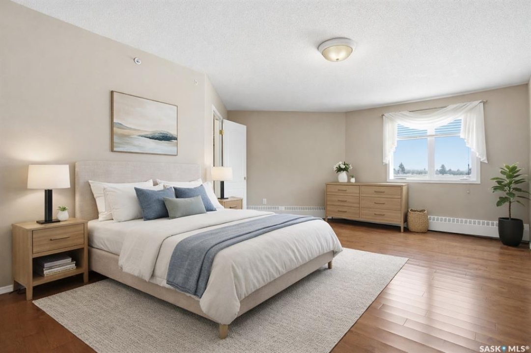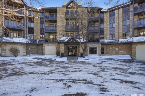 Pristine top floor condo in Marian Park is a show stopper. One of the larger floor plans in the complex at 1326 sq/ft, this 2 bedroom and 2 bathroom condo is move-in ready. Spacious entrance with Duraceramic tiled flooring flows through to the kitchen. Loads of natural light with the east facing balcony overlooking the open space. Bright white kitchen with upgraded appliances including microwave hood fan and Bosch dishwasher, quartz countertops, under cabinet lighting and pot lights. Gleaming engineered hardwood flooring throughout the living room, dining area and two generous bedrooms. The primary bedroom features an oversized walk-in closet and full 3 piece ensuite with tiled flooring. In-suite laundry is conveniently located on the opposite side of the bedrooms and near the main full bathroom. Enjoy your morning sunrise on the large east facing balcony which has natural gas bbq hook up. One underground heated parking stall with additional 60 sq/ft storage locker. Exceptional building with amenities room, exercise area and workshop for those who love to work on smaller projects! Exceptional south Regina location is close to bus stops, grocery stores, shopping, restaurants and a short commute to the airport. Condo fees include heat, water/sewer, reserve fund, common area maintenance and insurance, snow removal, garbage. Don't miss out on this great opportunity before it's too late.