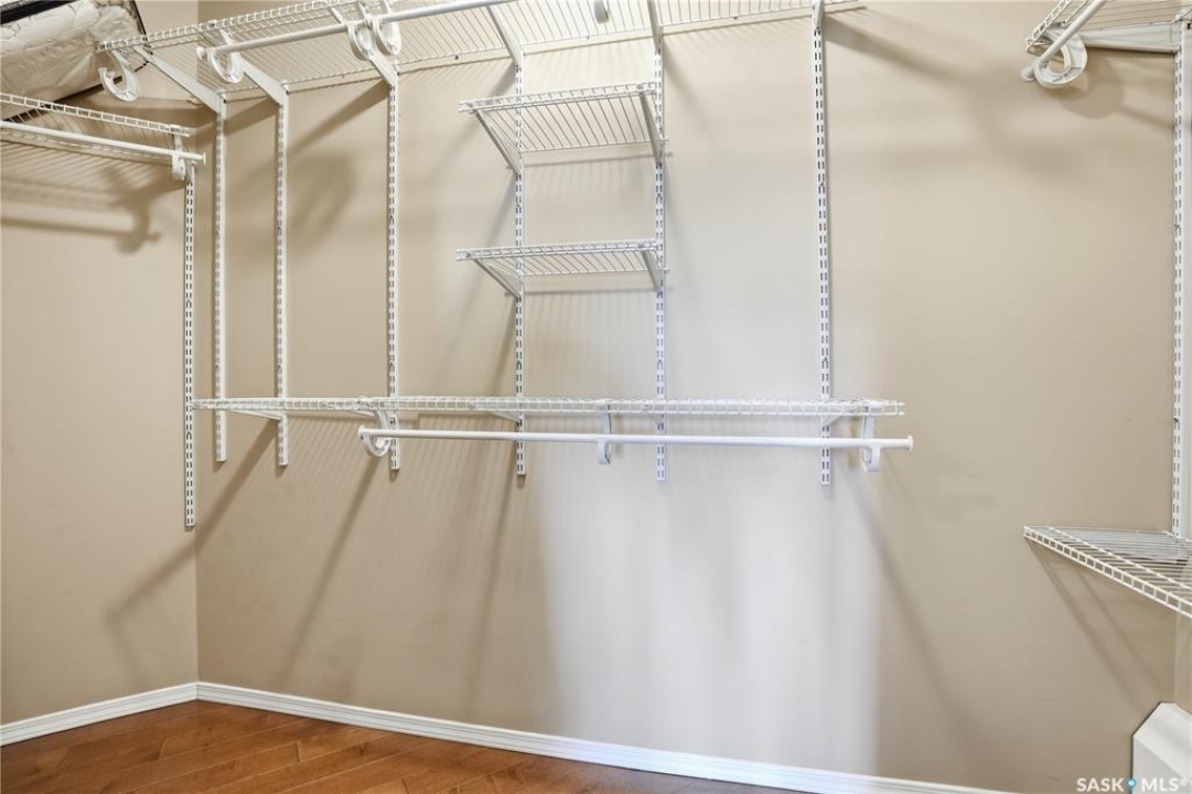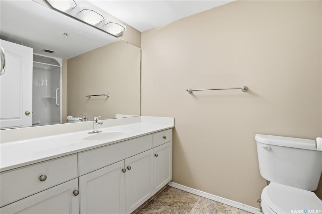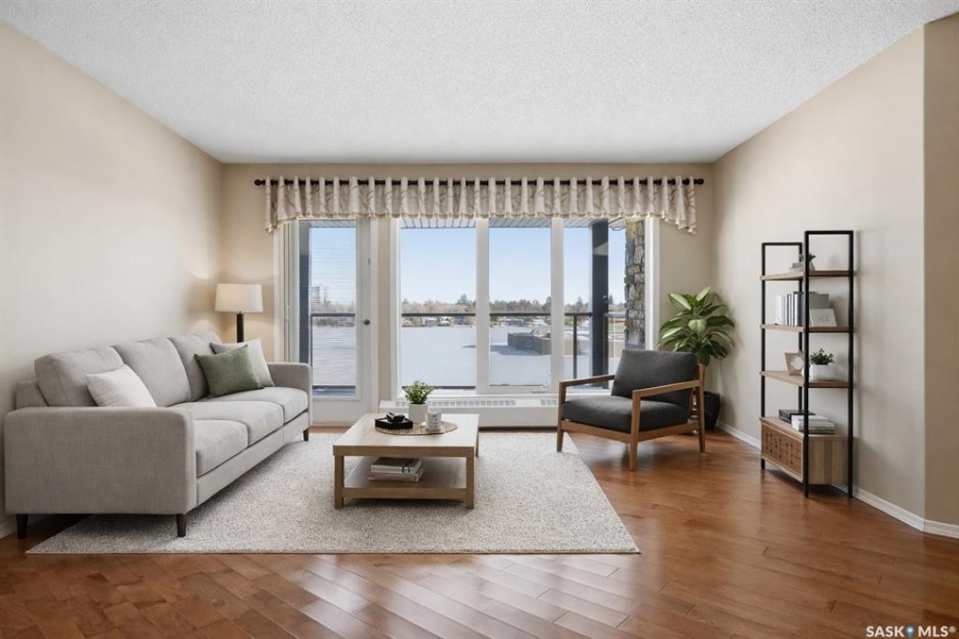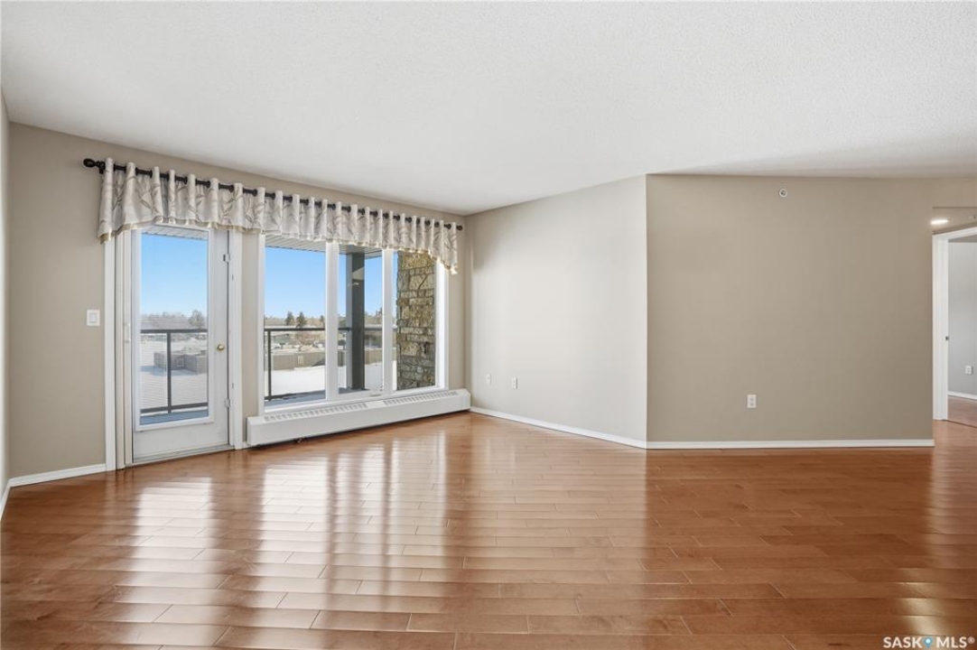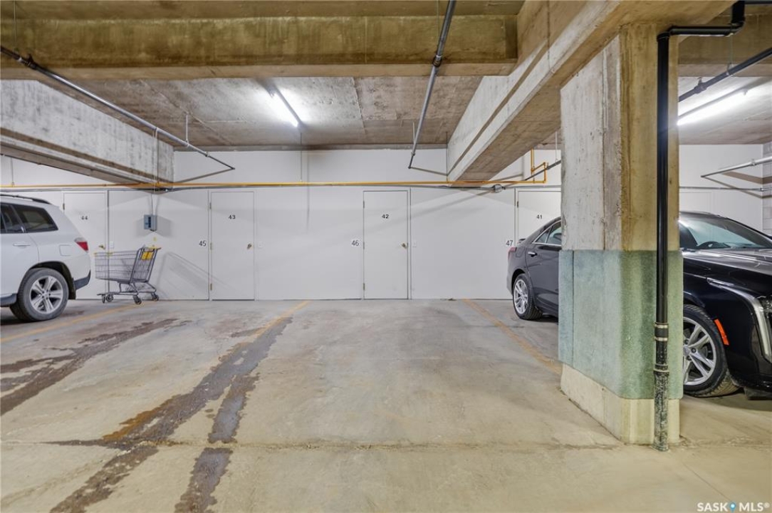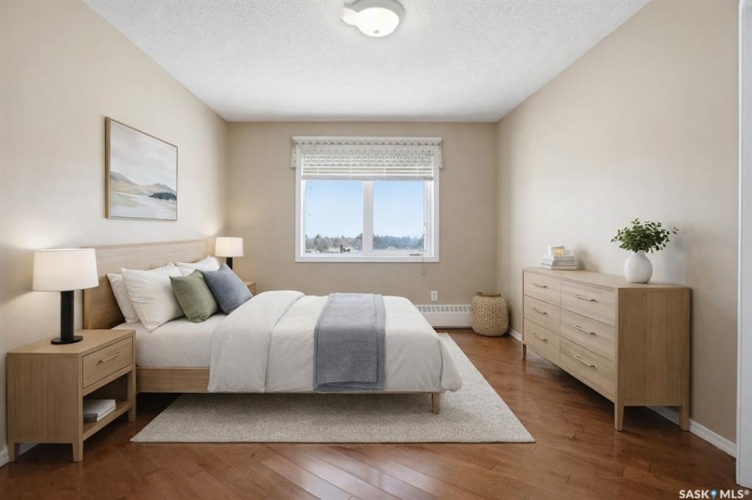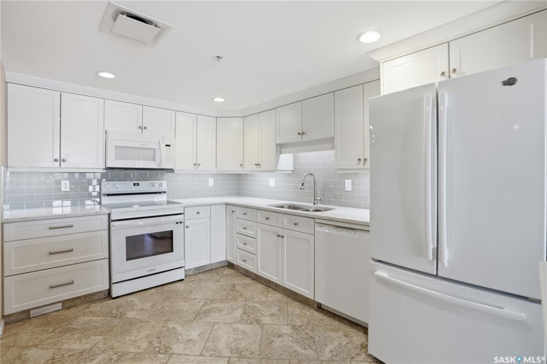 Pristine top floor condo in Marian Park is a show stopper. One of the larger floor plans in the complex at 1326 sq/ft, this 2 bedroom and 2 bathroom condo is move-in ready. Spacious entrance with Duraceramic tiled flooring flows through to the kitchen. Loads of natural light with the east facing balcony overlooking the open space. Bright white kitchen with upgraded appliances including microwave hood fan and Bosch dishwasher, quartz countertops, under cabinet lighting and pot lights. Gleaming engineered hardwood flooring throughout the living room, dining area and two generous bedrooms. The primary bedroom features an oversized walk-in closet and full 3 piece ensuite with tiled flooring. In-suite laundry is conveniently located on the opposite side of the bedrooms and near the main full bathroom. Enjoy your morning sunrise on the large east facing balcony which has natural gas bbq hook up. One underground heated parking stall with additional 60 sq/ft storage locker. Exceptional building with amenities room, exercise area and workshop for those who love to work on smaller projects! Exceptional south Regina location is close to bus stops, grocery stores, shopping, restaurants and a short commute to the airport. Condo fees include heat, water/sewer, reserve fund, common area maintenance and insurance, snow removal, garbage. Don't miss out on this great opportunity before it's too late.