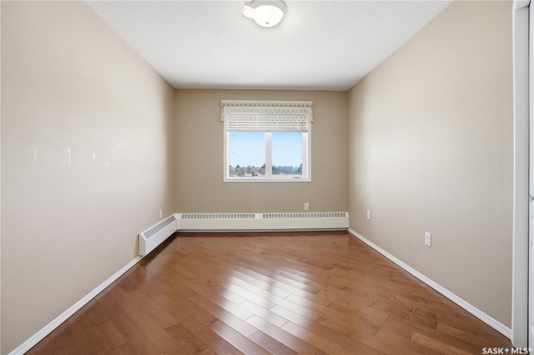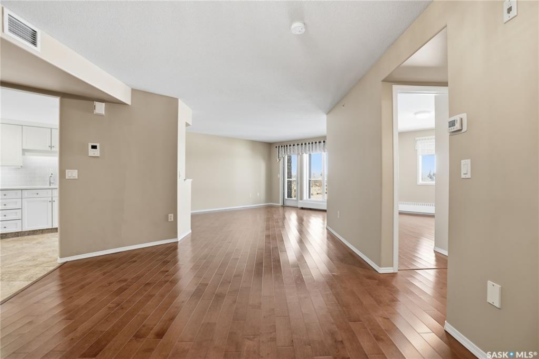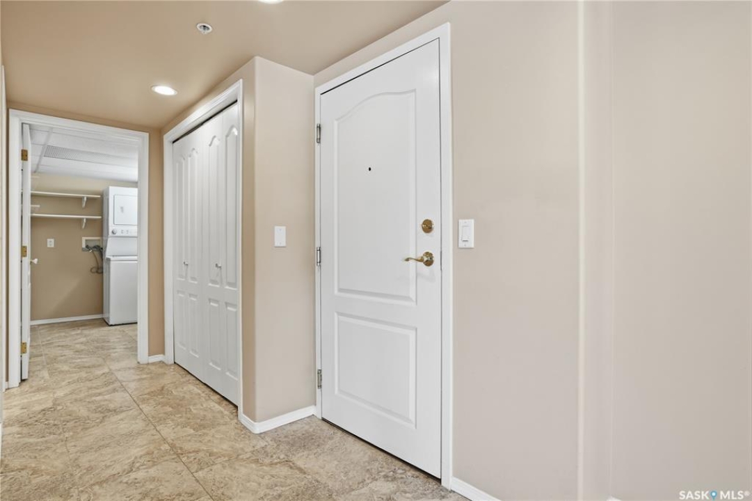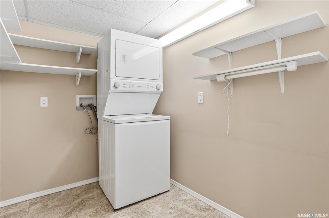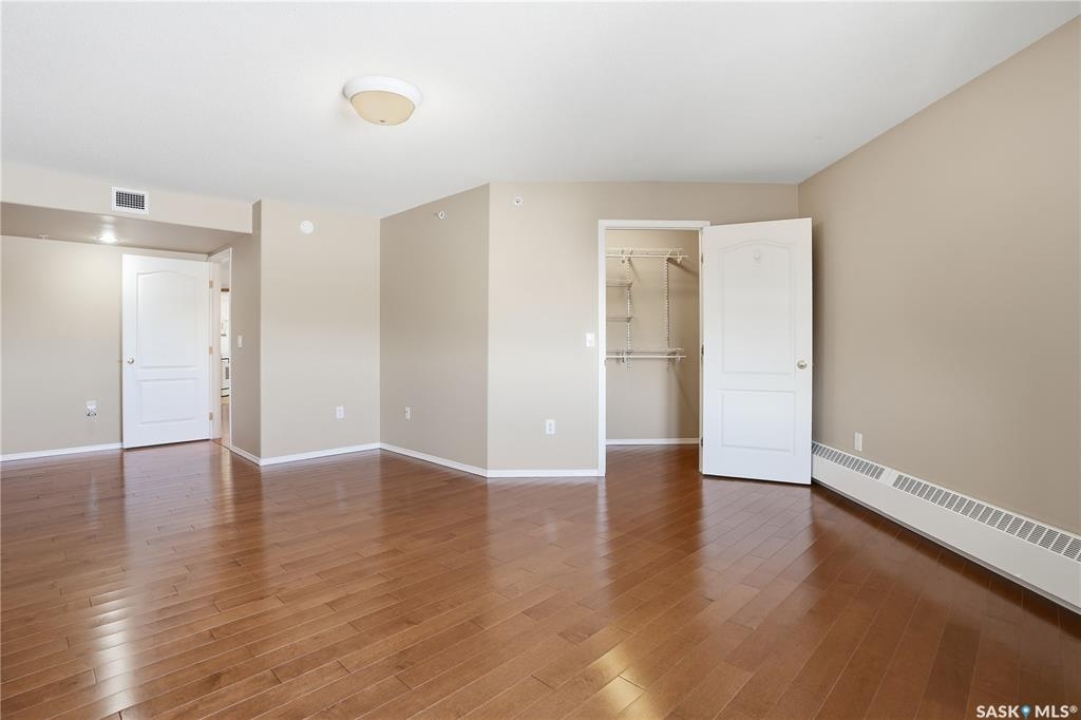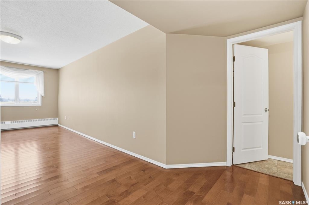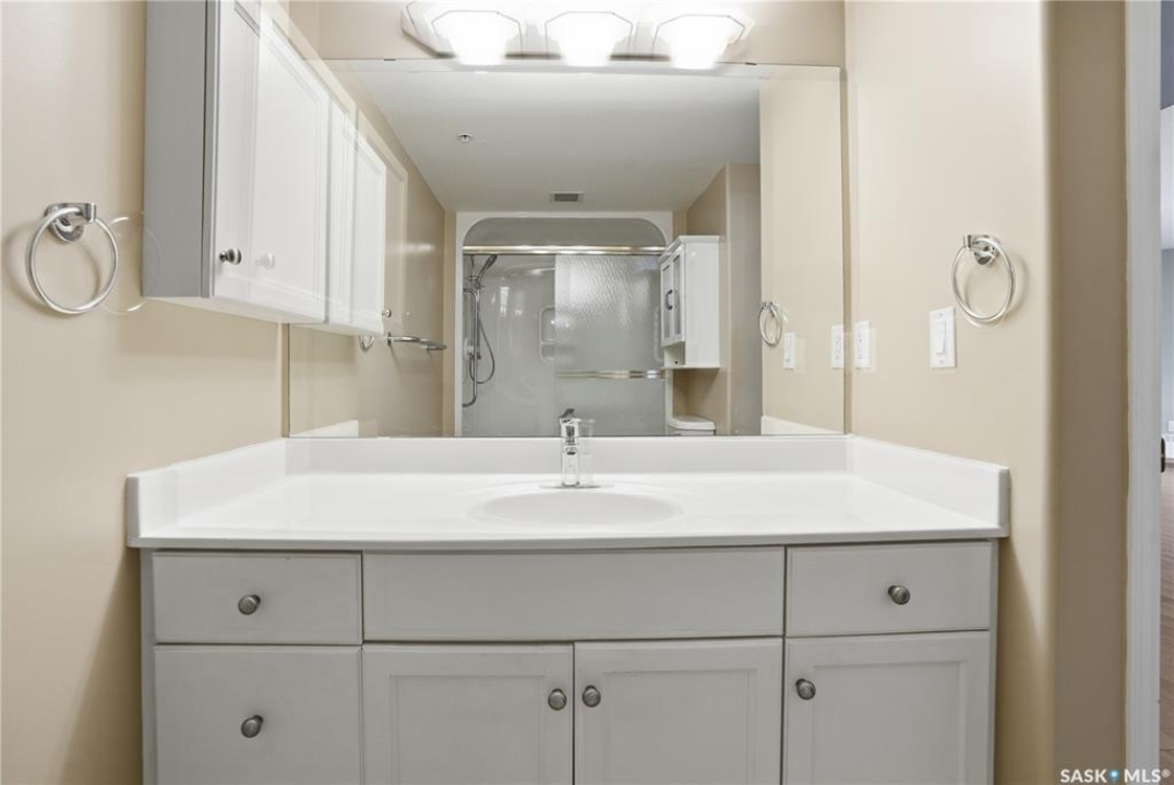 Pristine top floor condo in Marian Park is a show stopper. One of the larger floor plans in the complex at 1326 sq/ft, this 2 bedroom and 2 bathroom condo is move-in ready. Spacious entrance with Duraceramic tiled flooring flows through to the kitchen. Loads of natural light with the east facing balcony overlooking the open space. Bright white kitchen with upgraded appliances including microwave hood fan and Bosch dishwasher, quartz countertops, under cabinet lighting and pot lights. Gleaming engineered hardwood flooring throughout the living room, dining area and two generous bedrooms. The primary bedroom features an oversized walk-in closet and full 3 piece ensuite with tiled flooring. In-suite laundry is conveniently located on the opposite side of the bedrooms and near the main full bathroom. Enjoy your morning sunrise on the large east facing balcony which has natural gas bbq hook up. One underground heated parking stall with additional 60 sq/ft storage locker. Exceptional building with amenities room, exercise area and workshop for those who love to work on smaller projects! Exceptional south Regina location is close to bus stops, grocery stores, shopping, restaurants and a short commute to the airport. Condo fees include heat, water/sewer, reserve fund, common area maintenance and insurance, snow removal, garbage. Don't miss out on this great opportunity before it's too late.