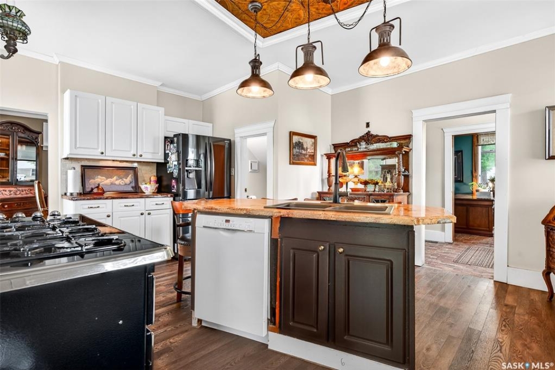 Looking for a once in a lifetime opportunity to own one of the most stunning character homes around? You won't want to miss this one! This 3 storey double brick home boasts 2,600 sq.ft. of living space on 3 floors with 3 bedrooms and 2 bathrooms. Sitting on 4 large corner lots with the most beautiful landscaping around. This iconic home stands out as soon as you see it with its excellent curb appeal. This yard features a vinyl fence, stunning gazebo, custom riverbed, stunning rock gardens, beautiful flowers and a stamped concrete pad with a rock fireplace. The home features a huge covered veranda which welcomes you into a beautiful foyer. Leading into a huge open living / dining room complete with a wood fireplace and beautiful hardwood floors. On the other side of the front door we find an office and second entrance - you are sure to love the real brick flooring. At the back of the home we have a huge kitchen which is sure to impress! Complete with a stunning custom gas stove that matches the era and a beautiful island that ties it all together. Off the kitchen we find one of the cutest sunrooms you can find - you will spend many hours here. Heading upstairs we find a huge second floor balcony with 3 large bedrooms! The primary bedroom features a seating area and a large walk-in closet. There is laundry on the second floor for added convenience. The absolutely stunning 4 piece bathroom will blow you away! From the clawfoot soaker tub to the copper sink or stunning vanity it will impress you. Heading up to the third floor we have a large loft space finished in pine that could be used as a 4th bedroom, playroom or yoga loft! The basement features a large family room, workshop, and lots of storage! If you are looking for a different pace of life Mortlach is an excellent little town. Located just 30 minutes west of Moose Jaw and boasting a K-12 school! There is so much more to see - book your walkthrough today!