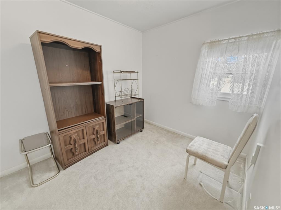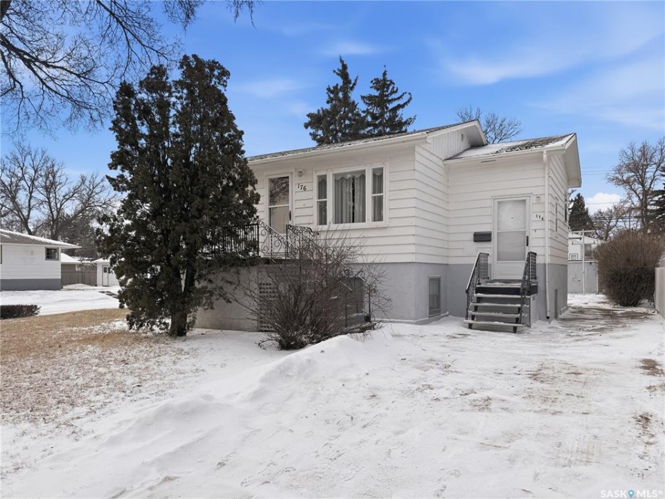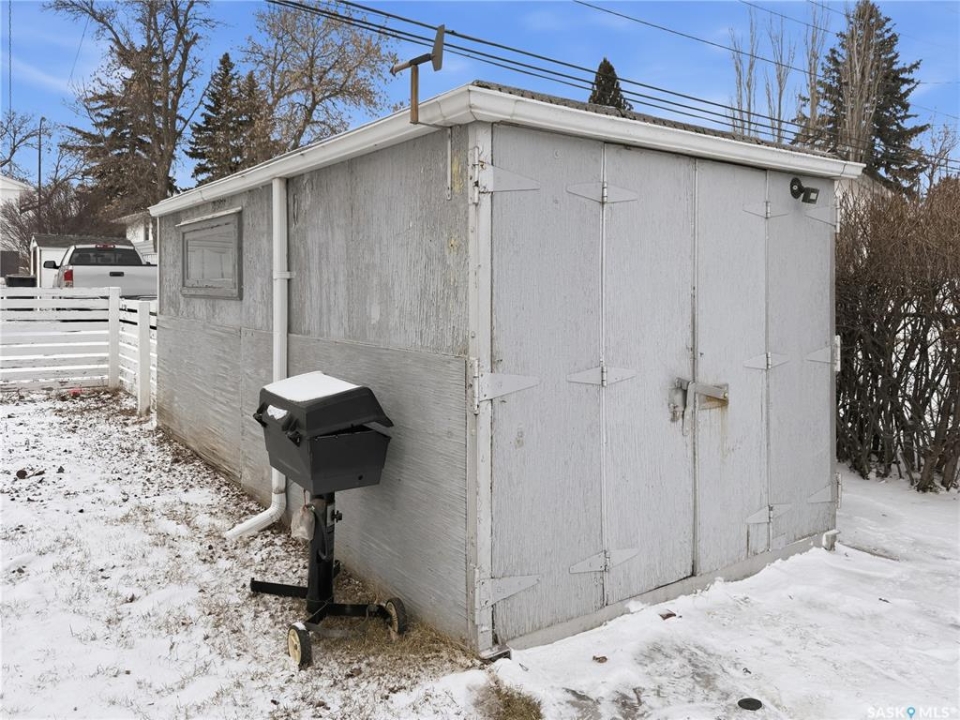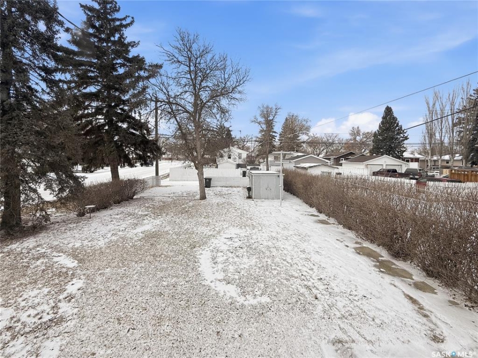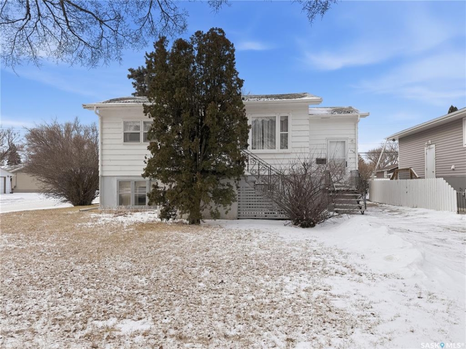 Solid 1959 raised bungalow offering practical space, natural light, and excellent potential for first-time buyers or investors. The main floor features a front porch entry, functional kitchen and dining area with new carpet, a comfortable living room with an east-facing window, two bedrooms, and a four-piece bathroom. The lower level benefits from large windows that bring in plenty of natural light and includes a spacious family room, an additional bedroom, a second bathroom, laundry and utility area, plus a separate storage room. Recent updates include a replaced plumbing stack, main floor tub drain, newer garburator, and carpet in the dining room. Previous improvements include a 100-amp electrical panel with metal mast, updated furnace, and hot water heater (replaced in 2020). Additional exterior storage is available under the porch and front steps. Situated on a corner lot with off-street parking at both the front and rear, the property also offers a powered shed ideal for tools and yard equipment. Convenient southeast location within easy walking distance to Pioneer Co-op grocery store, gas station, and liquor store. Affordable payments make this a great entry-level home or revenue property opportunity.
