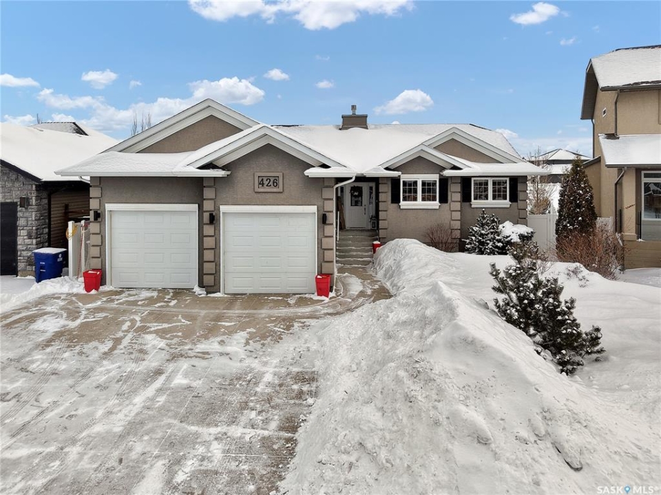 Welcome to 426 Lyle Cres, located in Warman Legends area! This bungalow backs park space and has unobstructed views of the golf course from the back yard and it is the perfect place to raise a family and call home. Upon entering, you are greeted with a large bright foyer, the open concept home with big kitchen space 8' Island with sink and a corner pantry and loads of cabinets. Dinning space with door to deck with park & golf course views. The living room features 2 sided gas fireplace, tons of natural light. Laminate flooring in living kitchen and dinning area in a tasteful neutral tone. Down the hallway to 2 additional bedrooms and a 4pce bath, the primary bedroom is spacious with a large walk-in closet, and 4pc ensuite with large soaker tub and a shower. The basement is partially developed with bedroom and 4pce bath bath & laundry room completed with permits closed. The remainder of the basement is fully framed with a large family room space, a 5th bedroom with walk in closet and a large storage room. The oversized 24W X (27.10 + 36.2) deep double attached with added work space and a drive thru door to back yard is heated/fully insulated. The backyard is a lovely oasis, fully fenced and landscaped, raised garden beds, overlooking green space and golf course. Located in the Legends area home is close to additional parks as well as a ton of neighbourhood amenities, making it the perfect option for any type of family. Call your REALTOR �? to set up a private showing today!