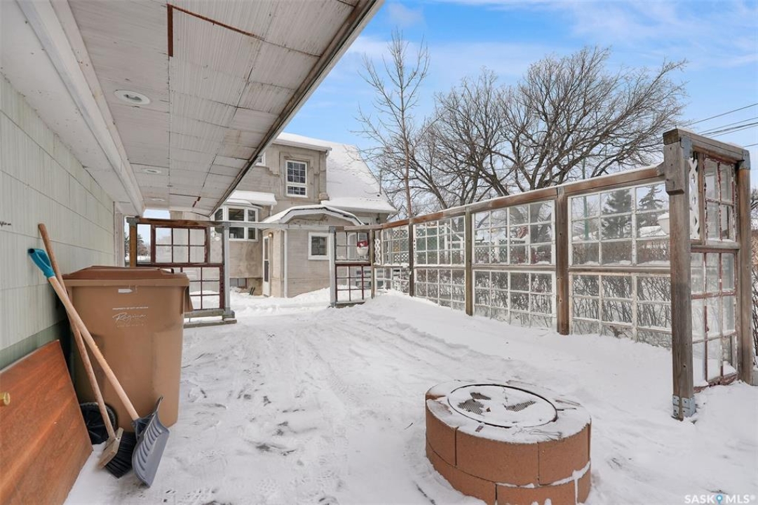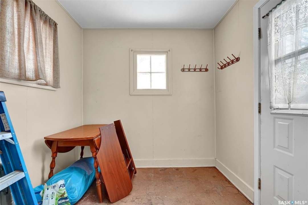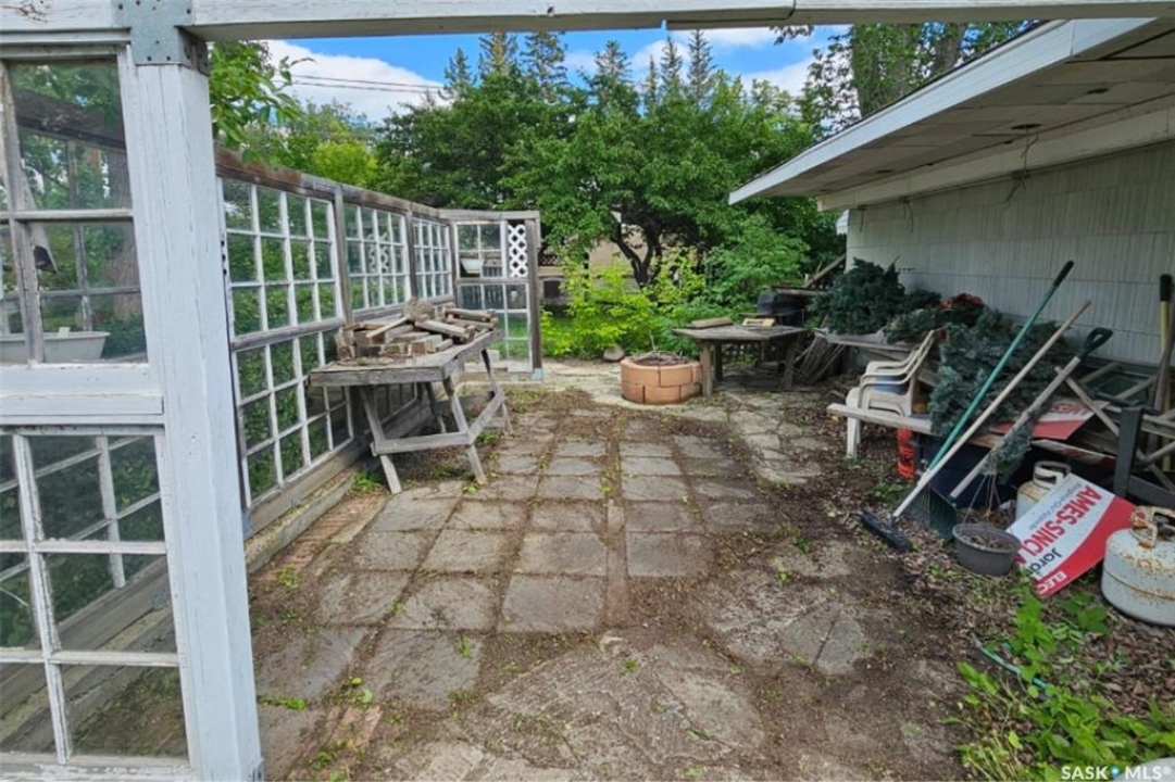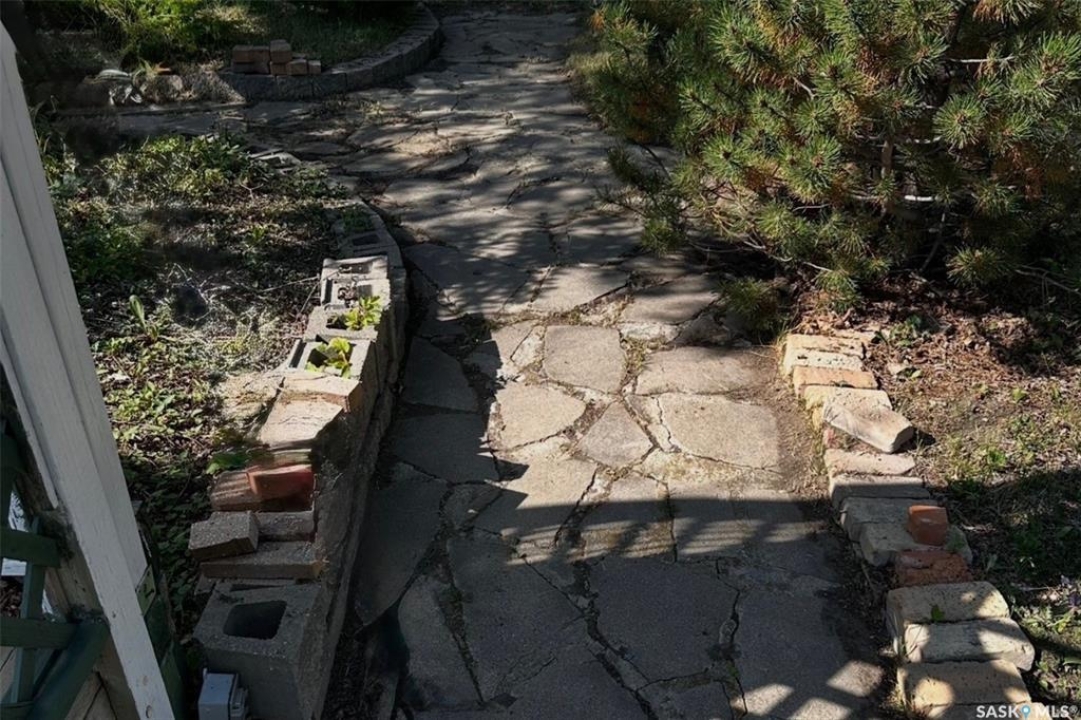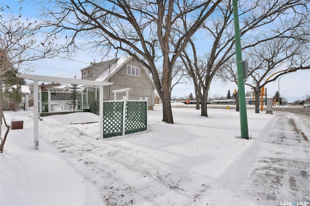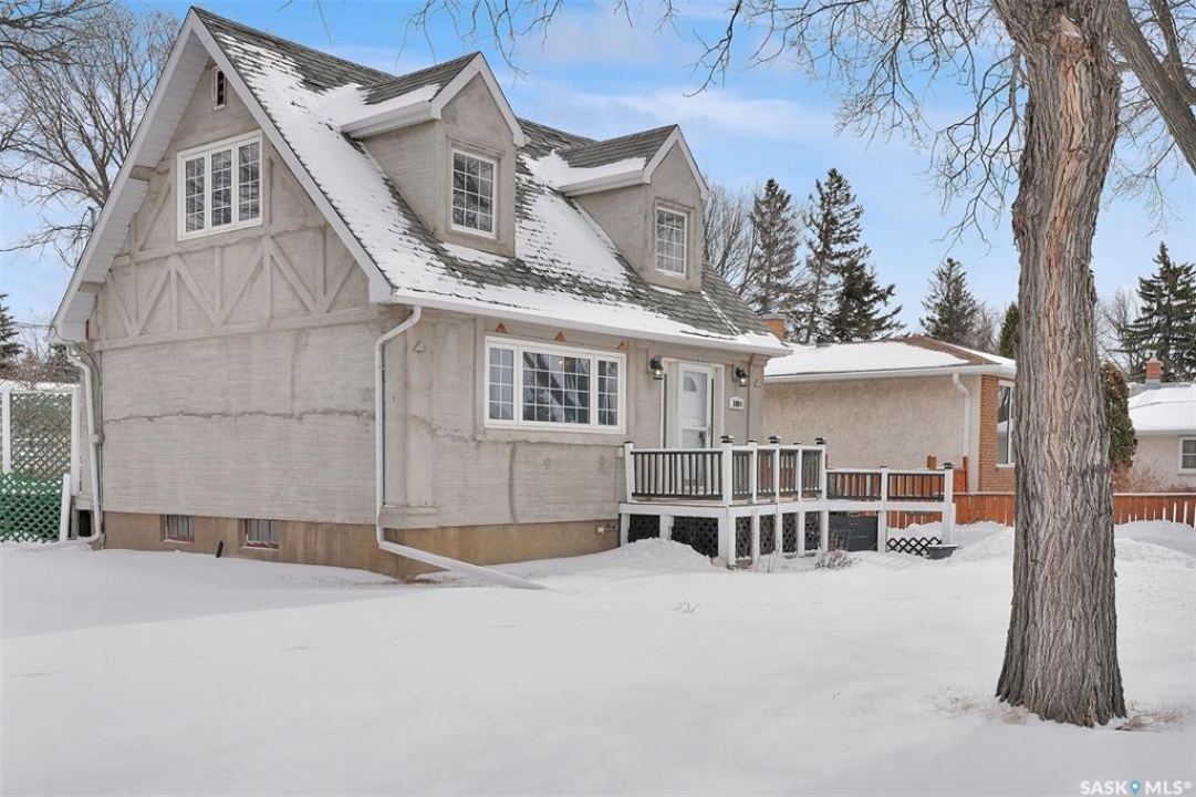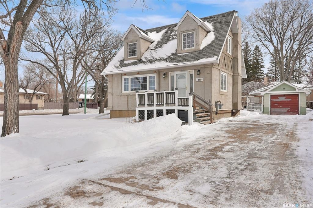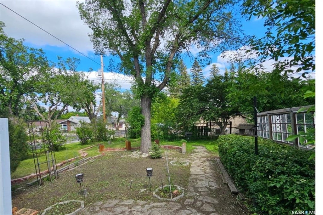 Welcome to this charming one-and-a-half-storey home set on a double-sized corner lot with access from both Broad Street & 6th Avenue North. This 1945 classic blends character, light & versatility—offering a layout that can adapt to many lifestyles. The exterior has been base-coated & ready to personalize. Inside you are greeted by a spacious front entry that opens into the bright living room & lovely sightline toward the kitchen. Natural light pours into this home from every direction thanks to updated windows throughout (excluding the kitchen). The living room features a picture window & flows seamlessly to the L-shaped dining area, where garden doors lead outside. Hardwood under carpet. The U-shaped kitchen provides excellent cabinet & counter space, along with a garden window overlooking the backyard—perfect for plants or simply enjoying the view. A cozy nook off the kitchen serves perfectly as a small eating area or workspace. Upstairs, a generous landing window brightens the staircase. The crisp renovated main bathroom includes a glass tub door & convenient access to a walk-in cedar closet with built-in shelving and storage space. The two upstairs bedrooms are both very good sizes, each featuring two windows, built-in desks tucked into the dormer spaces, ample closet storage & access to additional attic storage—classic character. A French door leads to the back entry and the enclosed back porch with drywalled walls and electrical plug.. The basement stairs are wide and comfortable leading to bright open space ready for your personal touch. There is a functional 3-piece bath & laundry area. The yard is expansive with a deck, walking path, decorative dividers with glass inserts, mature trees, fire-pit area, single garage & plenty of parking. Sidewalk on 6th Ave N was made accessible to back yard. Located close to public transit, schools, shopping, and everyday amenities, this is a home that welcomes you —and invites you to make it your own.