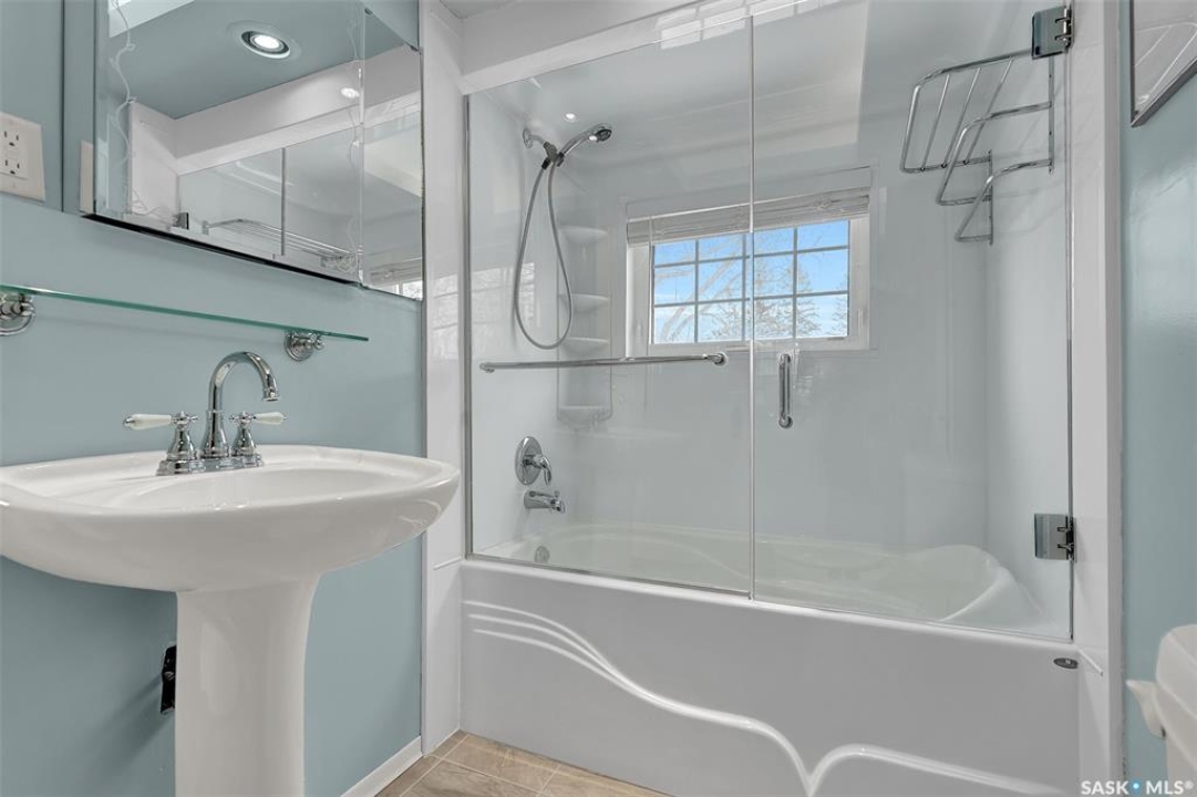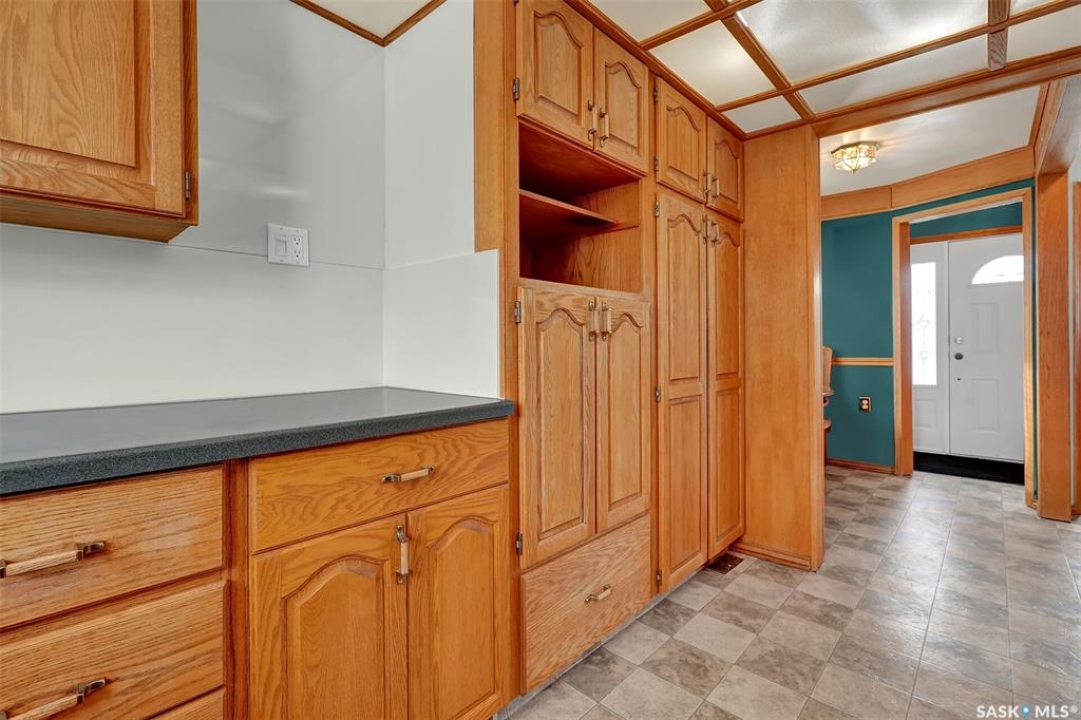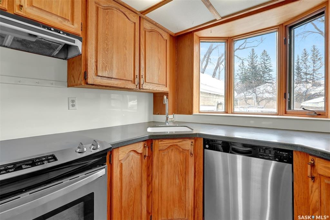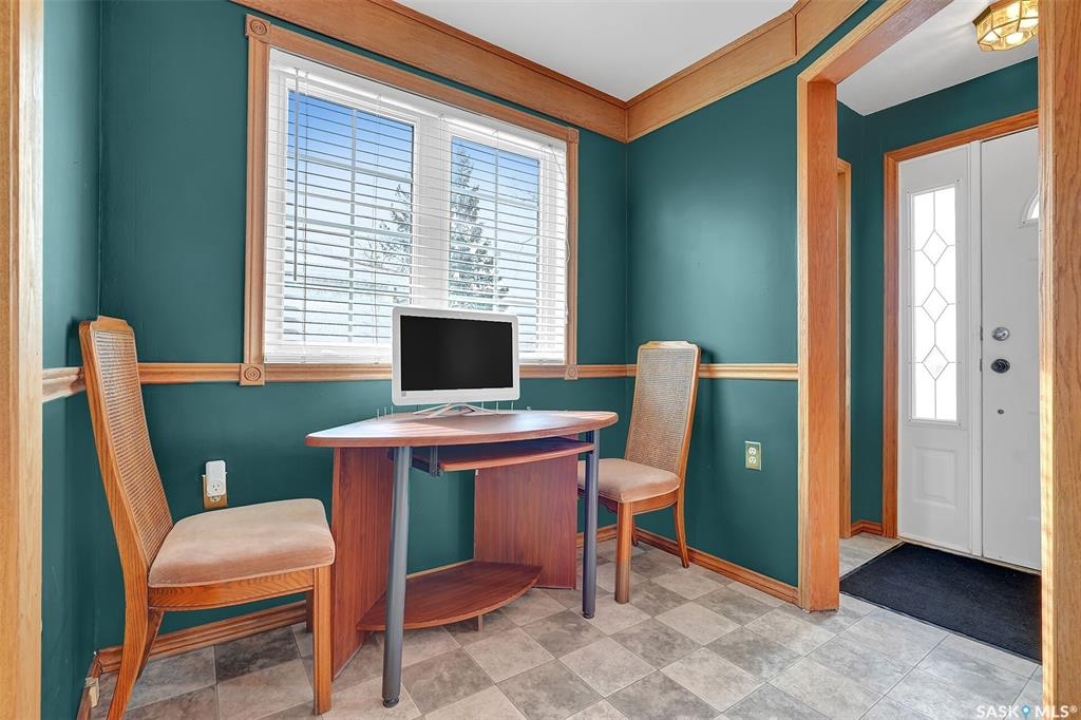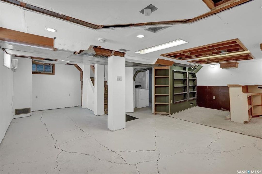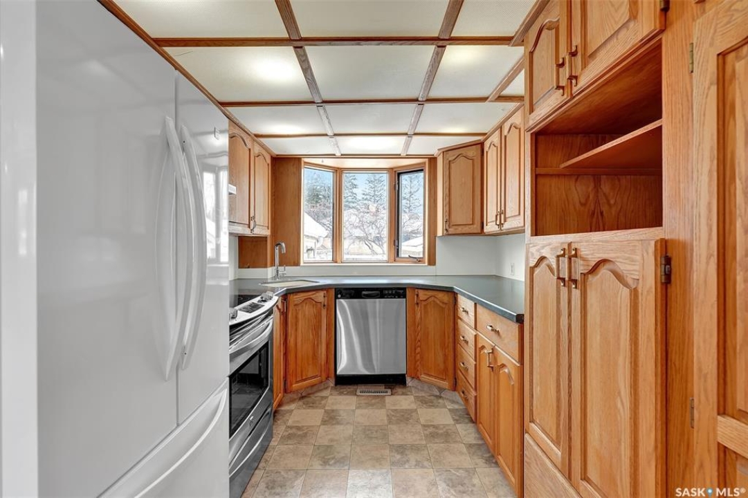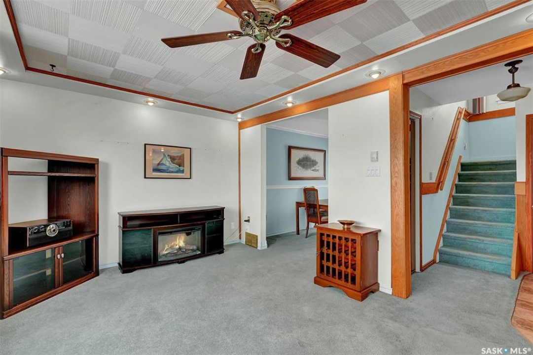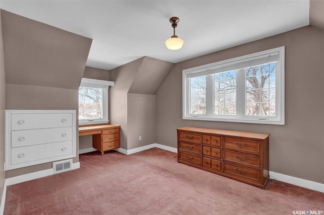 Welcome to this charming one-and-a-half-storey home set on a double-sized corner lot with access from both Broad Street & 6th Avenue North. This 1945 classic blends character, light & versatility—offering a layout that can adapt to many lifestyles. The exterior has been base-coated & ready to personalize. Inside you are greeted by a spacious front entry that opens into the bright living room & lovely sightline toward the kitchen. Natural light pours into this home from every direction thanks to updated windows throughout (excluding the kitchen). The living room features a picture window & flows seamlessly to the L-shaped dining area, where garden doors lead outside. Hardwood under carpet. The U-shaped kitchen provides excellent cabinet & counter space, along with a garden window overlooking the backyard—perfect for plants or simply enjoying the view. A cozy nook off the kitchen serves perfectly as a small eating area or workspace. Upstairs, a generous landing window brightens the staircase. The crisp renovated main bathroom includes a glass tub door & convenient access to a walk-in cedar closet with built-in shelving and storage space. The two upstairs bedrooms are both very good sizes, each featuring two windows, built-in desks tucked into the dormer spaces, ample closet storage & access to additional attic storage—classic character. A French door leads to the back entry and the enclosed back porch with drywalled walls and electrical plug.. The basement stairs are wide and comfortable leading to bright open space ready for your personal touch. There is a functional 3-piece bath & laundry area. The yard is expansive with a deck, walking path, decorative dividers with glass inserts, mature trees, fire-pit area, single garage & plenty of parking. Sidewalk on 6th Ave N was made accessible to back yard. Located close to public transit, schools, shopping, and everyday amenities, this is a home that welcomes you —and invites you to make it your own.