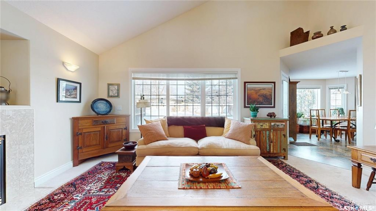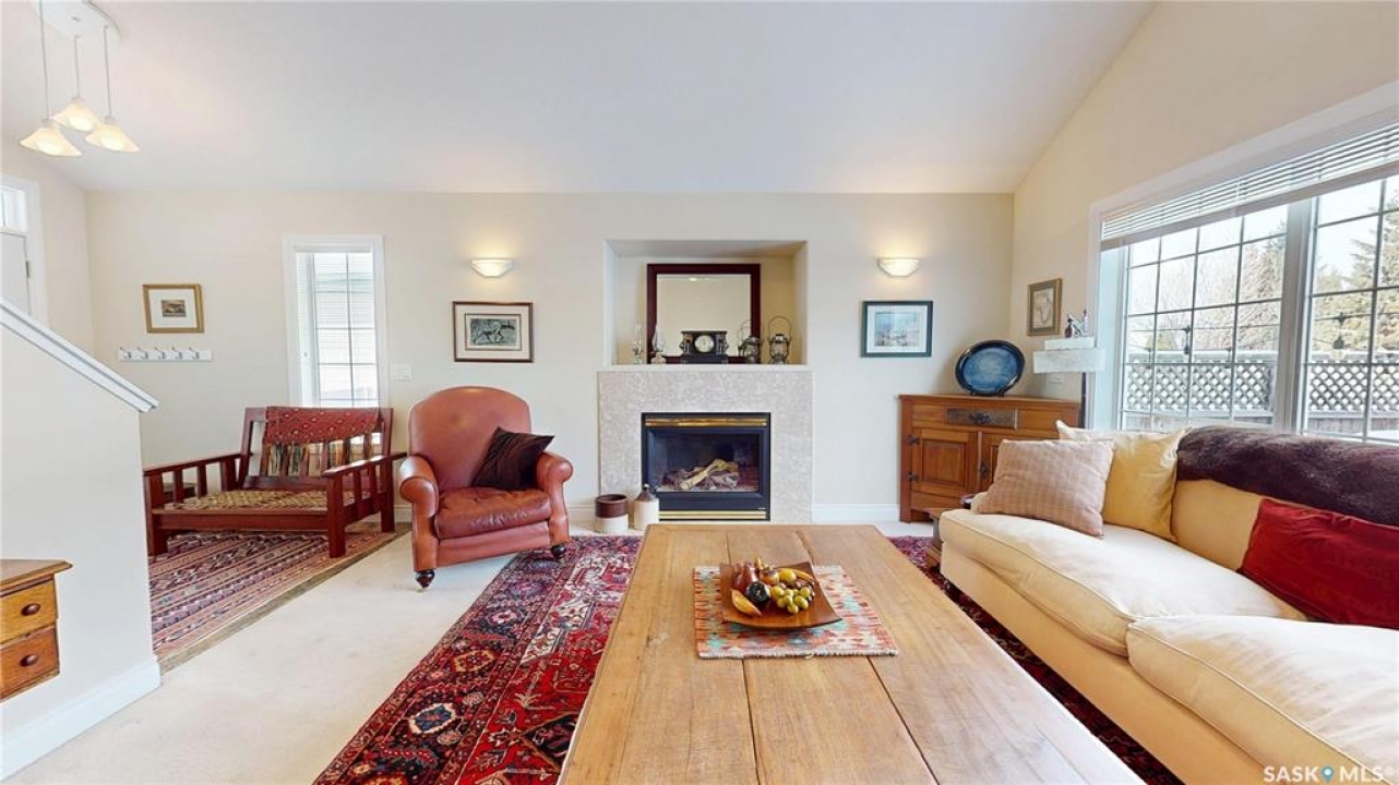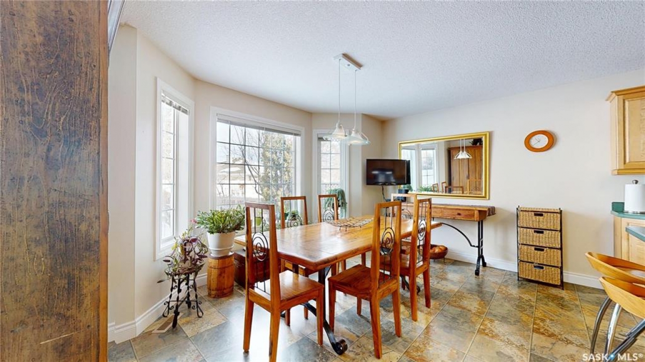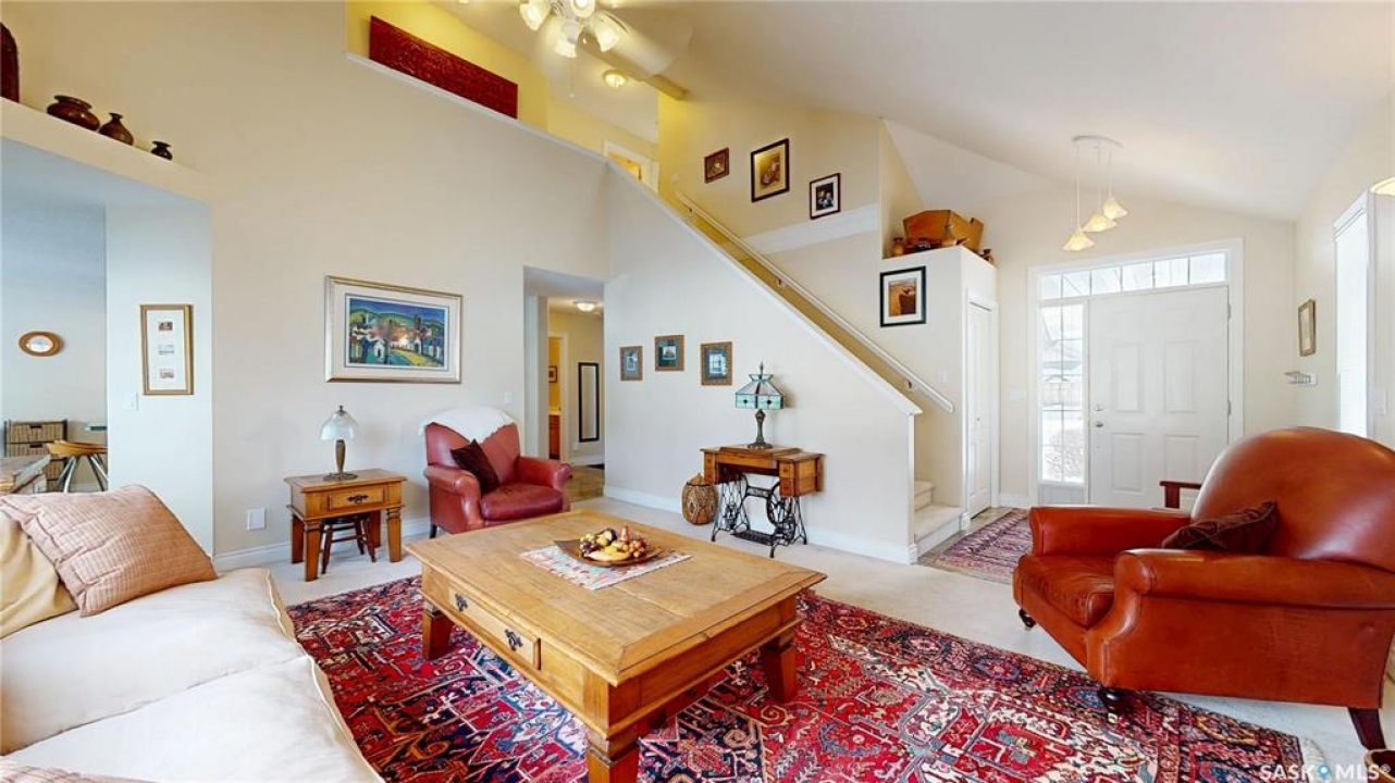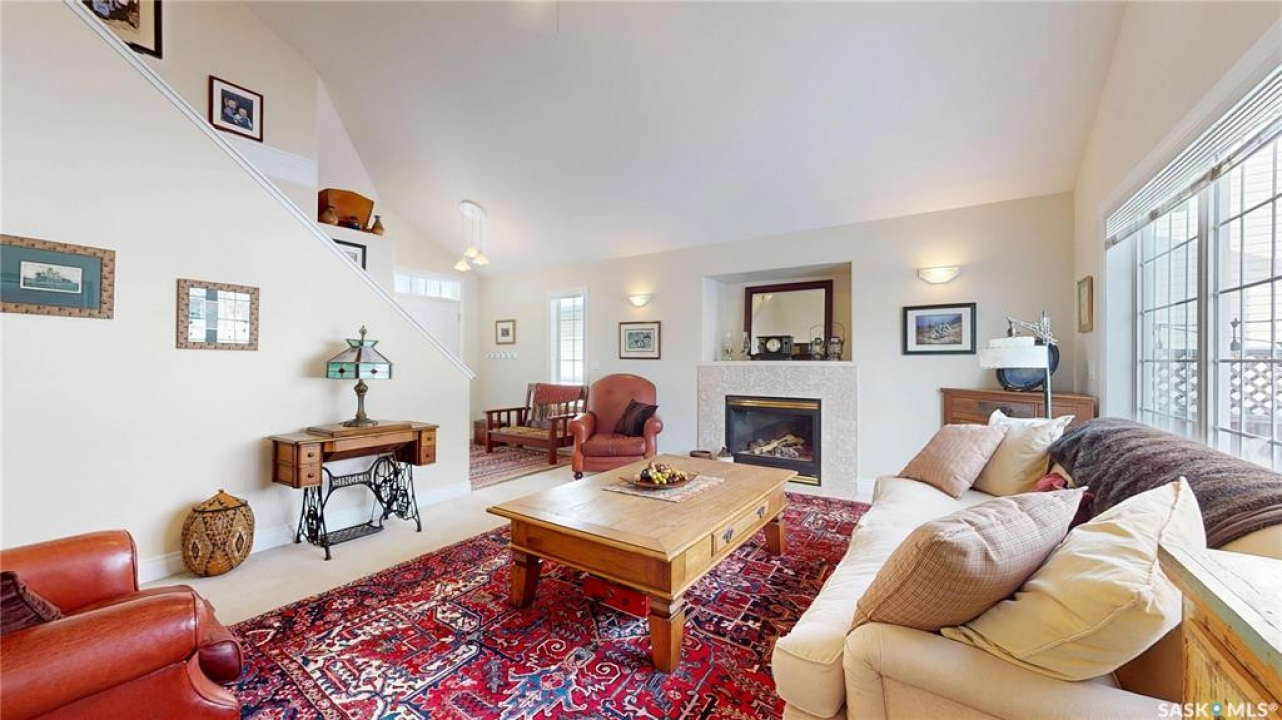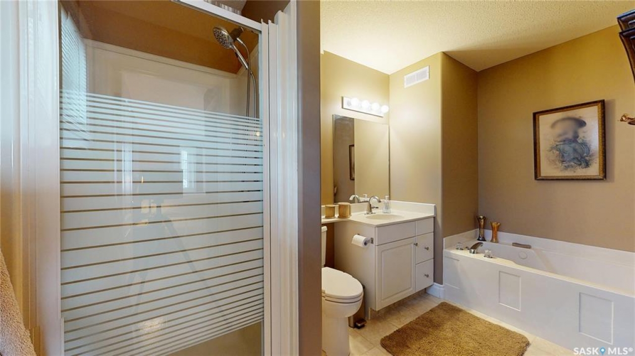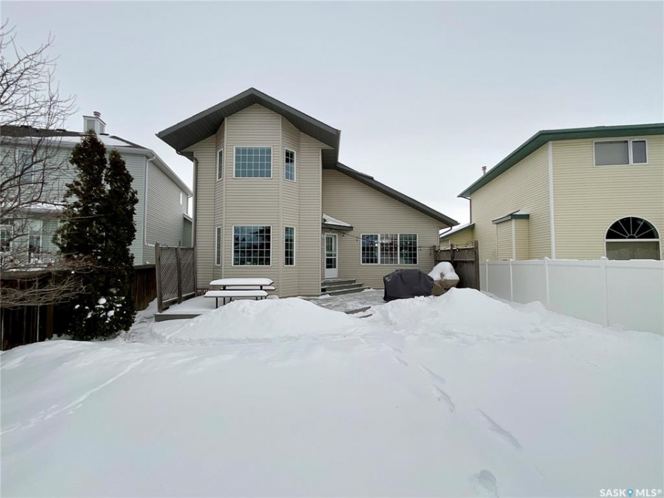 Welcome home to this beautifully maintained 1,739 sq. ft. two-storey split in the highly sought-after neighbourhood of Wascana View. Ideally located and thoughtfully designed, this home offers spacious living areas and a stunning backyard retreat. Step inside to a grand living room highlighted by soaring two-storey vaulted ceilings, large windows overlooking the yard, and a cozy gas fireplace creating a bright, inviting space perfect for both relaxing and entertaining. The kitchen features warm maple cabinetry, an island, ample counter space, and updated appliances. It flows seamlessly into the dining area, where a charming bay window and direct access to the backyard make everyday meals and gatherings effortless. The half bath and laundry complete the main floor. Upstairs, you'll find three generously sized bedrooms and two full bathrooms. The spacious primary suite features a walk-in closet and a private en-suite with a separate shower and jetted tub. The lower level adds valuable living space with a large family room, the fourth bedroom, abundant storage, and a room already roughed in for a future full bathroom, providing flexibility for growing families or guests. Outside, the beautifully landscaped backyard is truly a standout feature. Mature trees, shrubs, flowers, a garden area, a fire pit, and a deck combine to create a private outdoor oasis perfect for relaxing or entertaining. Completing the home is an oversized 24x24 double attached garage, fully insulated for year-round comfort. Lovingly cared for over the years, including a new roof installed in 2018. This is a wonderful home, ready for its next proud owners!