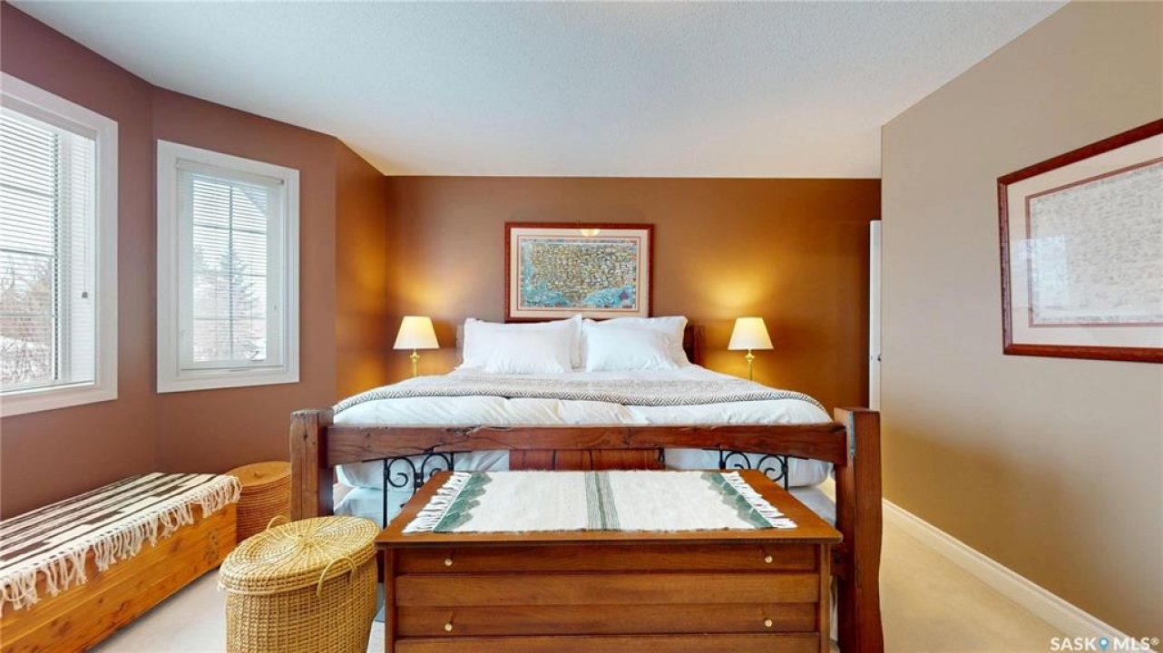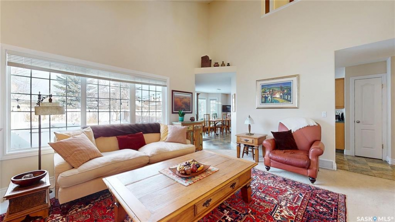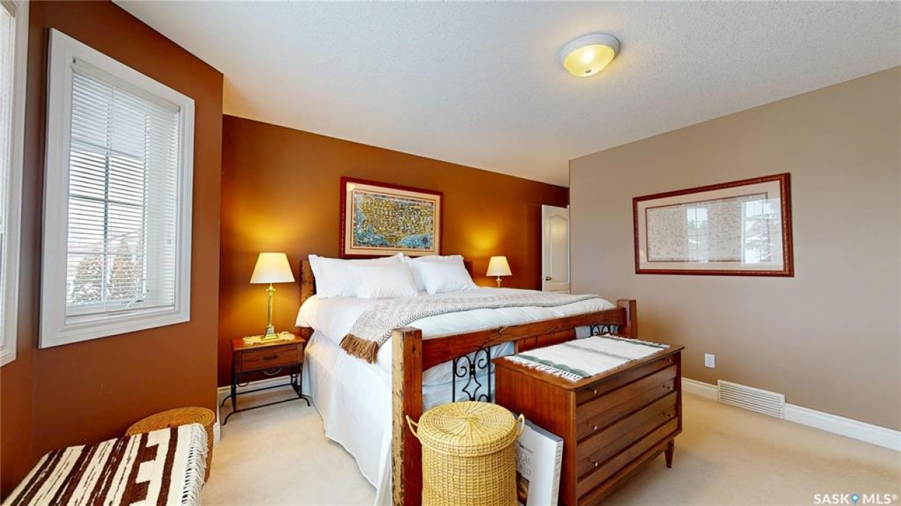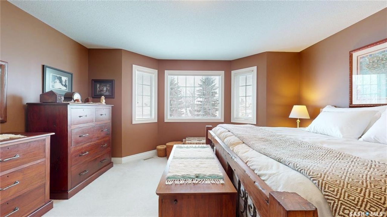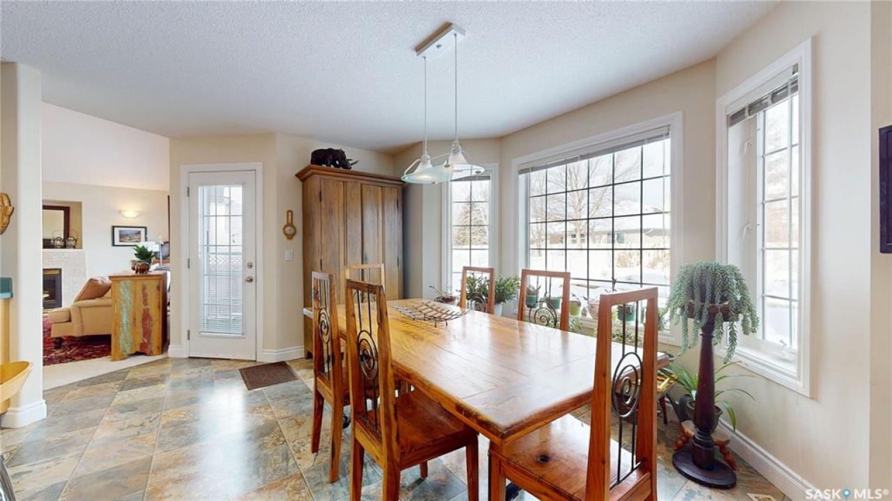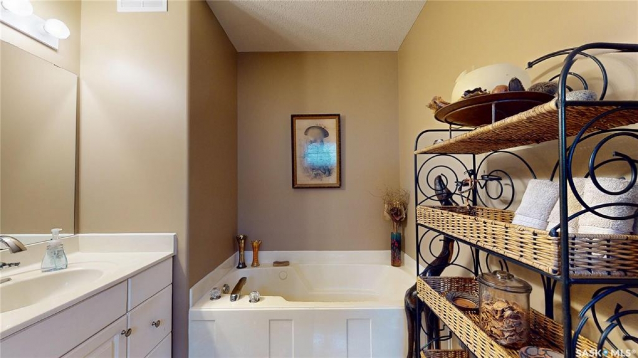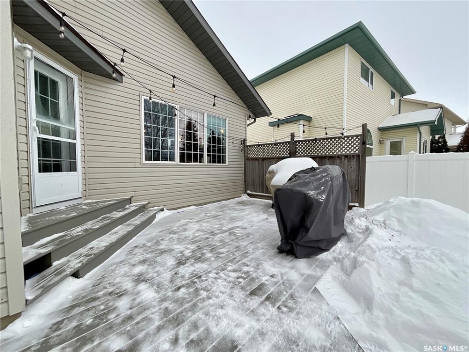 Welcome home to this beautifully maintained 1,739 sq. ft. two-storey split in the highly sought-after neighbourhood of Wascana View. Ideally located and thoughtfully designed, this home offers spacious living areas and a stunning backyard retreat. Step inside to a grand living room highlighted by soaring two-storey vaulted ceilings, large windows overlooking the yard, and a cozy gas fireplace creating a bright, inviting space perfect for both relaxing and entertaining. The kitchen features warm maple cabinetry, an island, ample counter space, and updated appliances. It flows seamlessly into the dining area, where a charming bay window and direct access to the backyard make everyday meals and gatherings effortless. The half bath and laundry complete the main floor. Upstairs, you'll find three generously sized bedrooms and two full bathrooms. The spacious primary suite features a walk-in closet and a private en-suite with a separate shower and jetted tub. The lower level adds valuable living space with a large family room, the fourth bedroom, abundant storage, and a room already roughed in for a future full bathroom, providing flexibility for growing families or guests. Outside, the beautifully landscaped backyard is truly a standout feature. Mature trees, shrubs, flowers, a garden area, a fire pit, and a deck combine to create a private outdoor oasis perfect for relaxing or entertaining. Completing the home is an oversized 24x24 double attached garage, fully insulated for year-round comfort. Lovingly cared for over the years, including a new roof installed in 2018. This is a wonderful home, ready for its next proud owners!