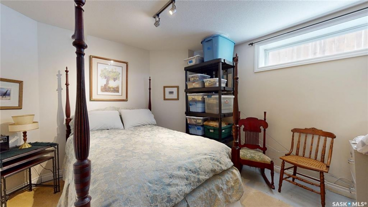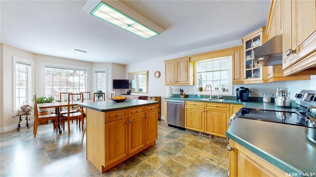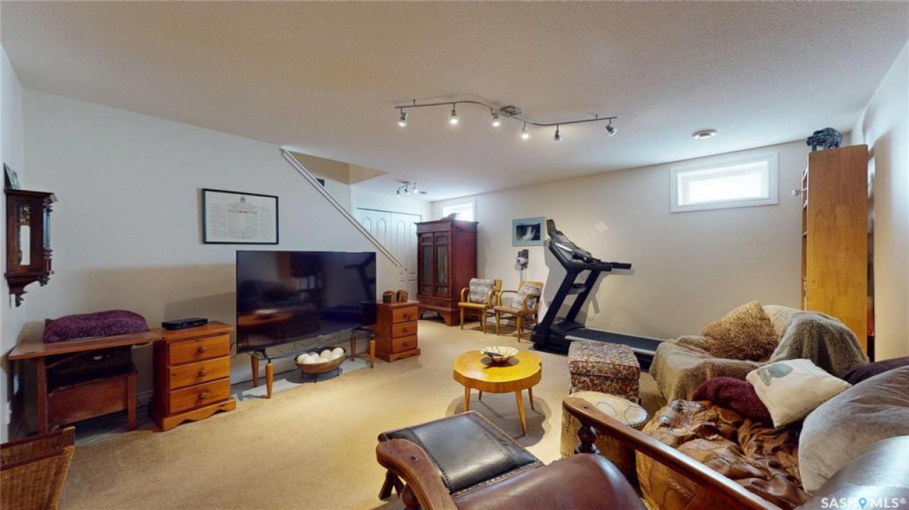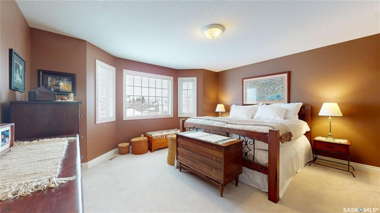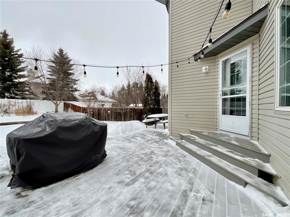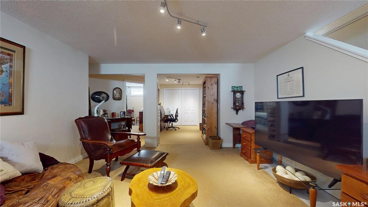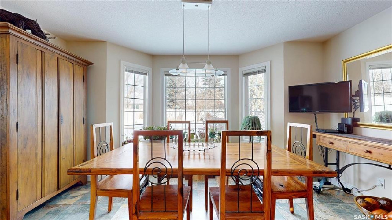 Welcome home to this beautifully maintained 1,739 sq. ft. two-storey split in the highly sought-after neighbourhood of Wascana View. Ideally located and thoughtfully designed, this home offers spacious living areas and a stunning backyard retreat. Step inside to a grand living room highlighted by soaring two-storey vaulted ceilings, large windows overlooking the yard, and a cozy gas fireplace creating a bright, inviting space perfect for both relaxing and entertaining. The kitchen features warm maple cabinetry, an island, ample counter space, and updated appliances. It flows seamlessly into the dining area, where a charming bay window and direct access to the backyard make everyday meals and gatherings effortless. The half bath and laundry complete the main floor. Upstairs, you'll find three generously sized bedrooms and two full bathrooms. The spacious primary suite features a walk-in closet and a private en-suite with a separate shower and jetted tub. The lower level adds valuable living space with a large family room, the fourth bedroom, abundant storage, and a room already roughed in for a future full bathroom, providing flexibility for growing families or guests. Outside, the beautifully landscaped backyard is truly a standout feature. Mature trees, shrubs, flowers, a garden area, a fire pit, and a deck combine to create a private outdoor oasis perfect for relaxing or entertaining. Completing the home is an oversized 24x24 double attached garage, fully insulated for year-round comfort. Lovingly cared for over the years, including a new roof installed in 2018. This is a wonderful home, ready for its next proud owners!