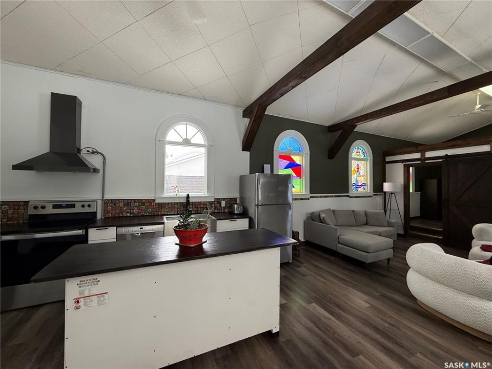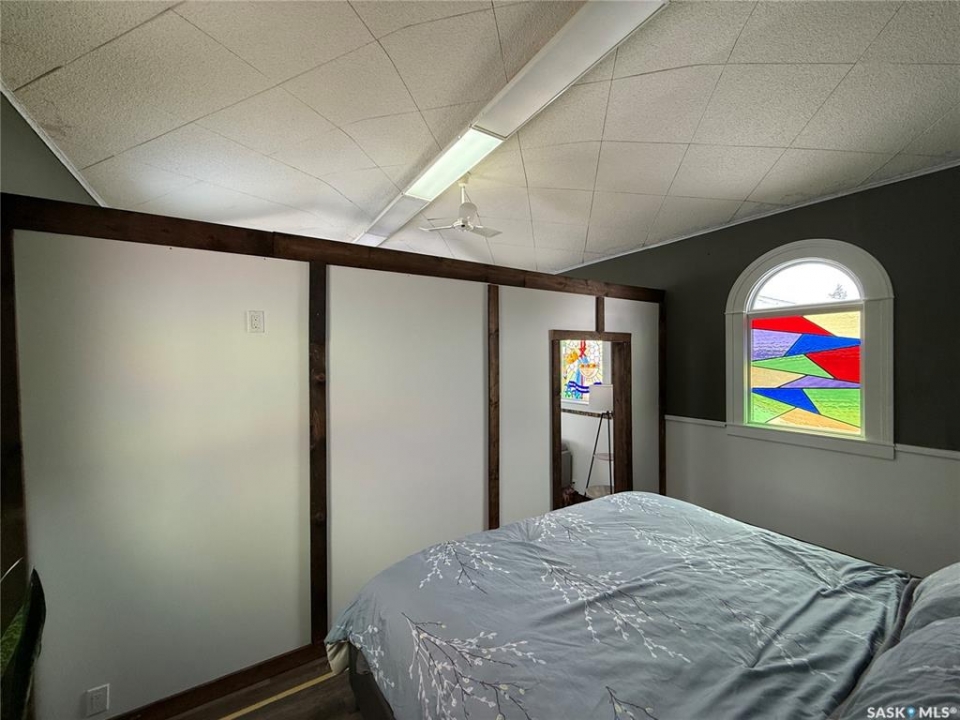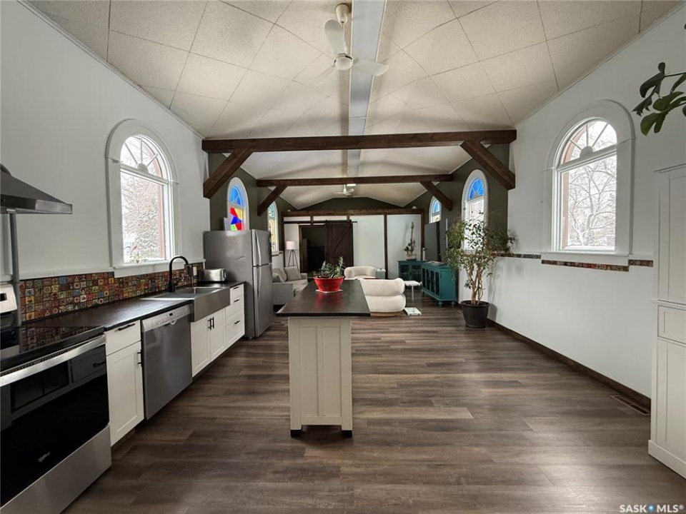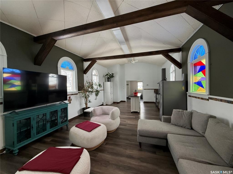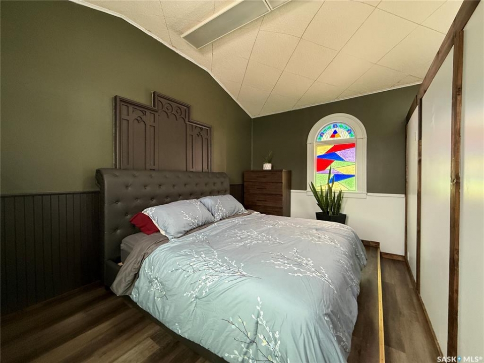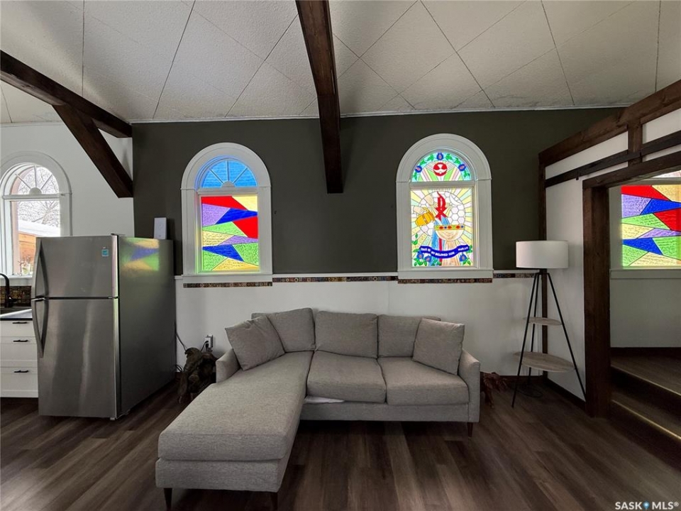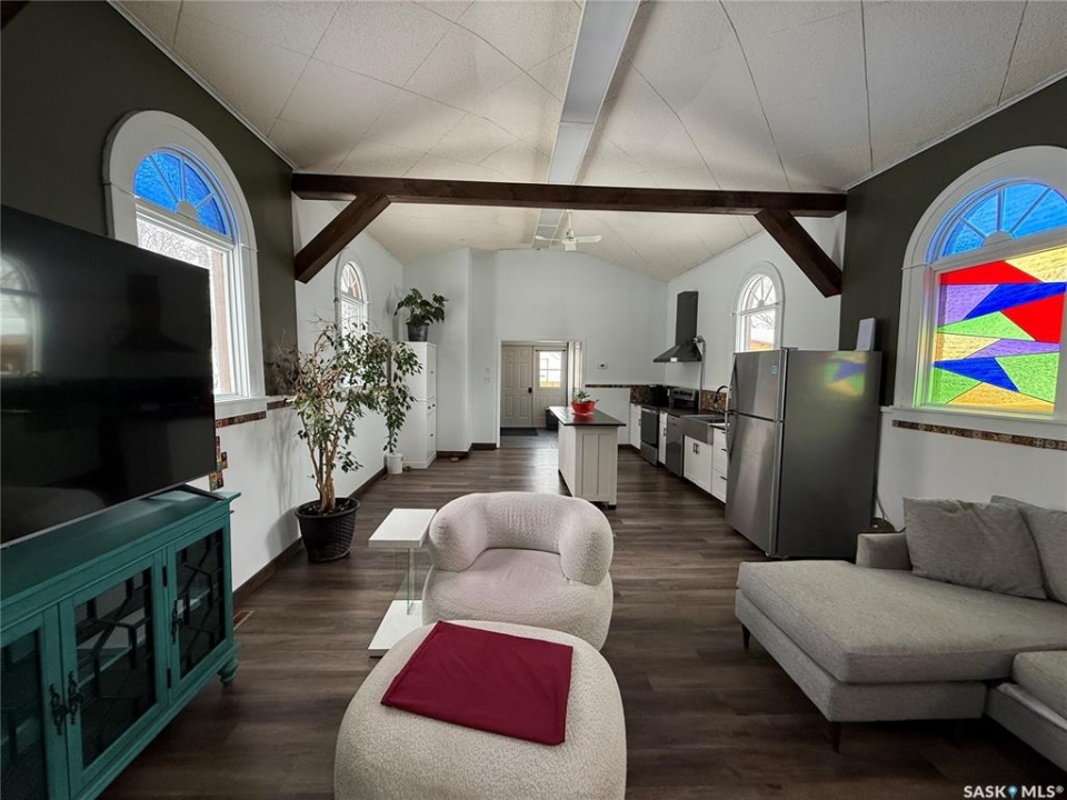 Welcome to this truly unique, one-of-a-kind home in the charming town of Watson—formerly a church and now beautifully transformed into a distinctive residential property full of character and warmth. From the moment you step inside, you'll be impressed by the stunning architectural details, including soaring ceilings and breathtaking stained-glass windows that fill the space with natural light. The welcoming foyer opens into a spacious, open-concept main floor, creating an airy, inviting atmosphere. Just off the foyer is a beautifully finished 3-piece bathroom. The gorgeous kitchen features a central island, ample cabinetry, and stylish vinyl plank flooring that flows seamlessly throughout the main living areas. The kitchen opens to the bright living room, where the impressive stained-glass windows continue to showcase the home's historic charm. Up a step, you'll find the private primary bedroom, highlighted by a beautiful barn door that adds both character and functionality. The lower level offers additional living space with a large open family room, a 3-piece bathroom combined with a laundry area, and a separate storage/utility room. There is also a convenient exterior porch entrance providing direct access to the basement. Outside, the property continues to impress with a fully fenced yard offering privacy and space to enjoy. Relax or entertain on the large deck featuring a built-in hot tub area. There is also a designated garden space along with plenty of green space for outdoor activities. This exceptional property blends historic charm with modern updates—an incredible opportunity to own a truly special home in Watson. All appliances included and immediate possession available. Move right in and enjoy!