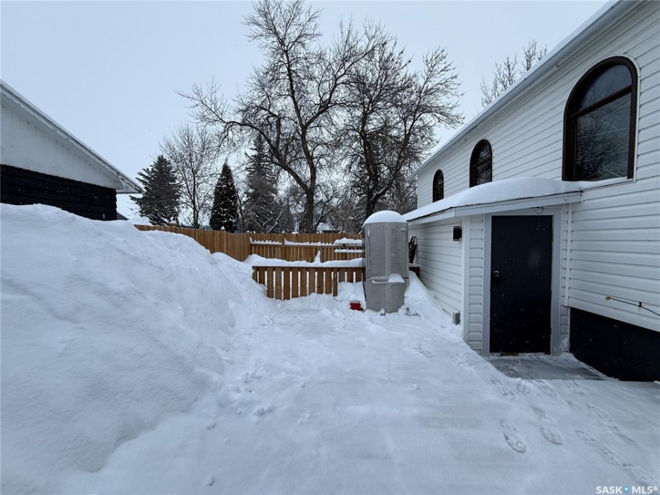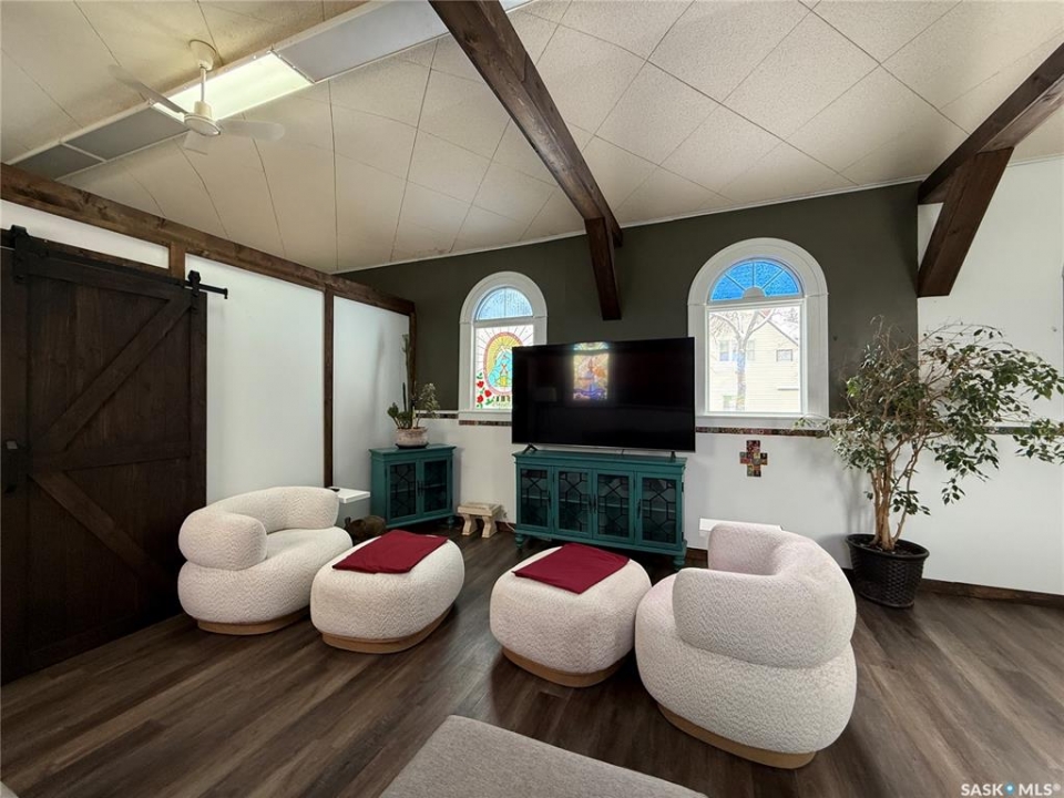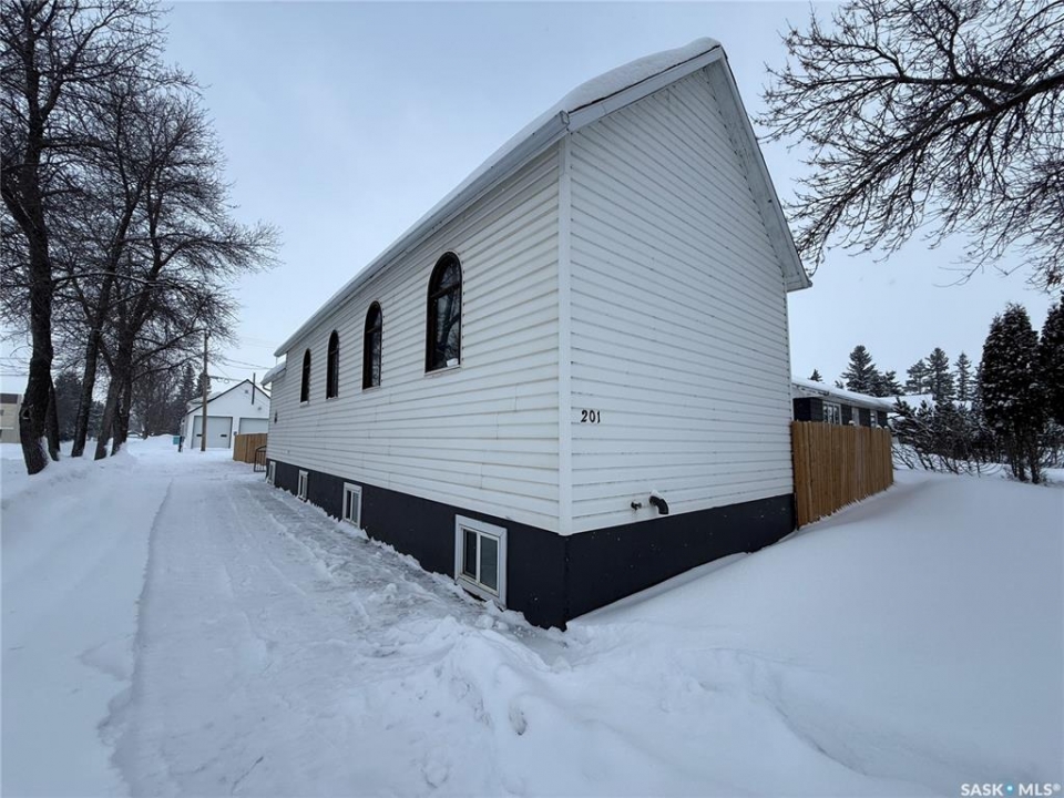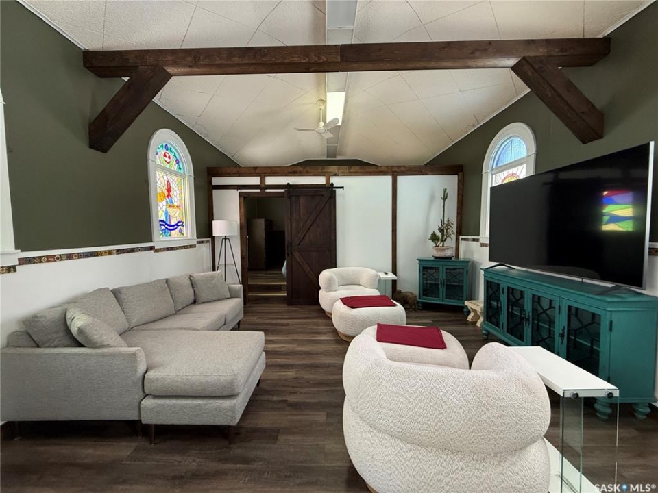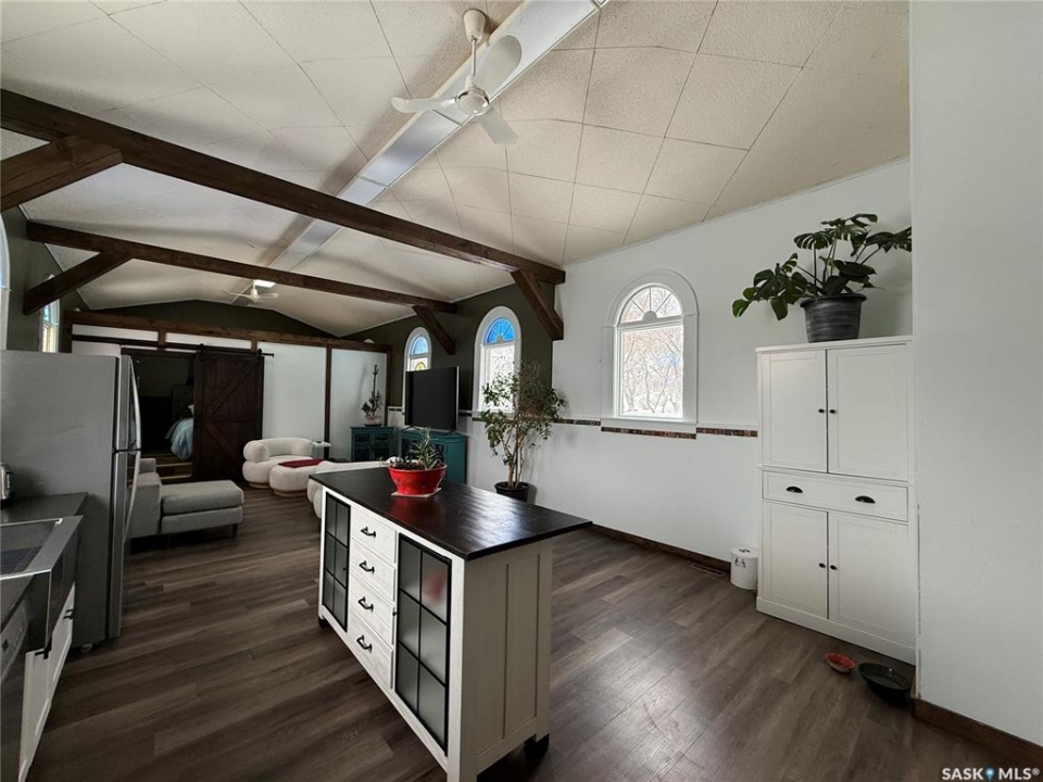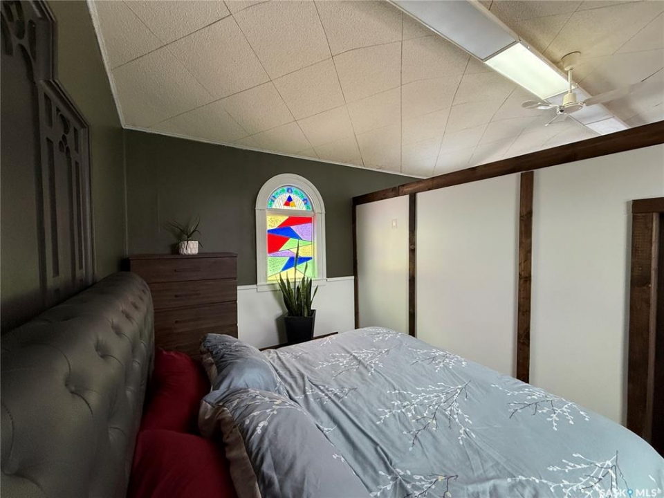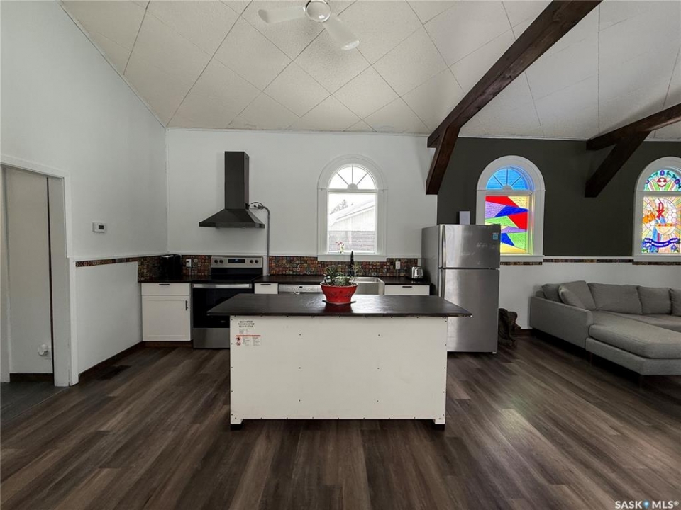 Welcome to this truly unique, one-of-a-kind home in the charming town of Watson—formerly a church and now beautifully transformed into a distinctive residential property full of character and warmth. From the moment you step inside, you'll be impressed by the stunning architectural details, including soaring ceilings and breathtaking stained-glass windows that fill the space with natural light. The welcoming foyer opens into a spacious, open-concept main floor, creating an airy, inviting atmosphere. Just off the foyer is a beautifully finished 3-piece bathroom. The gorgeous kitchen features a central island, ample cabinetry, and stylish vinyl plank flooring that flows seamlessly throughout the main living areas. The kitchen opens to the bright living room, where the impressive stained-glass windows continue to showcase the home's historic charm. Up a step, you'll find the private primary bedroom, highlighted by a beautiful barn door that adds both character and functionality. The lower level offers additional living space with a large open family room, a 3-piece bathroom combined with a laundry area, and a separate storage/utility room. There is also a convenient exterior porch entrance providing direct access to the basement. Outside, the property continues to impress with a fully fenced yard offering privacy and space to enjoy. Relax or entertain on the large deck featuring a built-in hot tub area. There is also a designated garden space along with plenty of green space for outdoor activities. This exceptional property blends historic charm with modern updates—an incredible opportunity to own a truly special home in Watson. All appliances included and immediate possession available. Move right in and enjoy!