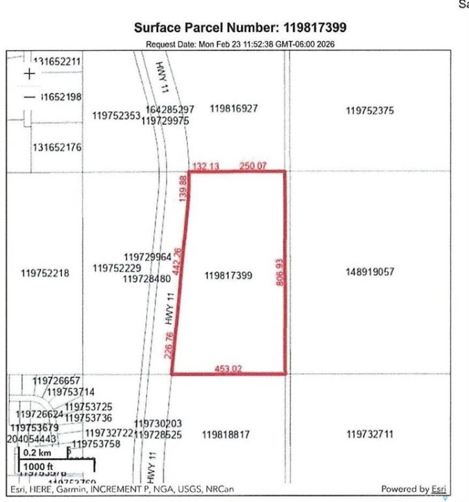 Just 21 km South of Saskatoon on #11 divided highway. 2 parcels including 53.8 acres on west side with restricted access and 82.5 ares with road allowance access off North Grid. West property has some bush. The larger parcel on the East is open and full usable. Good exposure to hight traffic highway. GST payable at Buyer's expense.