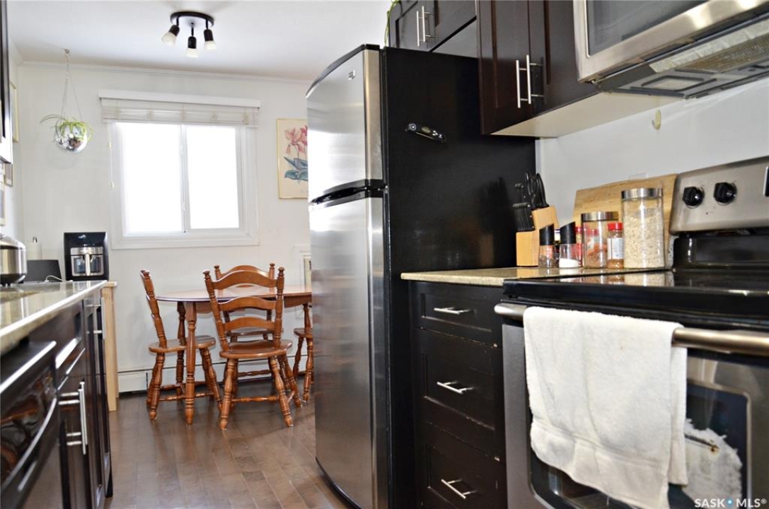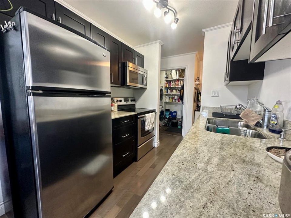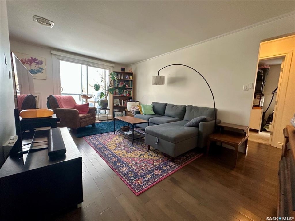 Welcome to 301 920 9th Street East! This fantastic condo is nestled in the highly sought-after Nutana neighborhood, it is a bright and beautifully updated top-floor corner condo that offers 774 square feet of living space, featuring two spacious bedrooms, a full bathroom, and in-suite laundry. The large entryway, crown moulding and abundant storage add to the appeal, while newer windows and a patio door fill the space with natural light. There is a large living room, dining space, a generous primary bedroom, and one dedicated parking stall. Don't miss out on this fantastic opportunity, call today for your private viewing!