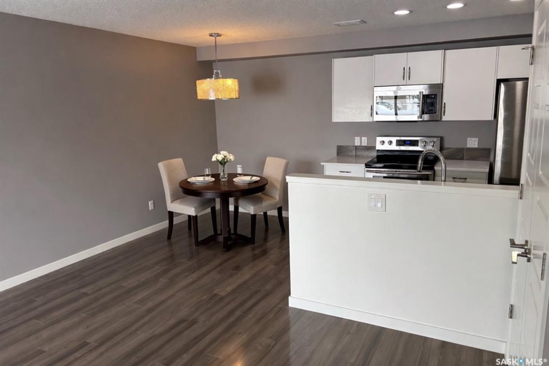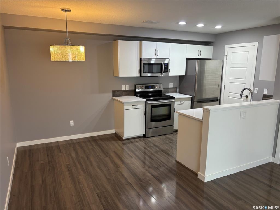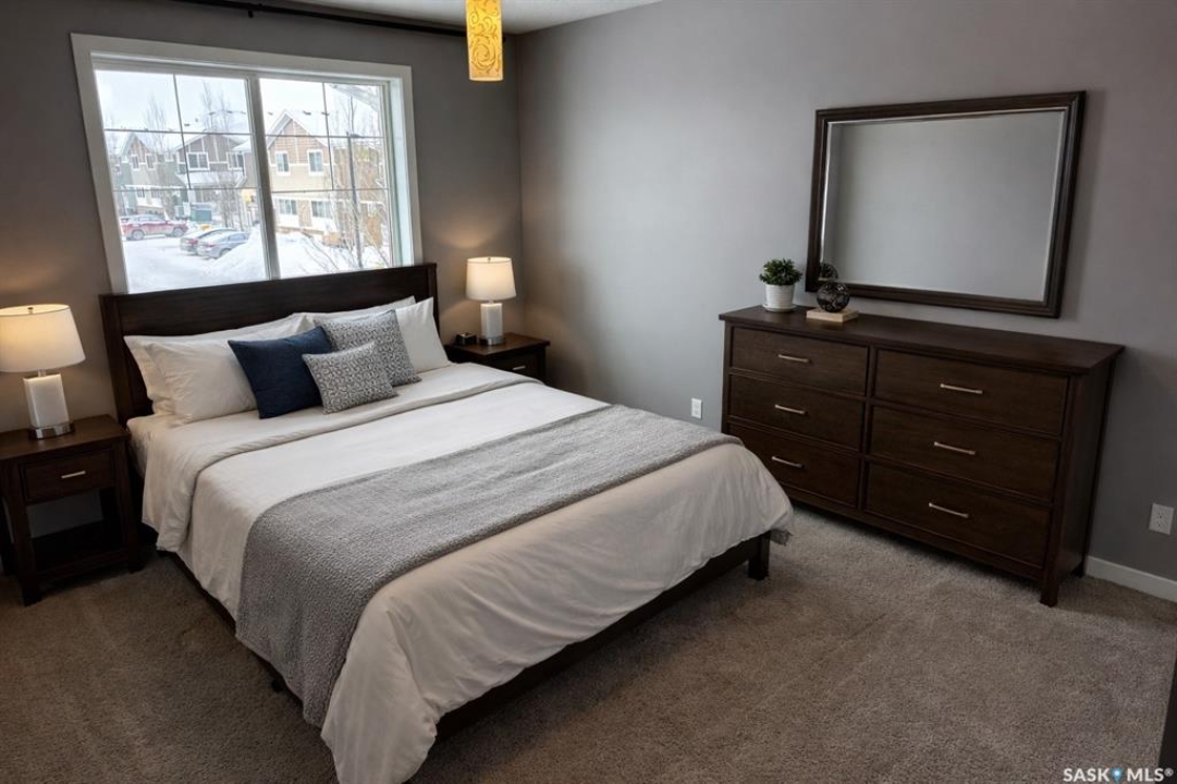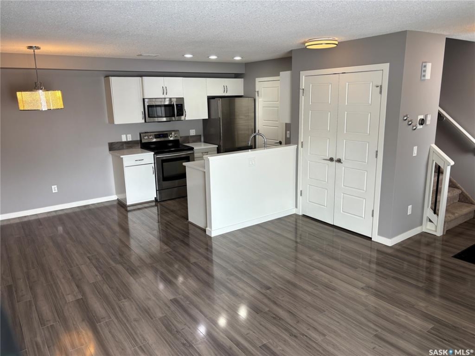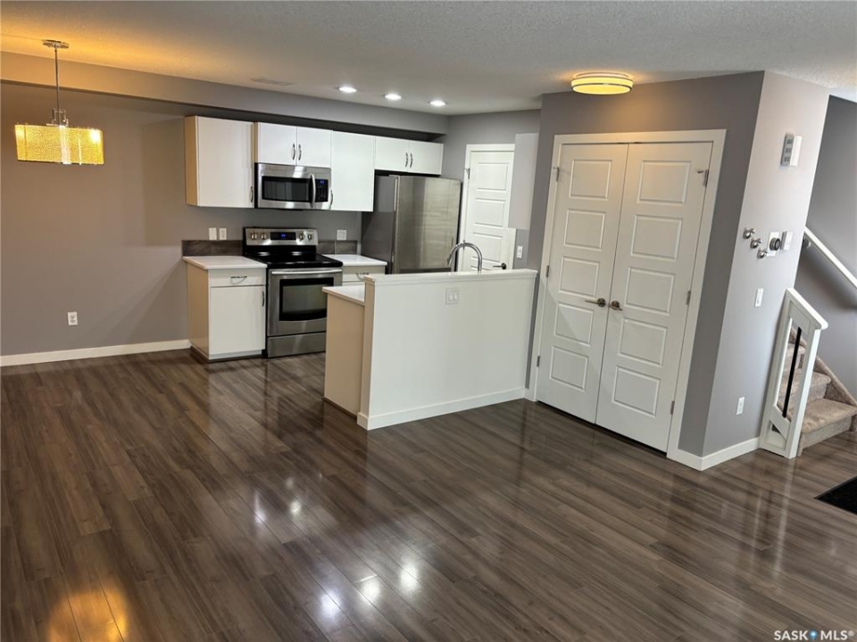 Bright, open concept condo ideally located in Harbour Landing. Steps from green space, walking paths, restaurants, shopping, and much more. Unique features include in floor heat, on demand tankless water heater, and Nest thermostat. Main floor offers a galley style kitchen with quartz countertops, upgraded stainless steel appliances, and extra storage space for your pantry items. Dining area off the kitchen is very functional as it will house a good size table. Living room features a large window allowing for loads of natural light to flow through the main level. Master bedroom is located on the second level and includes a walk-in closet. Additional bedroom, 4 piece bath and laundry area with stackable washer and dryer complete the second level. This unit includes one electrified surface parking stall with additional street parking available. Great location - close to all Harbour Landing amenities. Great opportunity for first time buyer!