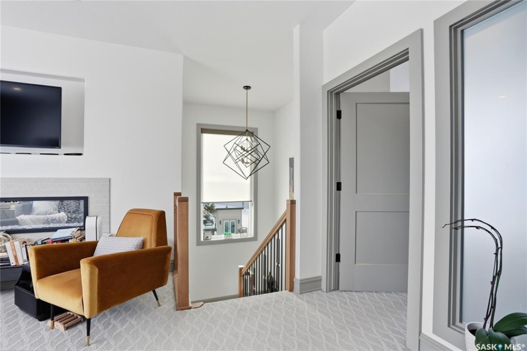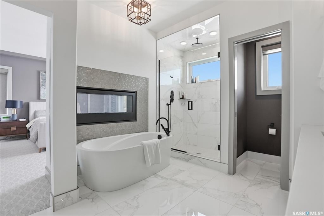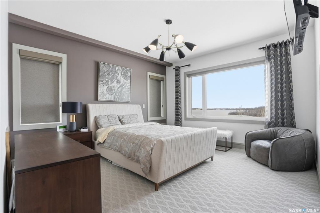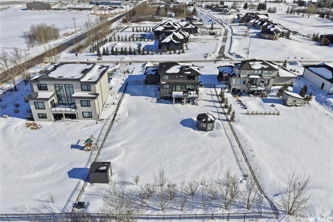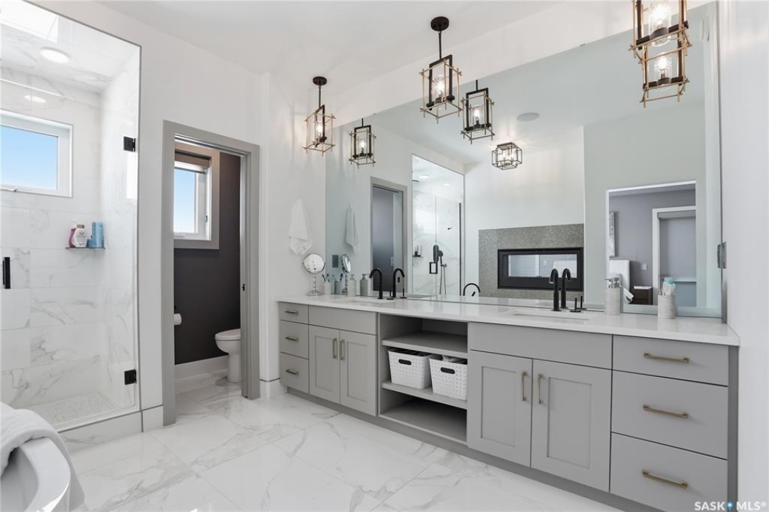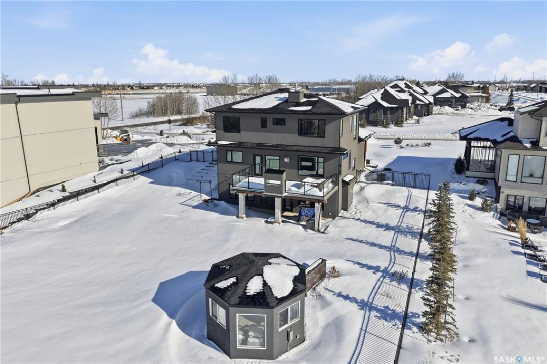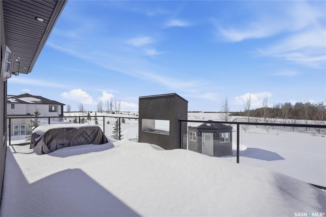 Set on an expansive, beautifully treed lot in Greenbryre Estates, this remarkable two-storey walkout offers 3,352 sq. ft. of thoughtfully finished living space, creating the perfect fusion of luxury and nature. With four bedrooms, four bathrooms, five fireplaces, and a chef-inspired kitchen featuring custom oversized Superior cabinetry, expansive quartz countertops, and a show-stopping island perfect for entertaining, this home is designed for both comfort and style. Step inside from the expansive front veranda to a bright front living room that could also serve as a separate dining room, family room, or home office. Ideally located, the mudroom acts as a functional buffer between the heated triple garage and the walkthrough pantry. The open-concept living room and kitchen are highlighted by a three-sided fireplace, expansive windows, premium vinyl plank flooring, and contemporary lighting. The upper level has a welcoming bonus room, a laundry room with built-in cabinetry, counter space, and sink, three bedrooms, a full bathroom, and a luxurious primary suite featuring a custom shower, deep soaker tub, double-sided fireplace, and a cleverly concealed mirror TV. The fully developed walkout basement offers a spacious recreation room with surround sound and a full wet bar, gym, large bedroom, and three-piece bathroom. Outdoor living is elevated with an upper deck featuring a gas fireplace overlooking the expansive fully fenced backyard and peaceful countryside views. A lower tiled patio showcases a waterfall fountain with colored lights beside a fully electrified covered gazebo, complete with a fan and ample space to accommodate a large group. Complete with state-of-the-art mechanical systems, home automation, and an oversized triple heated garage, this home represents exceptional craftsmanship in one of Saskatoon's most sought-after communities.