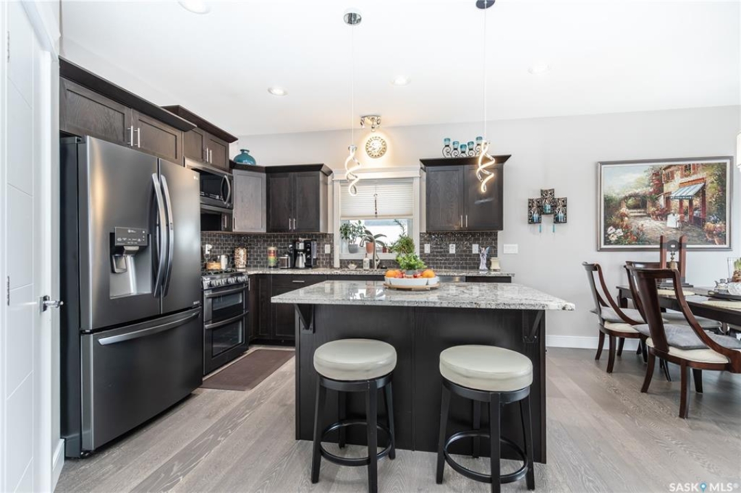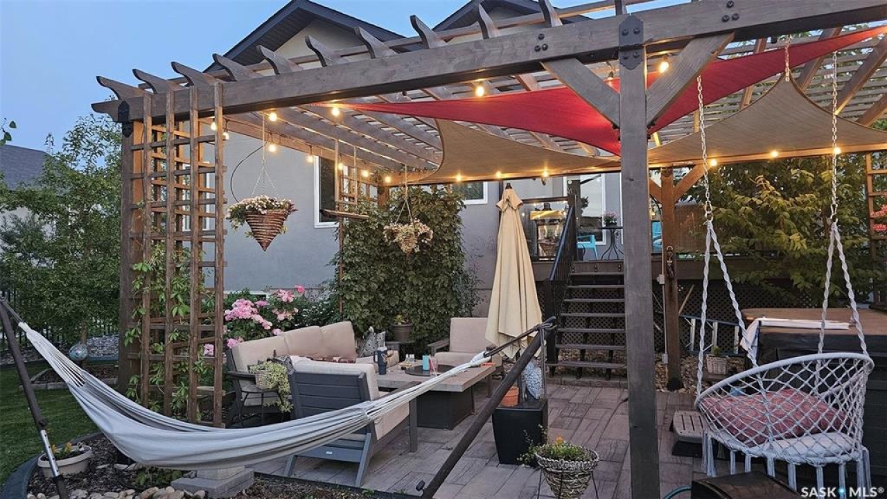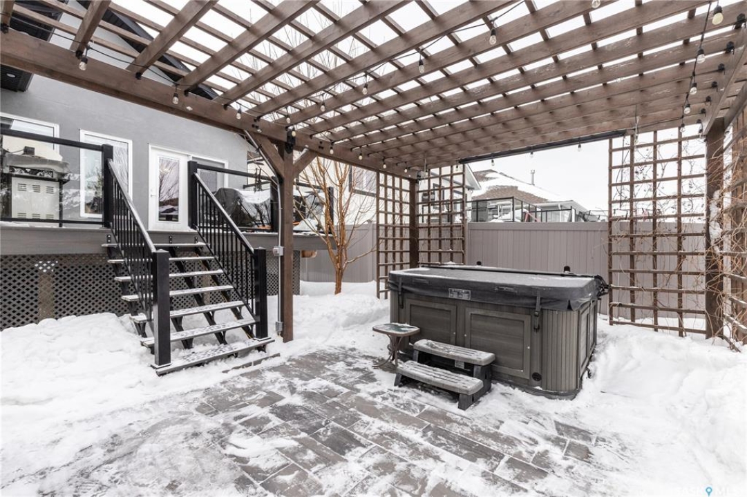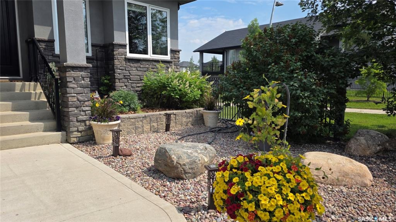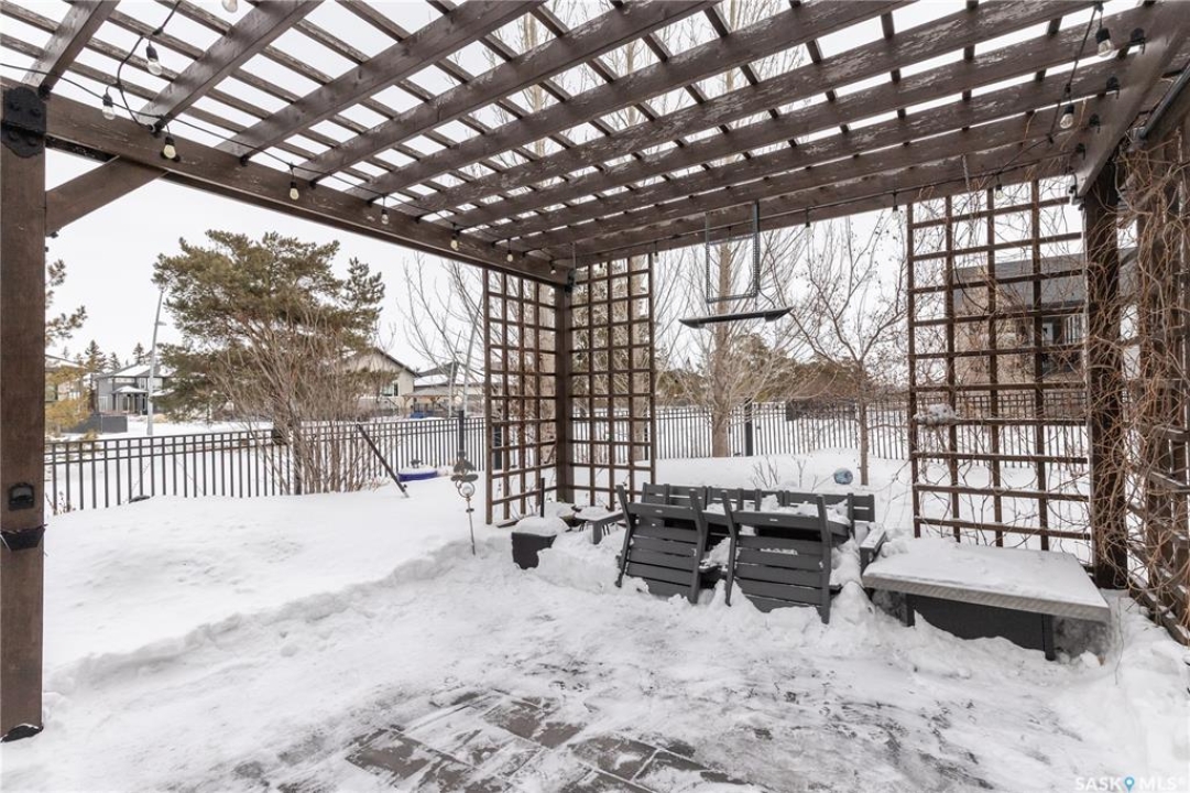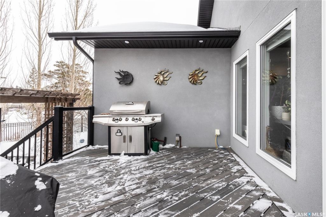 Beautiful Fully Finished 1,500 Sq. Ft. Bungalow Backing Green Space in Evergreen Welcome to this stunning, fully developed 1,500 sq. ft. bungalow backing green space in Evergreen. The main floor offers a bright, open-concept layout featuring a modern kitchen complete with granite countertops, a walk-in pantry, and a gas range. The spacious living room is highlighted by a cozy gas fireplace, perfect for relaxing or entertaining. The primary suite includes two generous closets and a luxurious 4-piece ensuite with heated floors and a large walk-in shower. Two additional bedrooms and a full bathroom with a soaker tub complete the main level. Convenient main-floor laundry and direct access to the backyard from the dining room add to the home's functionality. Step outside to your own private backyard oasis featuring a large deck with a gas BBQ hookup, plus a patio area with a hot tub, pergola, and an additional gas hookup—ideal for a future fire pit. Enjoy the added privacy of backing green space. The fully developed basement is designed for entertaining, offering a spacious family room with a bar, an additional bedroom, and a full bathroom. A versatile nook area could easily be converted into a fifth bedroom if desired. The utility room provides ample storage space. Additional features include central air conditioning, central vacuum throughout the home and garage, and a double attached insulated garage. Ideally located with direct access to the Northeast Swale, Forestry Farm, and Saskatoon Zoo trails—enjoy walking, biking, and cross-country skiing right from your doorstep. Close to parks, schools, and shopping. Call today to book your private viewing!