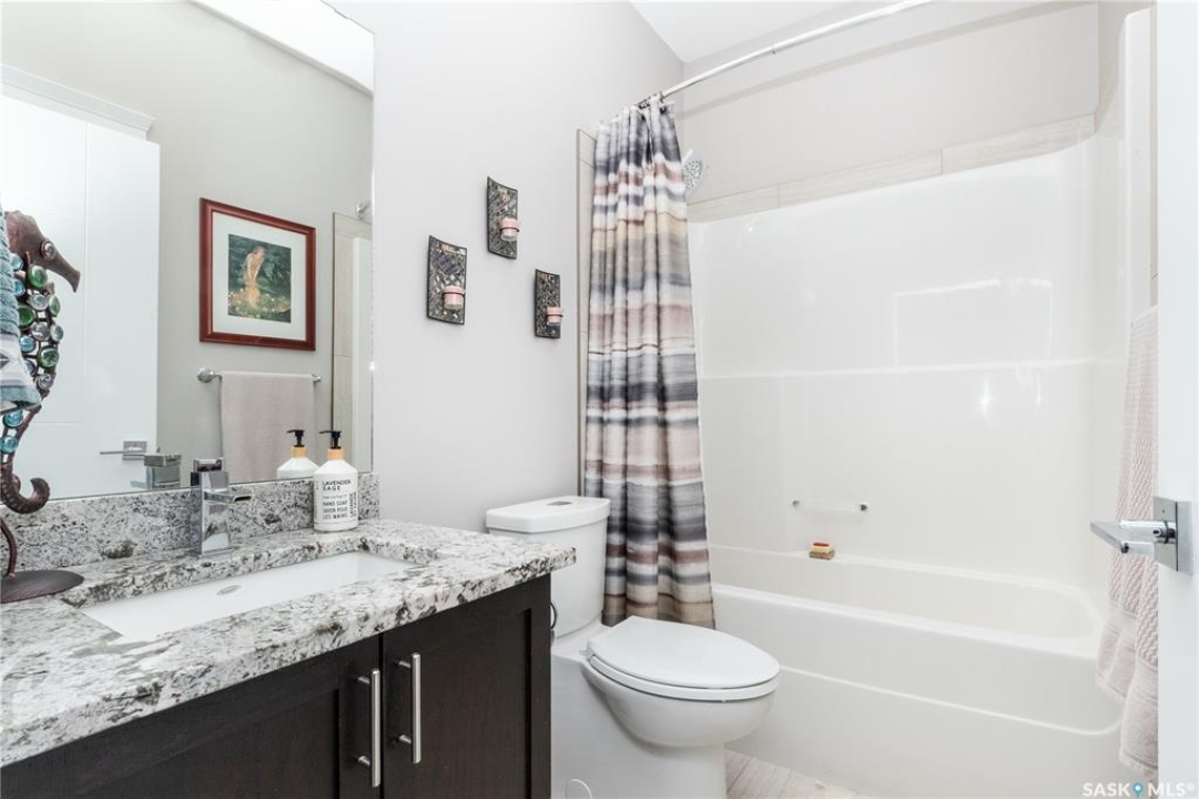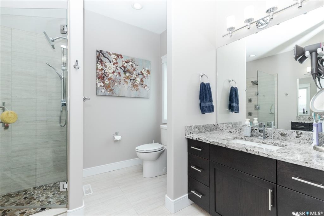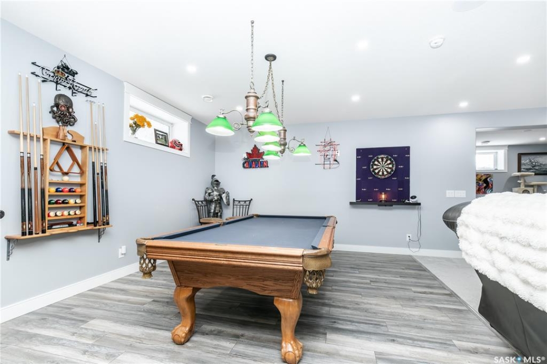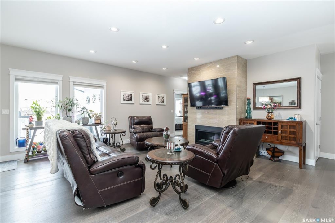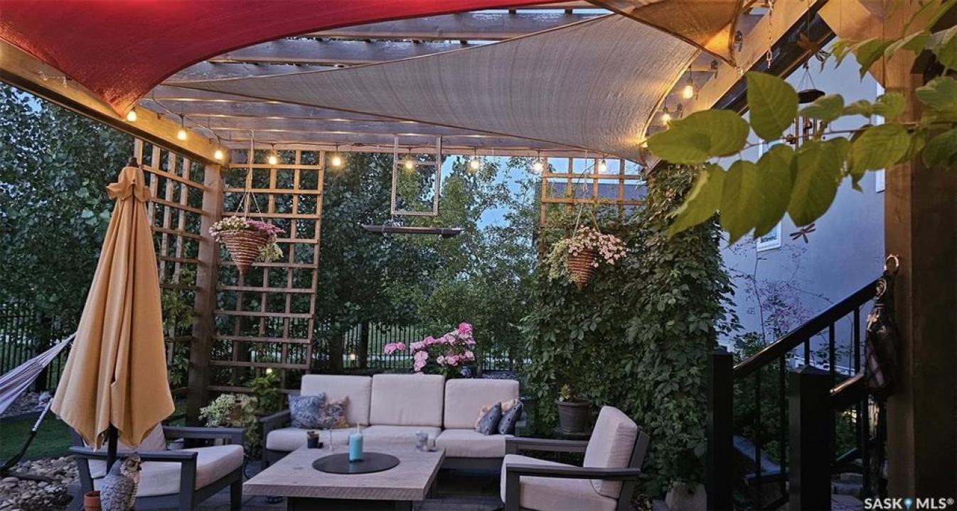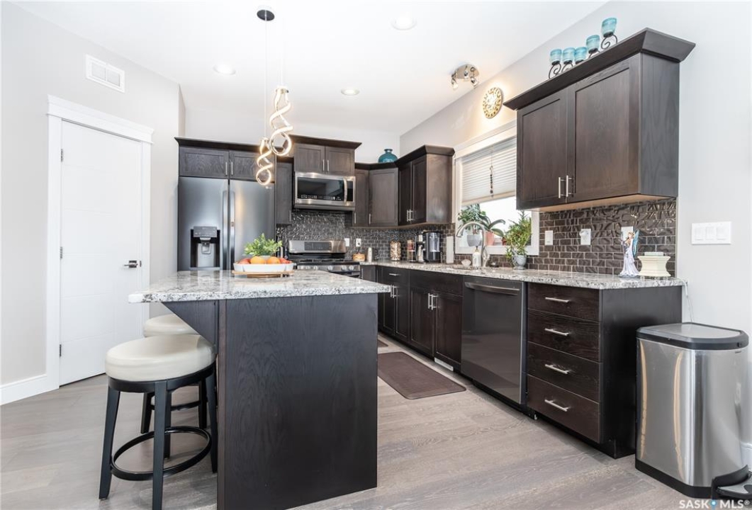 Beautiful Fully Finished 1,500 Sq. Ft. Bungalow Backing Green Space in Evergreen Welcome to this stunning, fully developed 1,500 sq. ft. bungalow backing green space in Evergreen. The main floor offers a bright, open-concept layout featuring a modern kitchen complete with granite countertops, a walk-in pantry, and a gas range. The spacious living room is highlighted by a cozy gas fireplace, perfect for relaxing or entertaining. The primary suite includes two generous closets and a luxurious 4-piece ensuite with heated floors and a large walk-in shower. Two additional bedrooms and a full bathroom with a soaker tub complete the main level. Convenient main-floor laundry and direct access to the backyard from the dining room add to the home's functionality. Step outside to your own private backyard oasis featuring a large deck with a gas BBQ hookup, plus a patio area with a hot tub, pergola, and an additional gas hookup—ideal for a future fire pit. Enjoy the added privacy of backing green space. The fully developed basement is designed for entertaining, offering a spacious family room with a bar, an additional bedroom, and a full bathroom. A versatile nook area could easily be converted into a fifth bedroom if desired. The utility room provides ample storage space. Additional features include central air conditioning, central vacuum throughout the home and garage, and a double attached insulated garage. Ideally located with direct access to the Northeast Swale, Forestry Farm, and Saskatoon Zoo trails—enjoy walking, biking, and cross-country skiing right from your doorstep. Close to parks, schools, and shopping. Call today to book your private viewing!