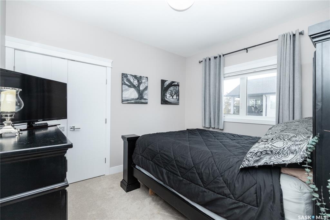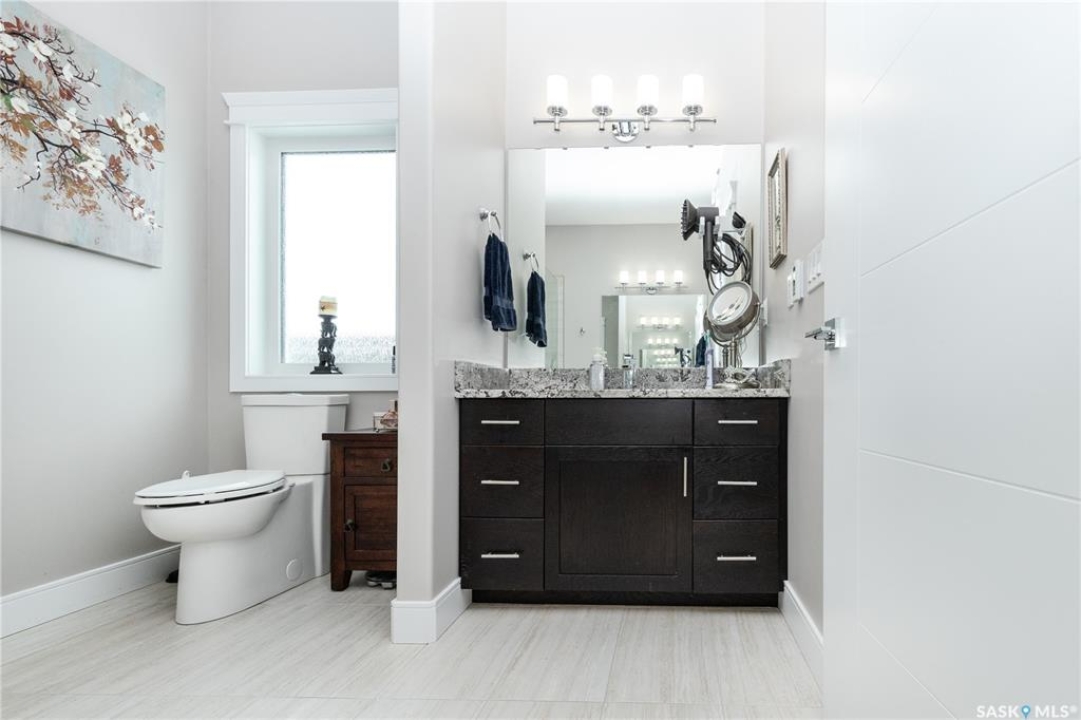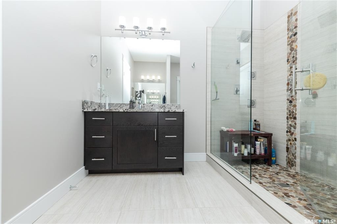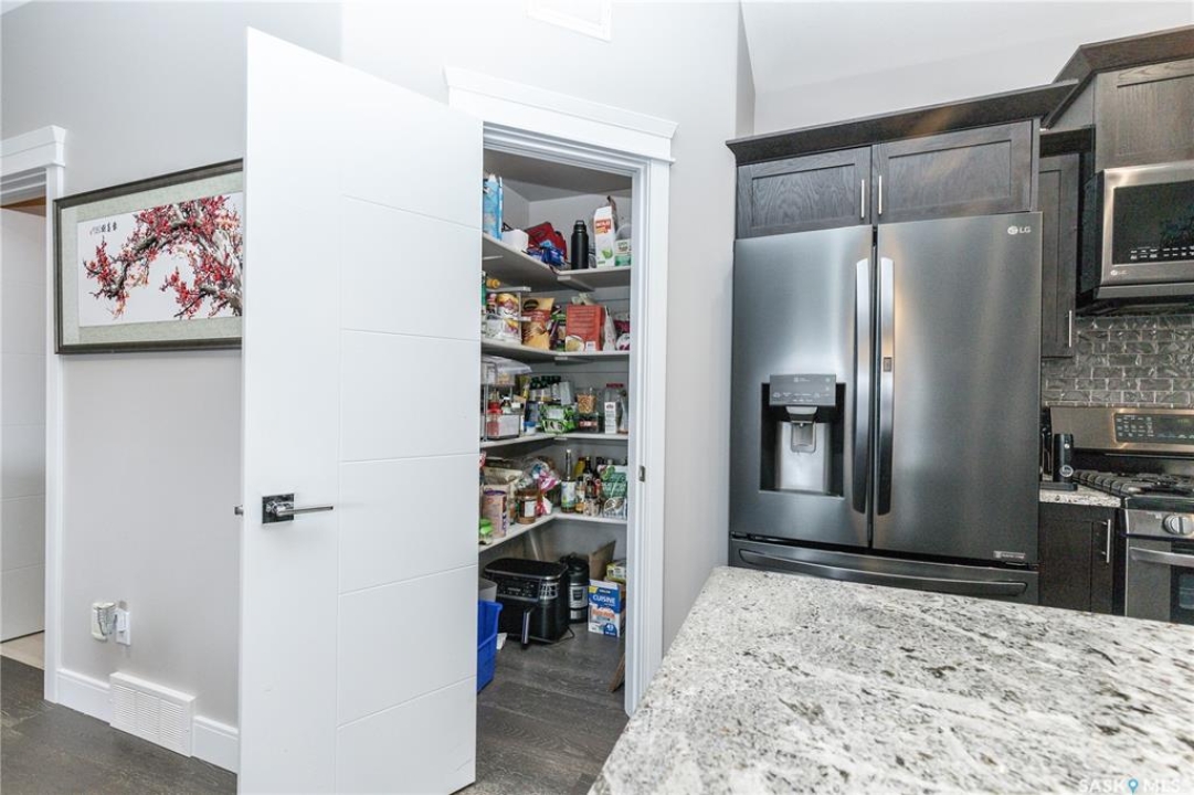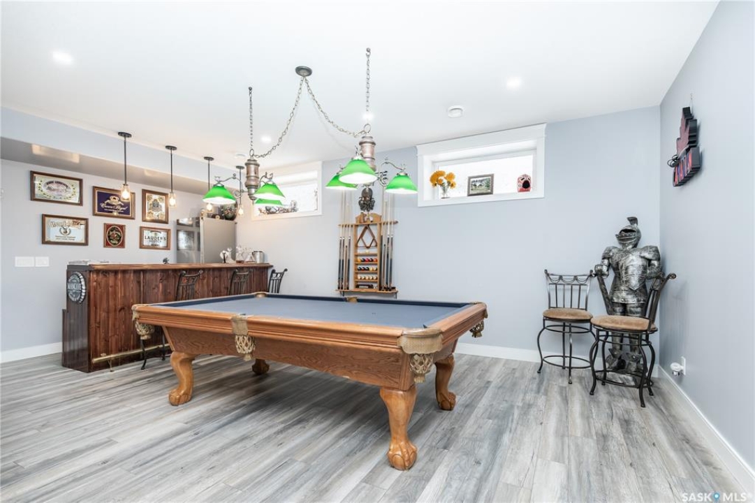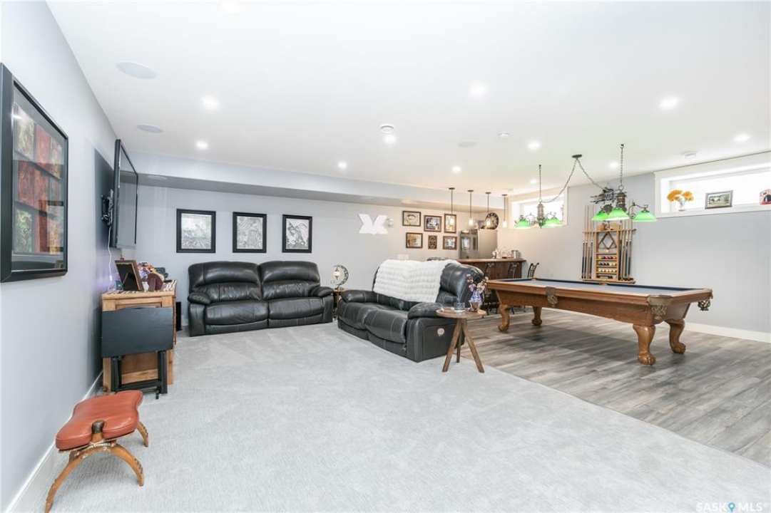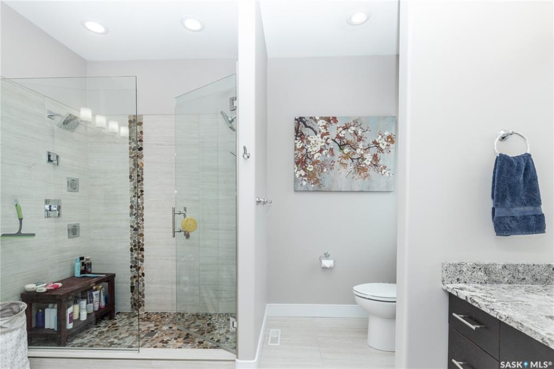 Beautiful Fully Finished 1,500 Sq. Ft. Bungalow Backing Green Space in Evergreen Welcome to this stunning, fully developed 1,500 sq. ft. bungalow backing green space in Evergreen. The main floor offers a bright, open-concept layout featuring a modern kitchen complete with granite countertops, a walk-in pantry, and a gas range. The spacious living room is highlighted by a cozy gas fireplace, perfect for relaxing or entertaining. The primary suite includes two generous closets and a luxurious 4-piece ensuite with heated floors and a large walk-in shower. Two additional bedrooms and a full bathroom with a soaker tub complete the main level. Convenient main-floor laundry and direct access to the backyard from the dining room add to the home's functionality. Step outside to your own private backyard oasis featuring a large deck with a gas BBQ hookup, plus a patio area with a hot tub, pergola, and an additional gas hookup—ideal for a future fire pit. Enjoy the added privacy of backing green space. The fully developed basement is designed for entertaining, offering a spacious family room with a bar, an additional bedroom, and a full bathroom. A versatile nook area could easily be converted into a fifth bedroom if desired. The utility room provides ample storage space. Additional features include central air conditioning, central vacuum throughout the home and garage, and a double attached insulated garage. Ideally located with direct access to the Northeast Swale, Forestry Farm, and Saskatoon Zoo trails—enjoy walking, biking, and cross-country skiing right from your doorstep. Close to parks, schools, and shopping. Call today to book your private viewing!