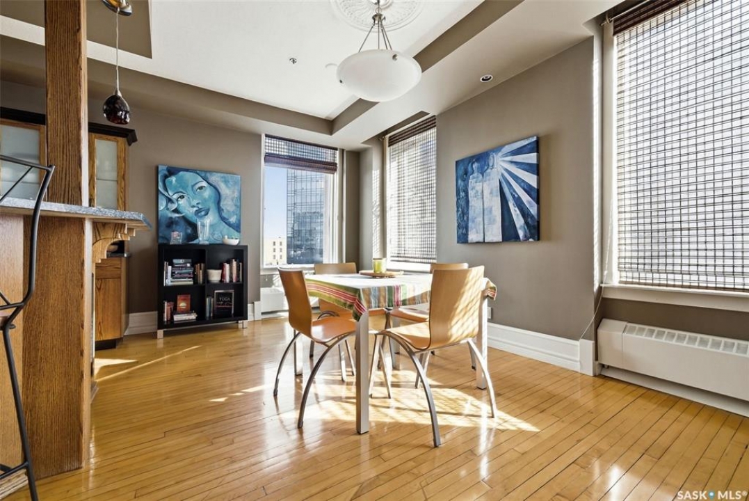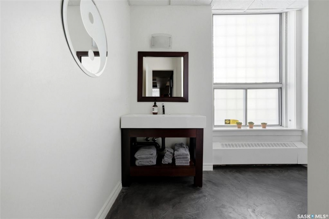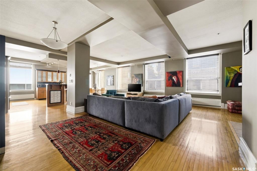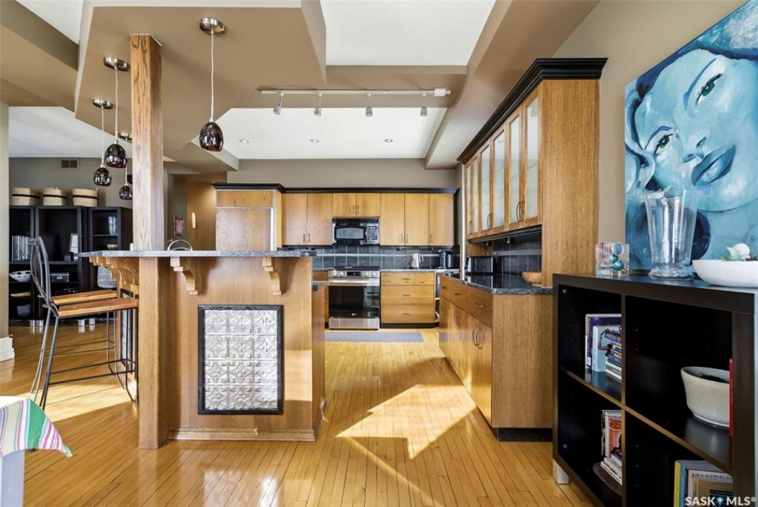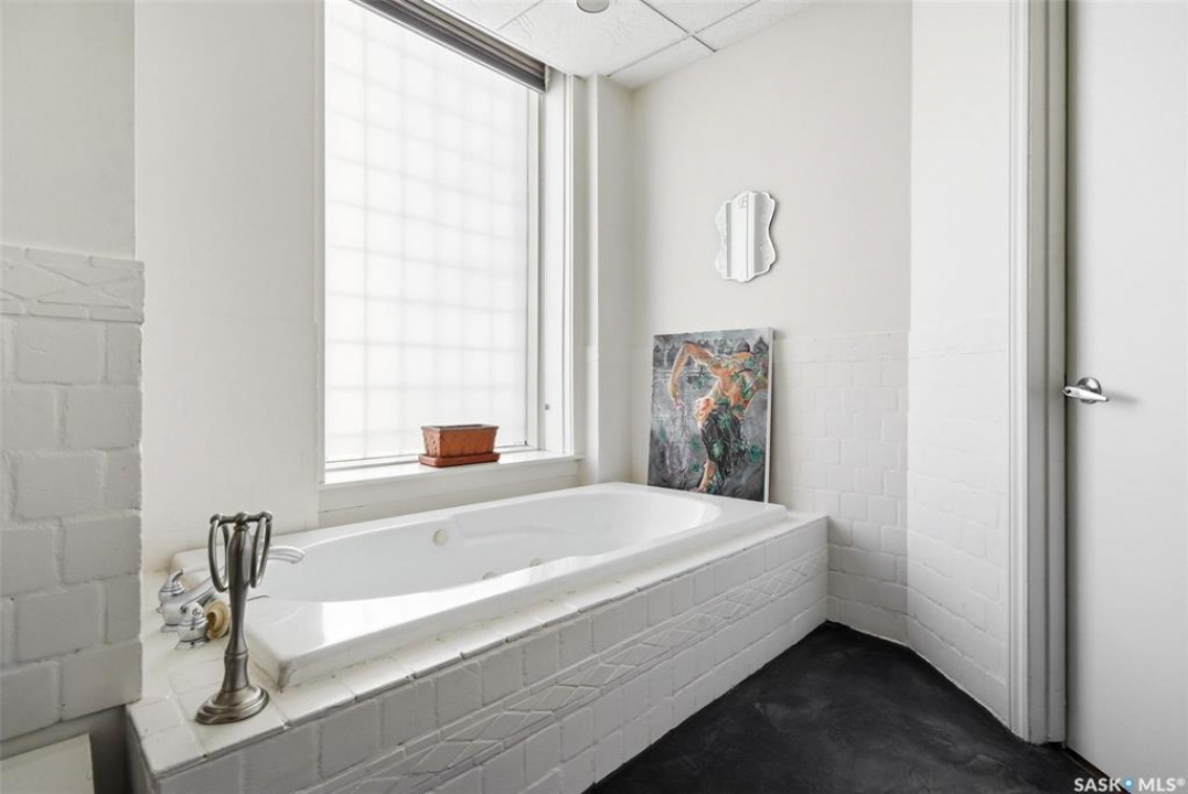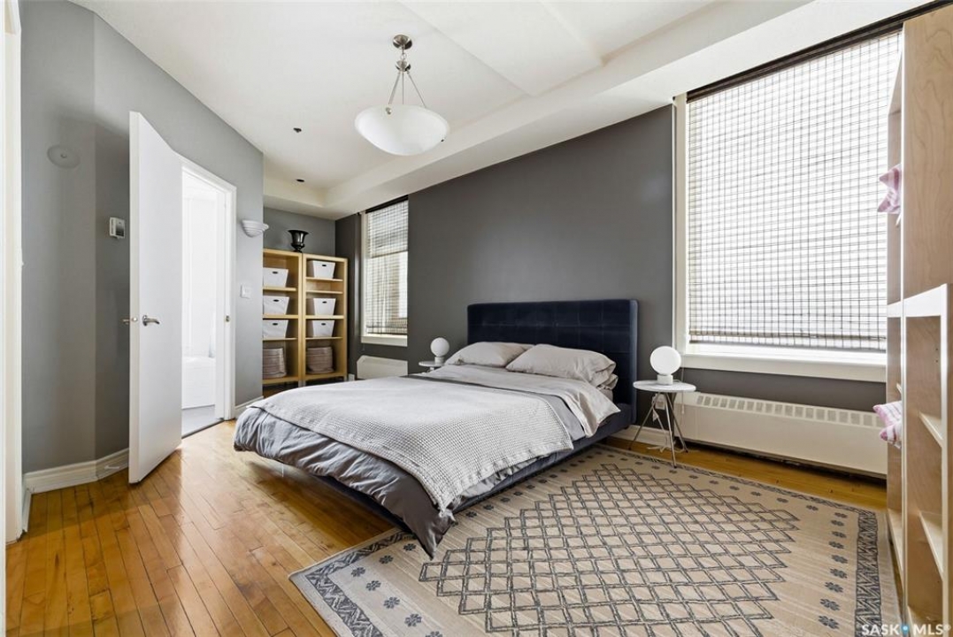 Welcome to this stunning fourth-floor residence in the historic Western Trust Building, offering over 1,900 square feet of sophisticated, south-facing luxury. This expansive open-concept layout showcases an impressive living, dining, and kitchen area — ideal for both everyday comfort and upscale entertaining. A charming nook just off the main living space provides the perfect setting for a home office or cozy library corner. The kitchen is exceptionally well appointed, featuring granite countertops, a Sub-Zero refrigerator, and an abundance of counter and prep space. Dishwasher and stove were replaced in 2025. A large eating island anchors the room and includes the sink and dishwasher, creating a highly functional workspace while allowing the kitchen to open seamlessly to and overlook the spacious living room — perfect for entertaining and staying connected with guests. The unique dual-bath layout is both functional and private, with two side-by-side bathrooms connected by a pocket door. One features a jetted tub and a spacious double vanity, while the second offers a large walk-in shower and vanity. The primary bedroom is generously sized and includes a large walk-in closet with built-in shelving. The second bedroom is also spacious and features a double closet. A substantial laundry and storage room enhances everyday practicality, and a new washer and dryer (2025) are included. A private elevator provides exclusive access, traveling directly into the unit itself — a rare and distinguished feature that enhances both privacy and security. The building is known for its solid construction and quiet atmosphere. One heated underground parking stall is included, conveniently located beneath the Globe Theatre — allowing for comfortable year-round parking just steps away. An exceptional opportunity to own a piece of Regina's architectural history while enjoying executive-style condo living in the heart of downtown.