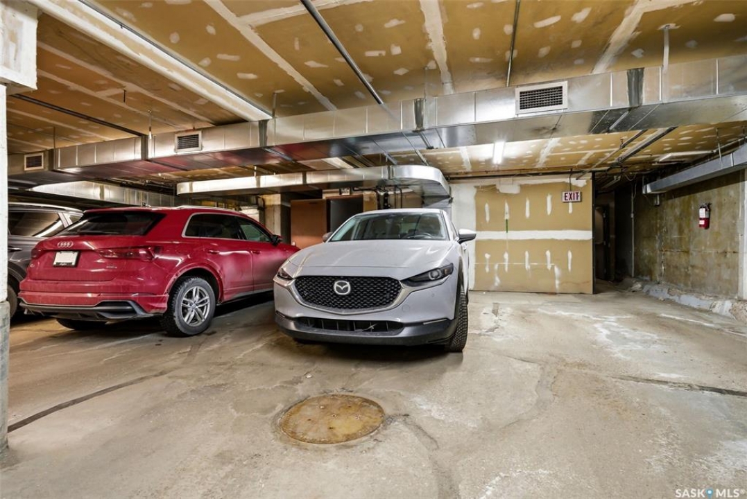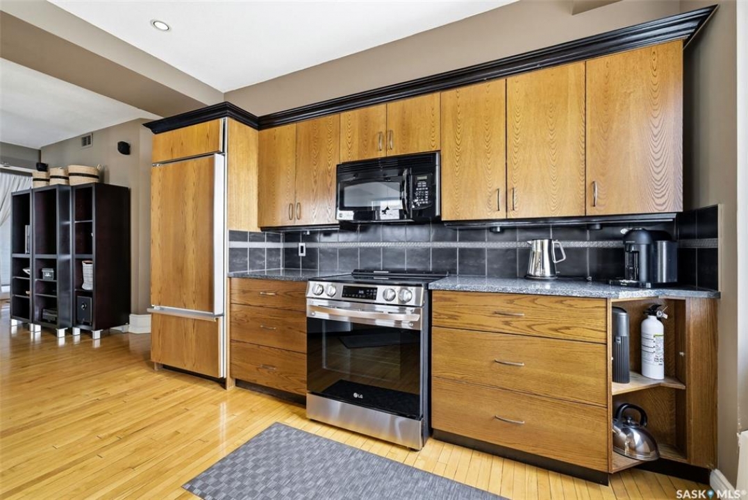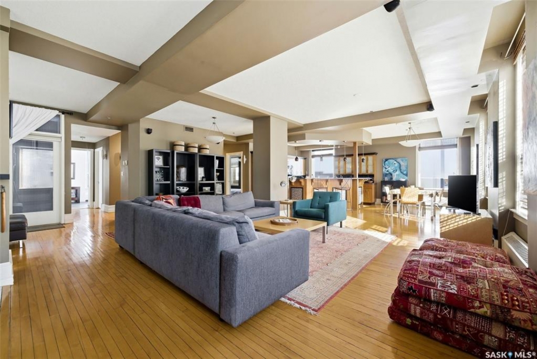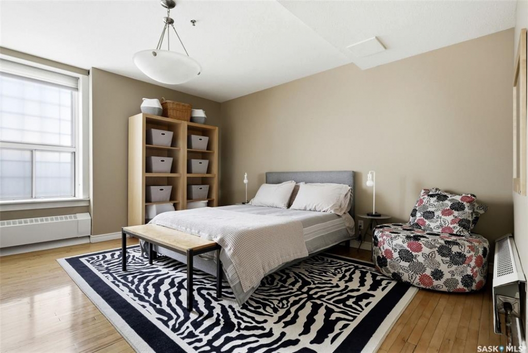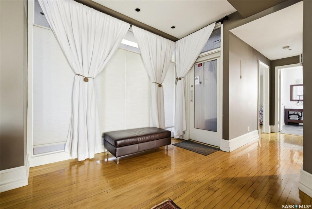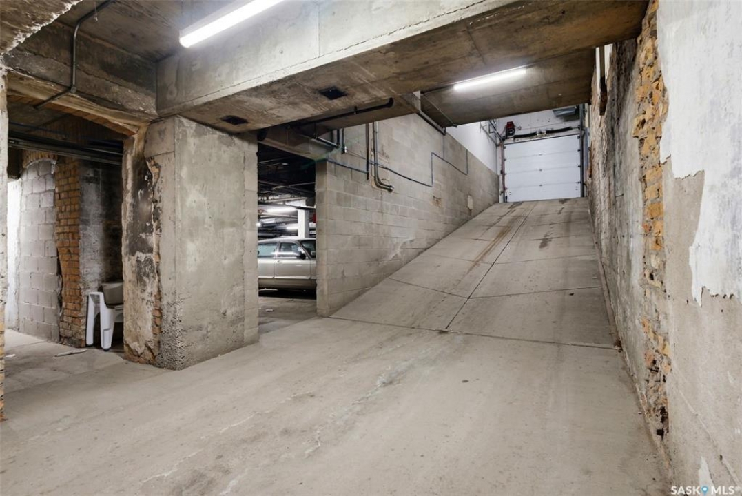 Welcome to this stunning fourth-floor residence in the historic Western Trust Building, offering over 1,900 square feet of sophisticated, south-facing luxury. This expansive open-concept layout showcases an impressive living, dining, and kitchen area — ideal for both everyday comfort and upscale entertaining. A charming nook just off the main living space provides the perfect setting for a home office or cozy library corner. The kitchen is exceptionally well appointed, featuring granite countertops, a Sub-Zero refrigerator, and an abundance of counter and prep space. Dishwasher and stove were replaced in 2025. A large eating island anchors the room and includes the sink and dishwasher, creating a highly functional workspace while allowing the kitchen to open seamlessly to and overlook the spacious living room — perfect for entertaining and staying connected with guests. The unique dual-bath layout is both functional and private, with two side-by-side bathrooms connected by a pocket door. One features a jetted tub and a spacious double vanity, while the second offers a large walk-in shower and vanity. The primary bedroom is generously sized and includes a large walk-in closet with built-in shelving. The second bedroom is also spacious and features a double closet. A substantial laundry and storage room enhances everyday practicality, and a new washer and dryer (2025) are included. A private elevator provides exclusive access, traveling directly into the unit itself — a rare and distinguished feature that enhances both privacy and security. The building is known for its solid construction and quiet atmosphere. One heated underground parking stall is included, conveniently located beneath the Globe Theatre — allowing for comfortable year-round parking just steps away. An exceptional opportunity to own a piece of Regina's architectural history while enjoying executive-style condo living in the heart of downtown.