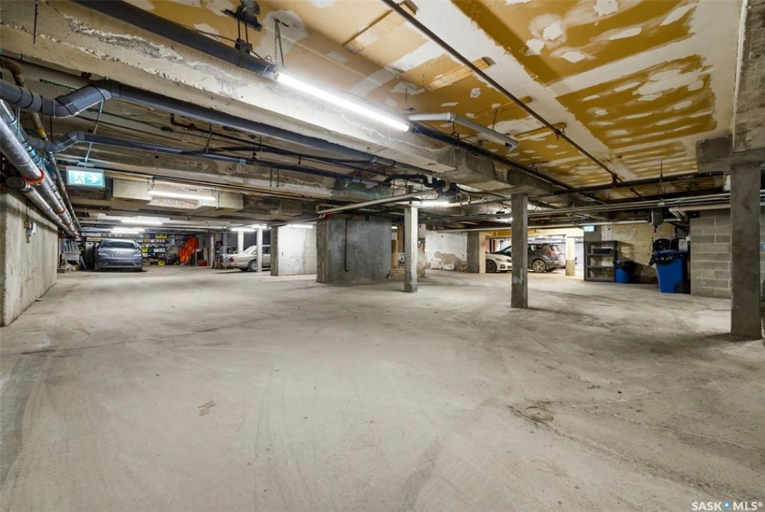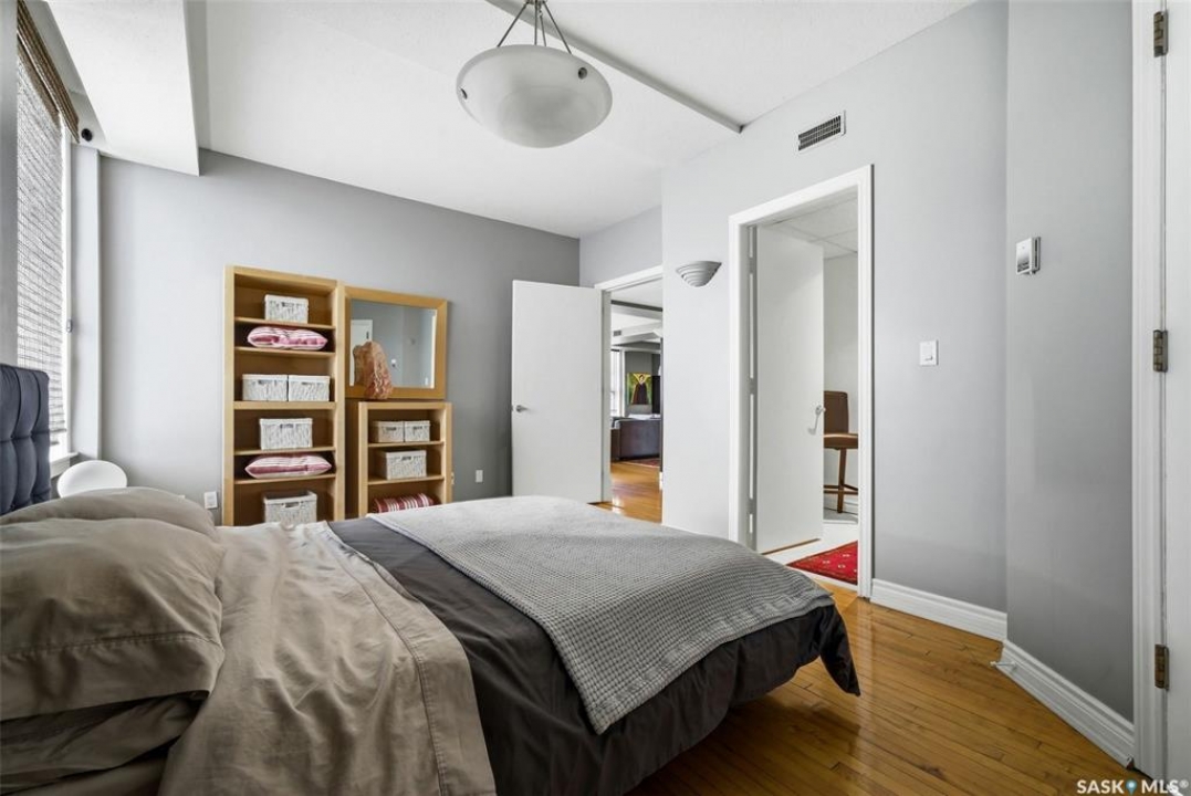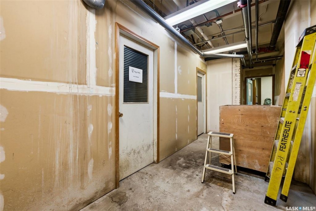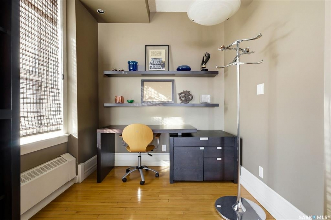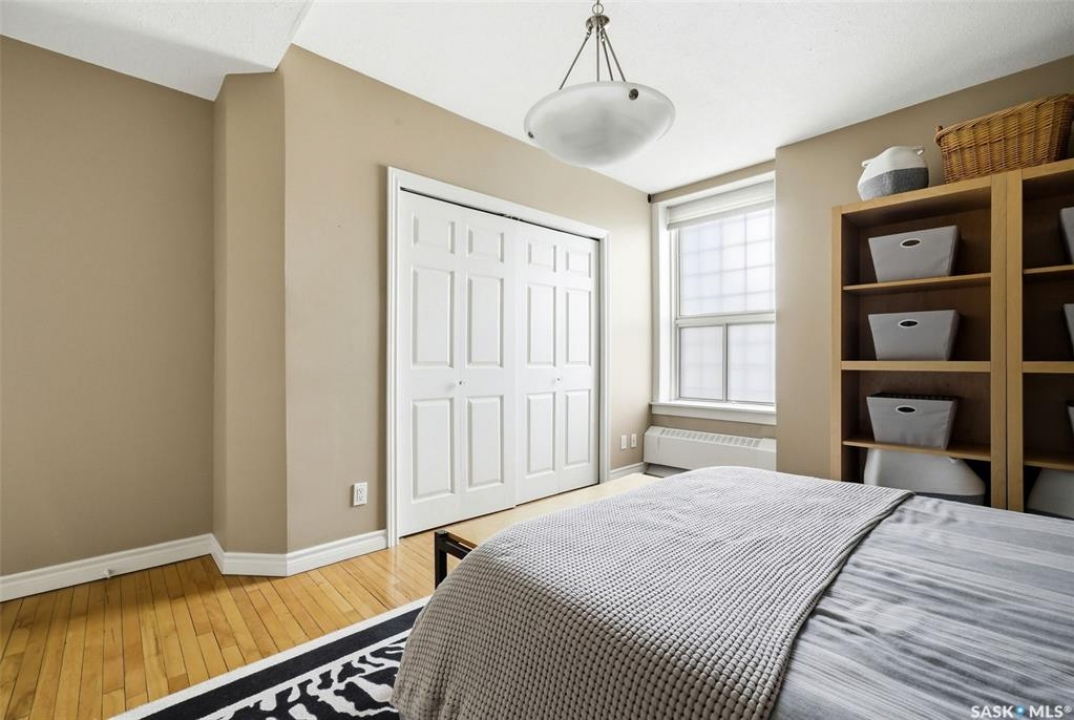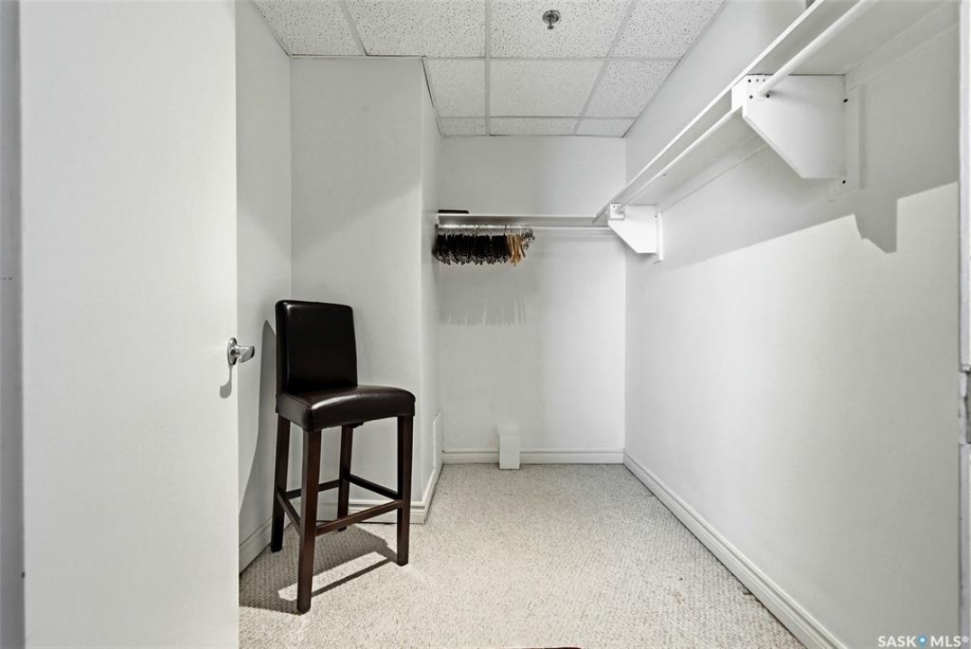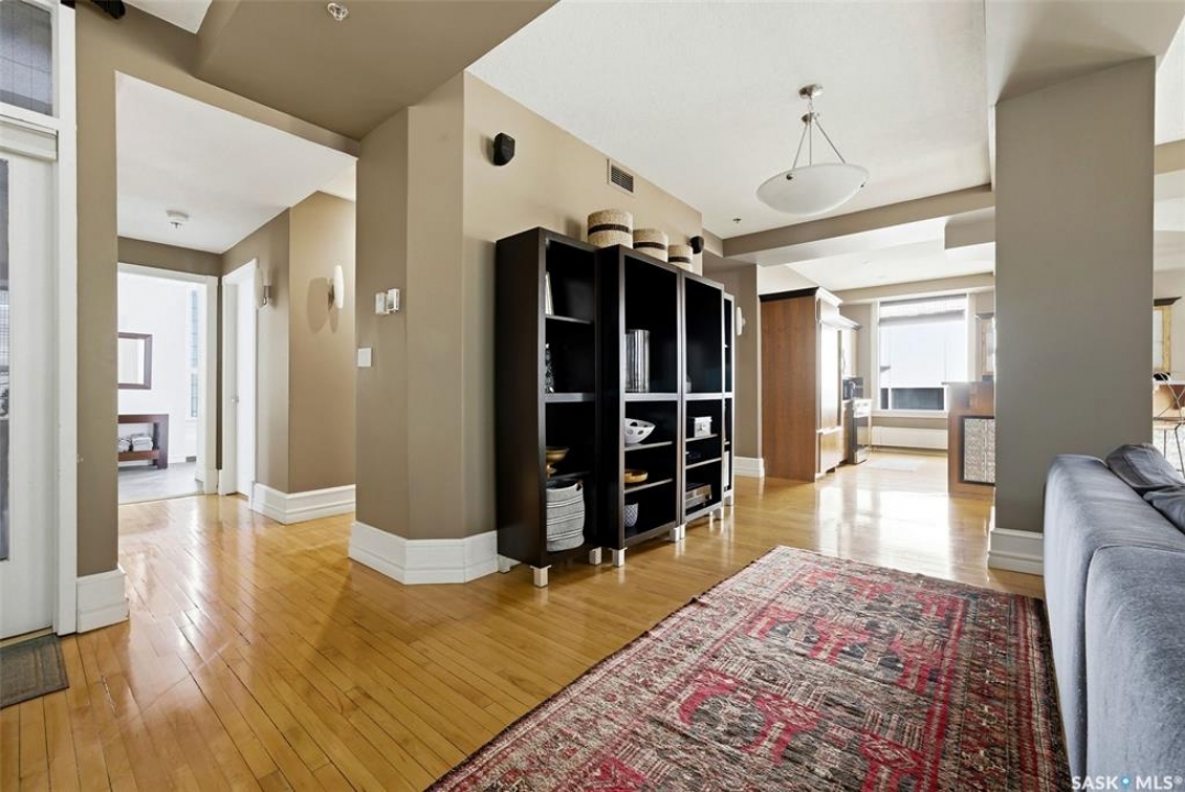 Welcome to this stunning fourth-floor residence in the historic Western Trust Building, offering over 1,900 square feet of sophisticated, south-facing luxury. This expansive open-concept layout showcases an impressive living, dining, and kitchen area — ideal for both everyday comfort and upscale entertaining. A charming nook just off the main living space provides the perfect setting for a home office or cozy library corner. The kitchen is exceptionally well appointed, featuring granite countertops, a Sub-Zero refrigerator, and an abundance of counter and prep space. Dishwasher and stove were replaced in 2025. A large eating island anchors the room and includes the sink and dishwasher, creating a highly functional workspace while allowing the kitchen to open seamlessly to and overlook the spacious living room — perfect for entertaining and staying connected with guests. The unique dual-bath layout is both functional and private, with two side-by-side bathrooms connected by a pocket door. One features a jetted tub and a spacious double vanity, while the second offers a large walk-in shower and vanity. The primary bedroom is generously sized and includes a large walk-in closet with built-in shelving. The second bedroom is also spacious and features a double closet. A substantial laundry and storage room enhances everyday practicality, and a new washer and dryer (2025) are included. A private elevator provides exclusive access, traveling directly into the unit itself — a rare and distinguished feature that enhances both privacy and security. The building is known for its solid construction and quiet atmosphere. One heated underground parking stall is included, conveniently located beneath the Globe Theatre — allowing for comfortable year-round parking just steps away. An exceptional opportunity to own a piece of Regina's architectural history while enjoying executive-style condo living in the heart of downtown.