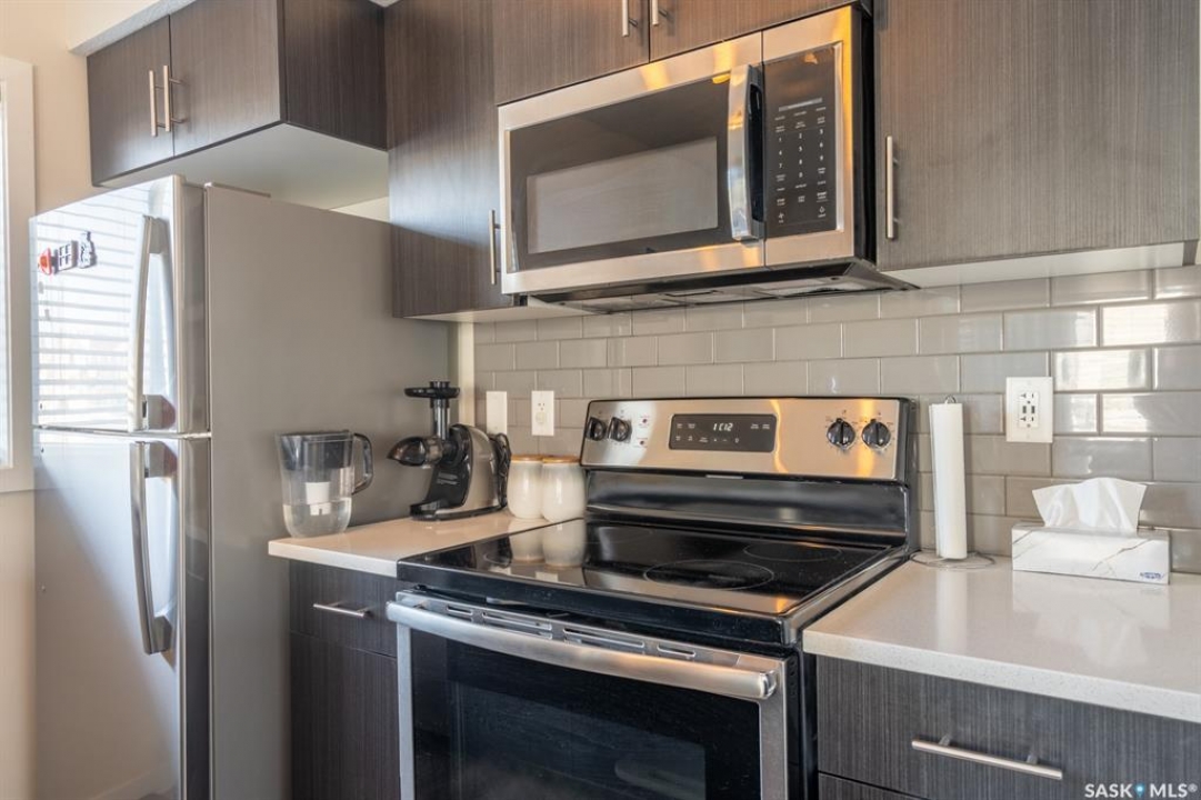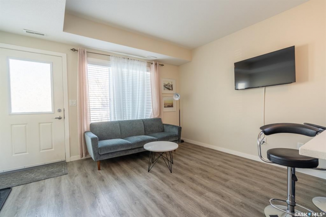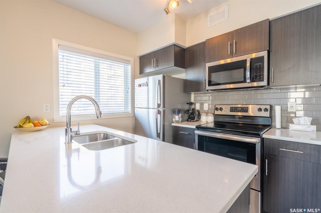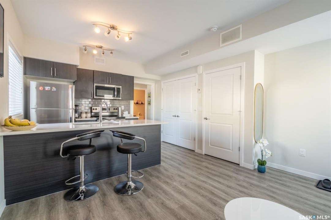 Welcome to this thoughtfully designed studio-style condo, ideally located in a prime location within the complex. Set just off the street, this main level unit offers added privacy, convenient extra parking, and pleasant views of newly built homes across the way—enhancing the peaceful setting. Step inside to a bright and inviting space filled with natural sunlight streaming through the front living room window and door. The open-concept layout seamlessly connects the comfortable living area to a modern kitchen featuring an extended eat-up island, quartz countertops, stylish tile backsplash, stainless steel appliances, and soft-close cabinetry for a refined touch. Durable vinyl plank flooring runs throughout, adding to the contemporary appeal. The thoughtfully designed bedroom area is tucked behind a pocket door for privacy. While it does not offer a window, it includes two built-in closets, easy access to the 4-piece bathroom, and an additional storage closet with in-suite laundry conveniently located nearby. This original-owner unit has been meticulously maintained with no pets and minimal wall hangings, preserving its pristine condition. Upgrades include central air conditioning, an owned alarm system, and tasteful window coverings. The outdoor parking stall is just steps from the front entrance, ensuring everyday convenience. A perfect blend of comfort, style, and affordability—this charming condo is ready to welcome its next owner. Some virtually staged photos are labeled. Don't miss this opportunity!