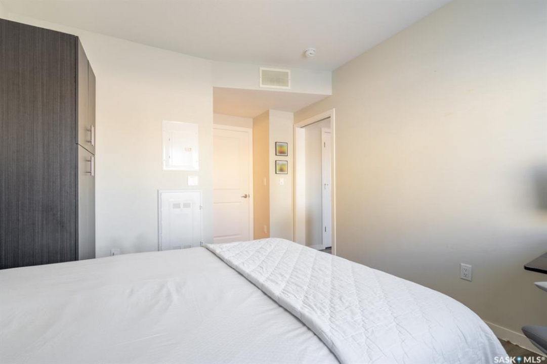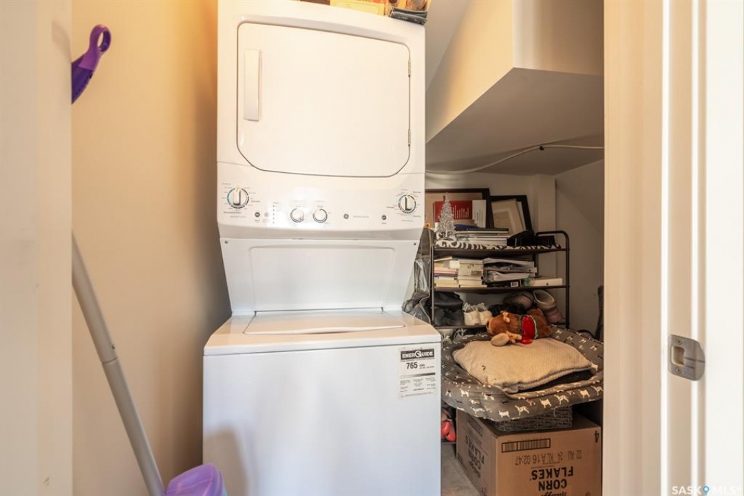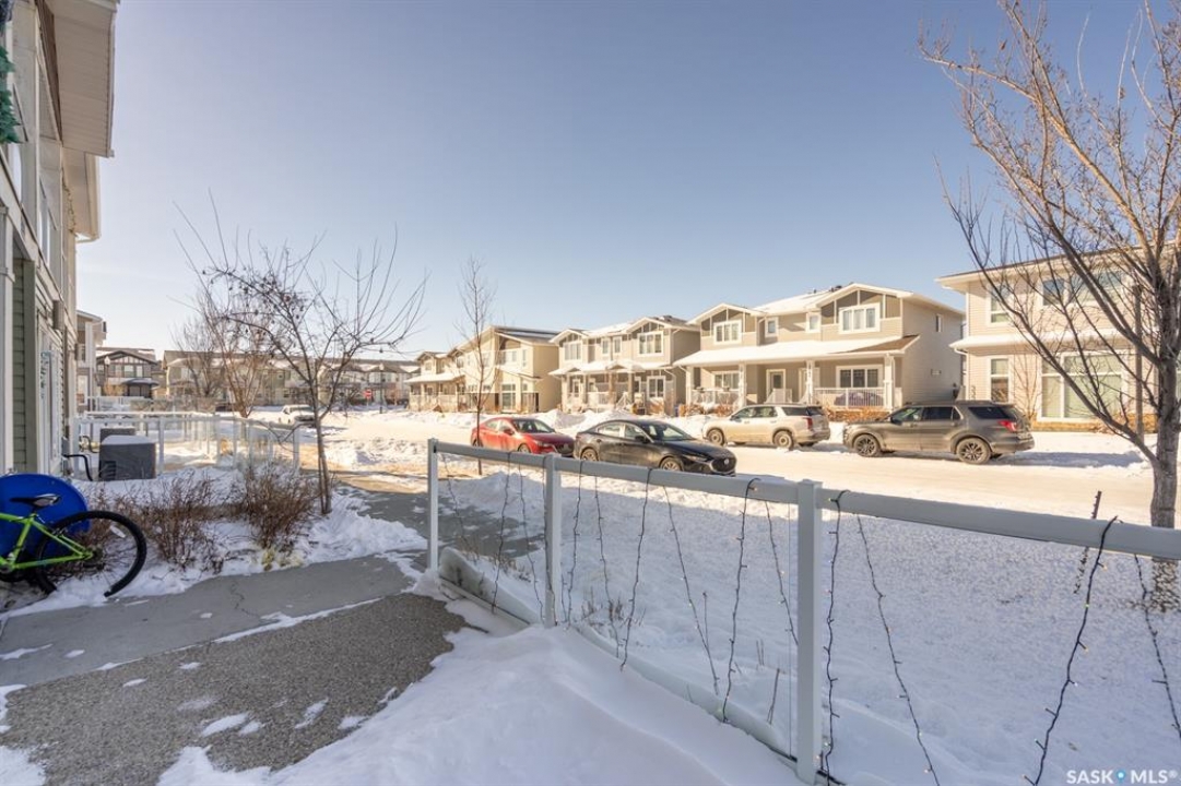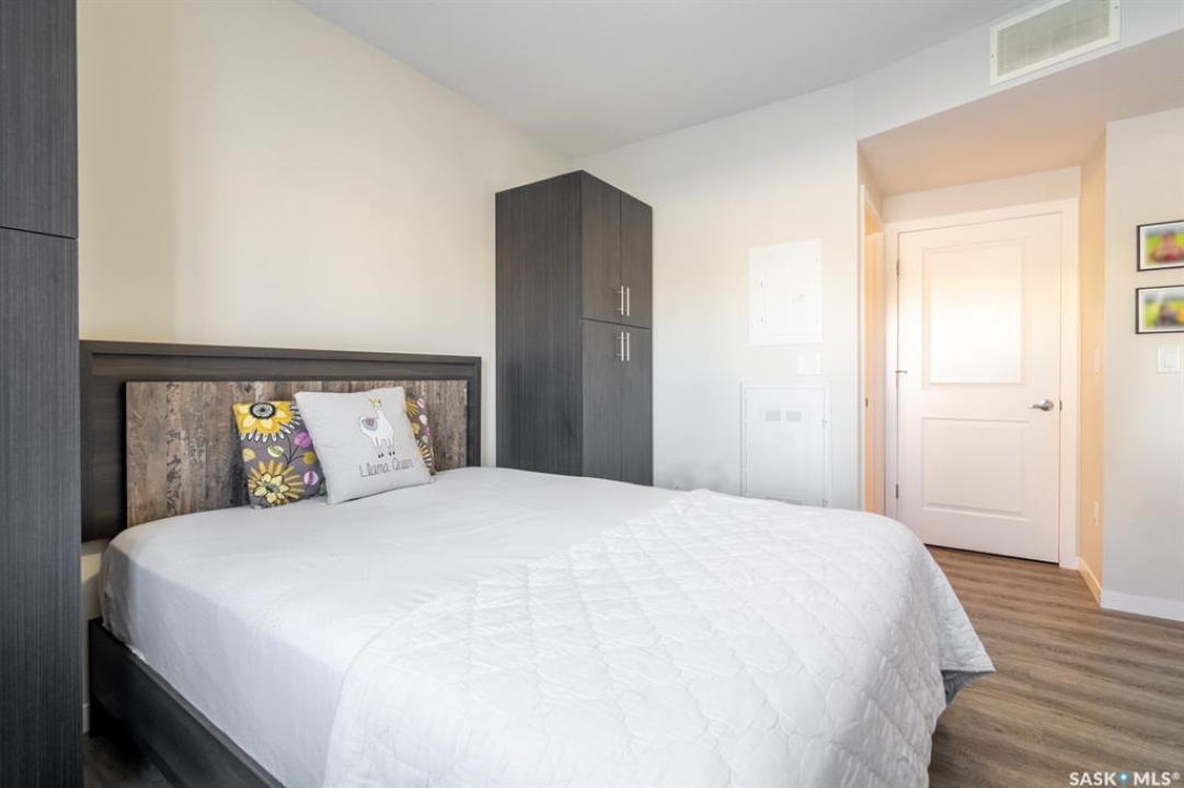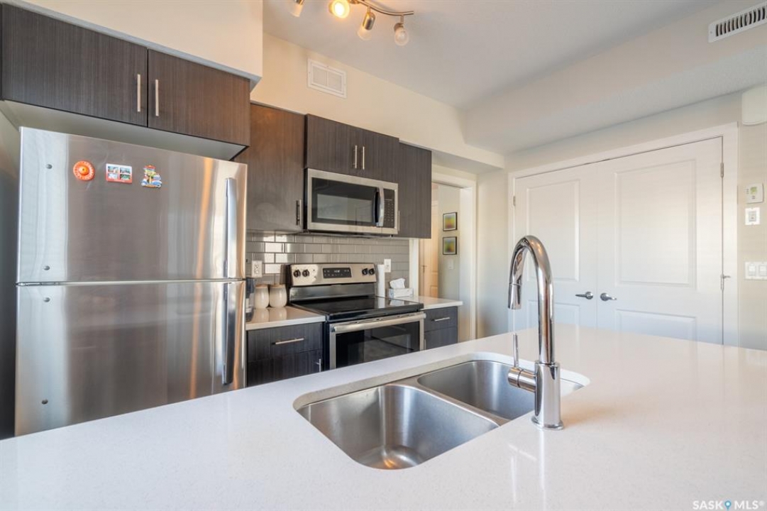 Welcome to this thoughtfully designed studio-style condo, ideally located in a prime location within the complex. Set just off the street, this main level unit offers added privacy, convenient extra parking, and pleasant views of newly built homes across the way—enhancing the peaceful setting. Step inside to a bright and inviting space filled with natural sunlight streaming through the front living room window and door. The open-concept layout seamlessly connects the comfortable living area to a modern kitchen featuring an extended eat-up island, quartz countertops, stylish tile backsplash, stainless steel appliances, and soft-close cabinetry for a refined touch. Durable vinyl plank flooring runs throughout, adding to the contemporary appeal. The thoughtfully designed bedroom area is tucked behind a pocket door for privacy. While it does not offer a window, it includes two built-in closets, easy access to the 4-piece bathroom, and an additional storage closet with in-suite laundry conveniently located nearby. This original-owner unit has been meticulously maintained with no pets and minimal wall hangings, preserving its pristine condition. Upgrades include central air conditioning, an owned alarm system, and tasteful window coverings. The outdoor parking stall is just steps from the front entrance, ensuring everyday convenience. A perfect blend of comfort, style, and affordability—this charming condo is ready to welcome its next owner. Some virtually staged photos are labeled. Don't miss this opportunity!